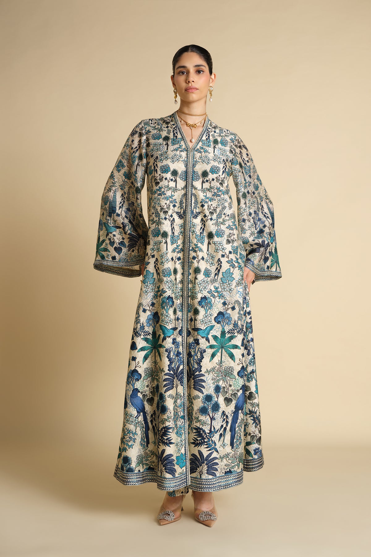 Designed in breezy silk, this jacket set features the lush fauna and flora of the forest in bird and flower motifs. Crafted in a soothing palette of beige & blue hues, it is perfect for modern celebrations.