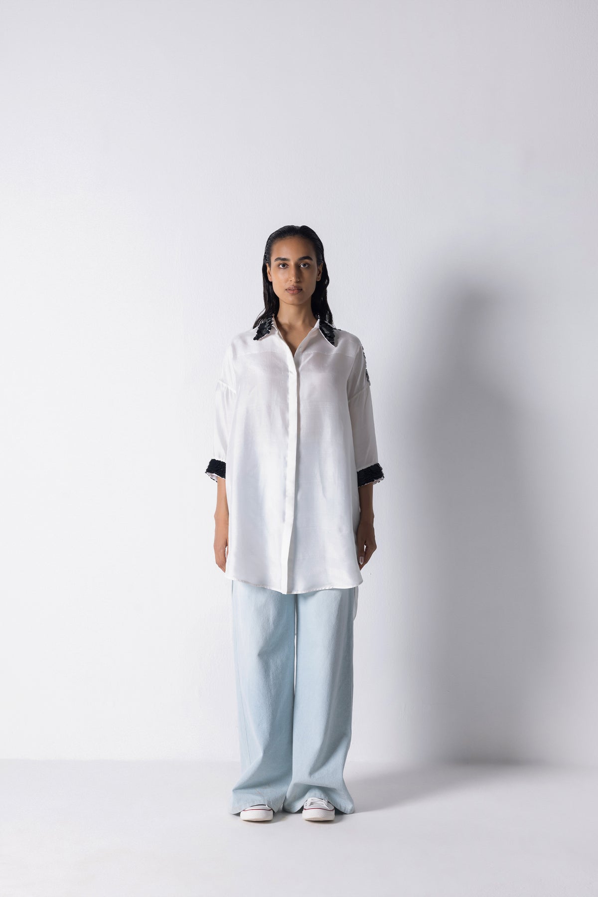 The bee shirt is an easy to wear classic detailed shirt with full embroidery on collar , shoulder back and cuffs , the shirt is mid thigh length and has 3/4th sleeves . It is a seasonless staple essential for your wardrobe