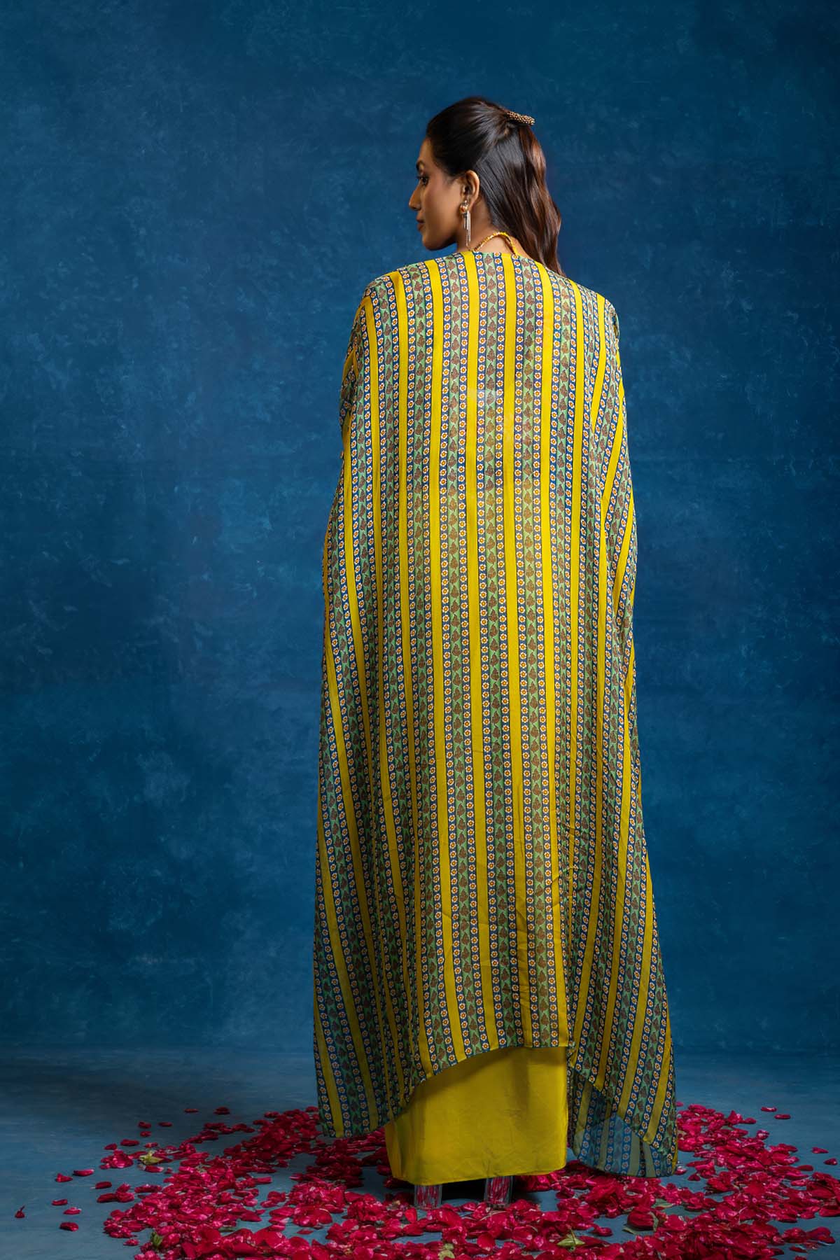 Yellow Aarani embellished v-neck bustier and drape skirt in crepe, paired with long cape in organza.