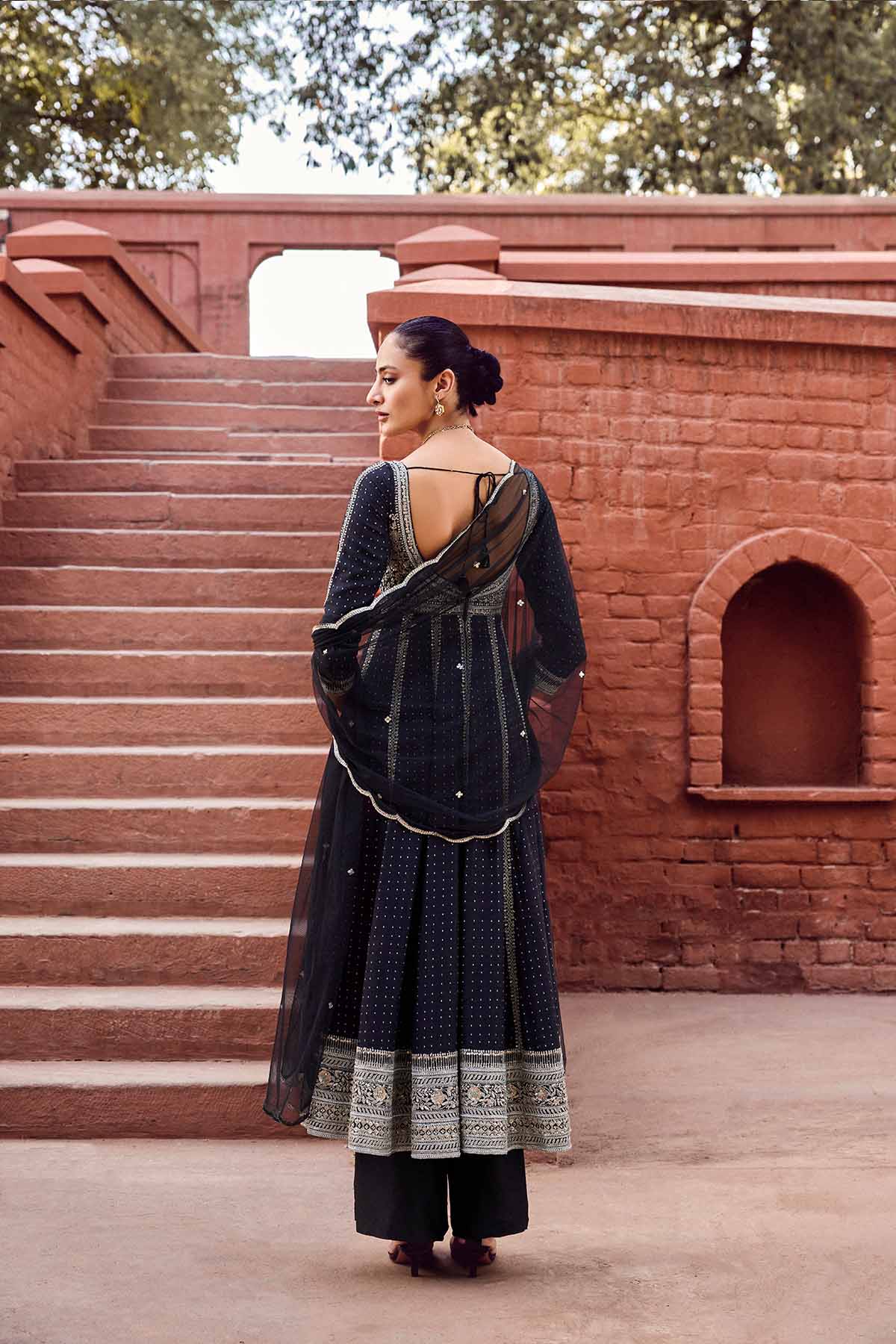 Striking & elegantly crafted for the modern woman, our Afruza Anarkali Set is perfect for eventide celebrations. Made in luxurious silk & tulle, this ensemble features cord embroidery, French knots & sequins.