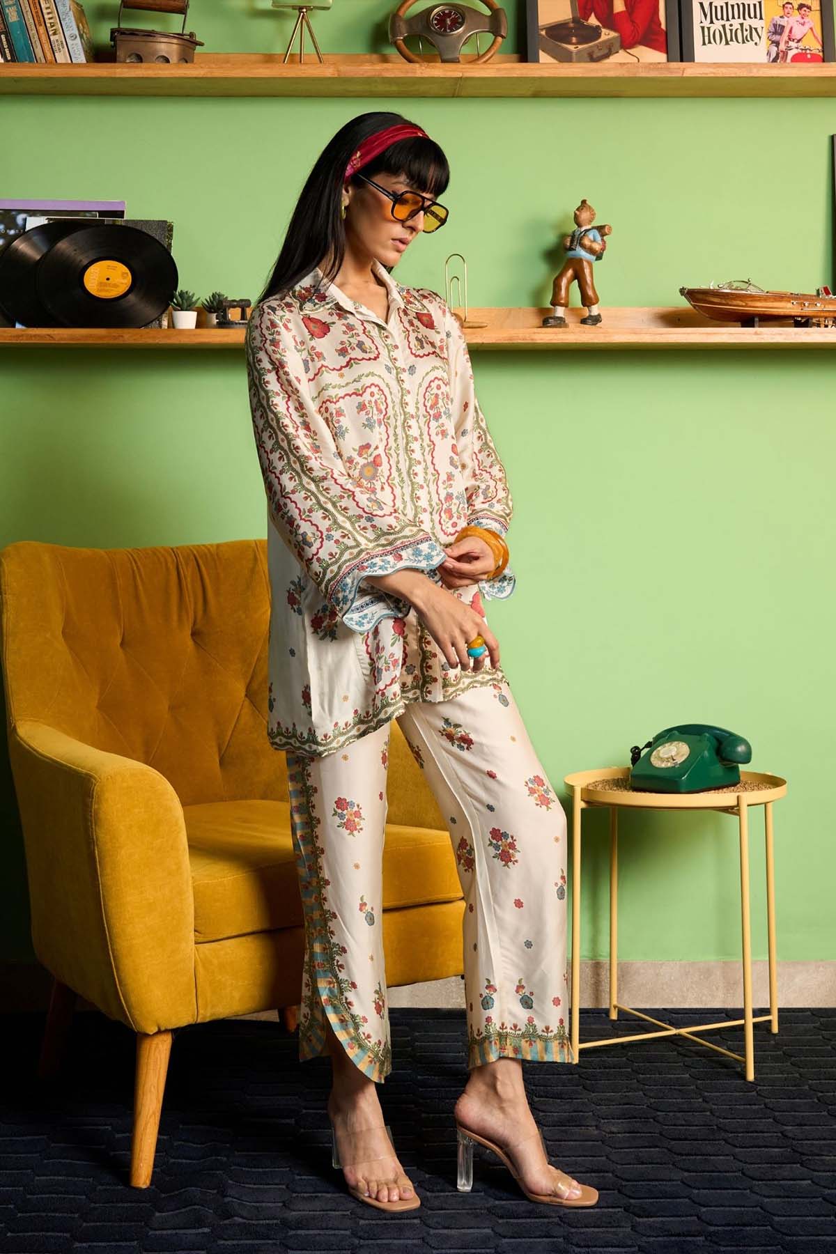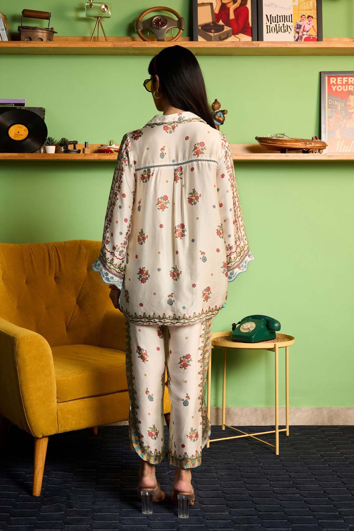 A printed shirt-and-pant set crafted in fluid cupro satin with a soft sheen. The Akhzari silhouette is relaxed and easy, allowing the fabric to fall naturally while maintaining a polished look. The champagne base keeps the print versatile, making it suitable for festive lunches, wedding gatherings, and dressed-up evenings.