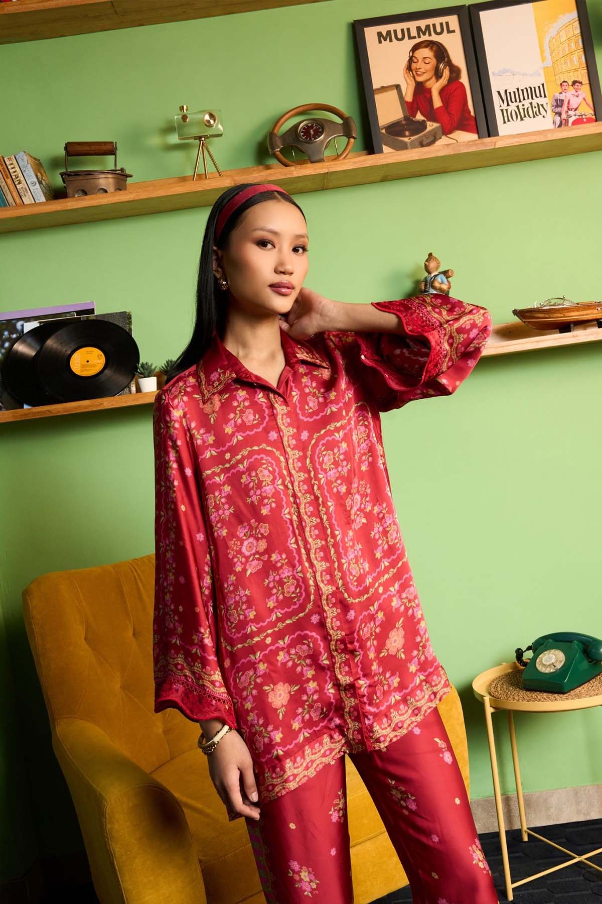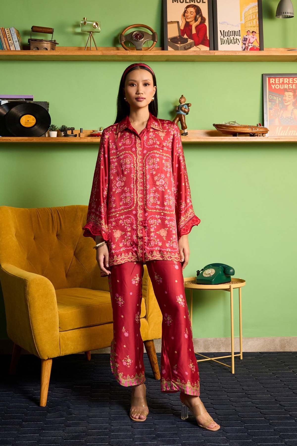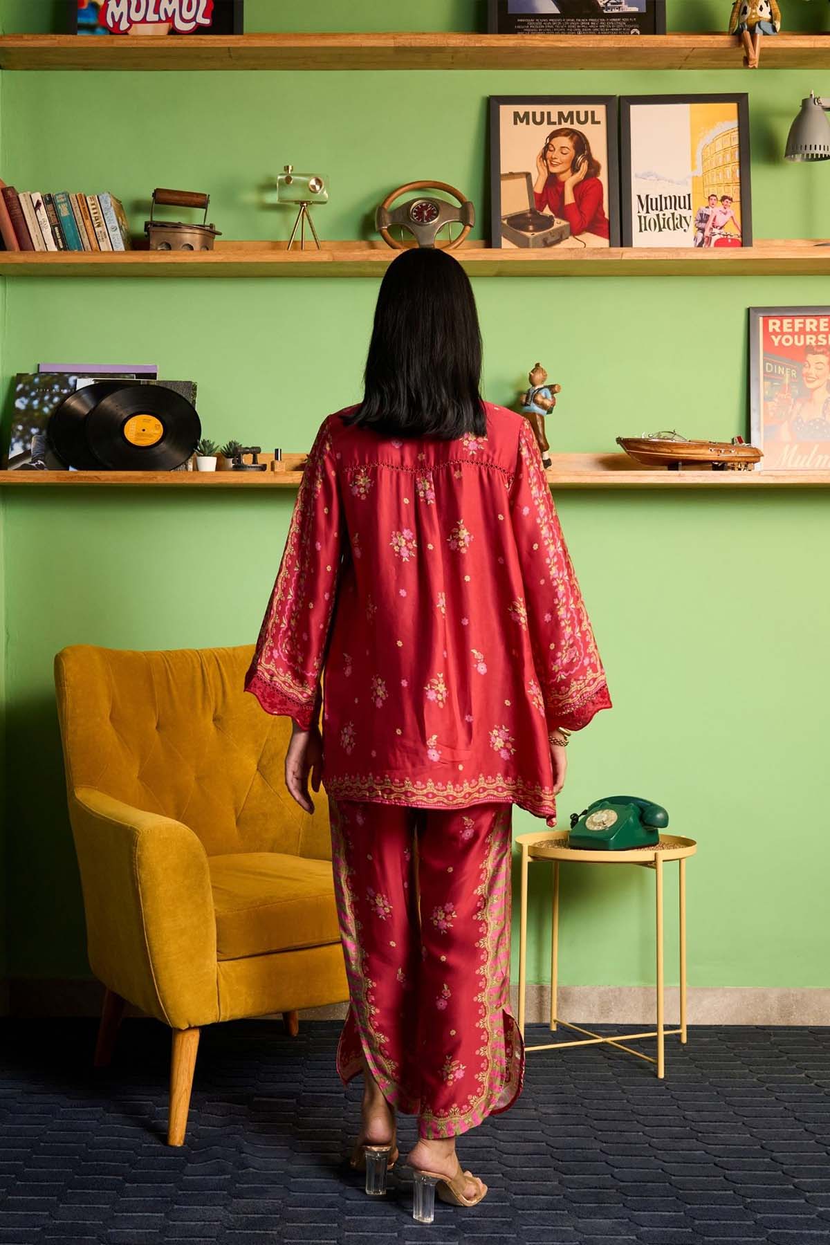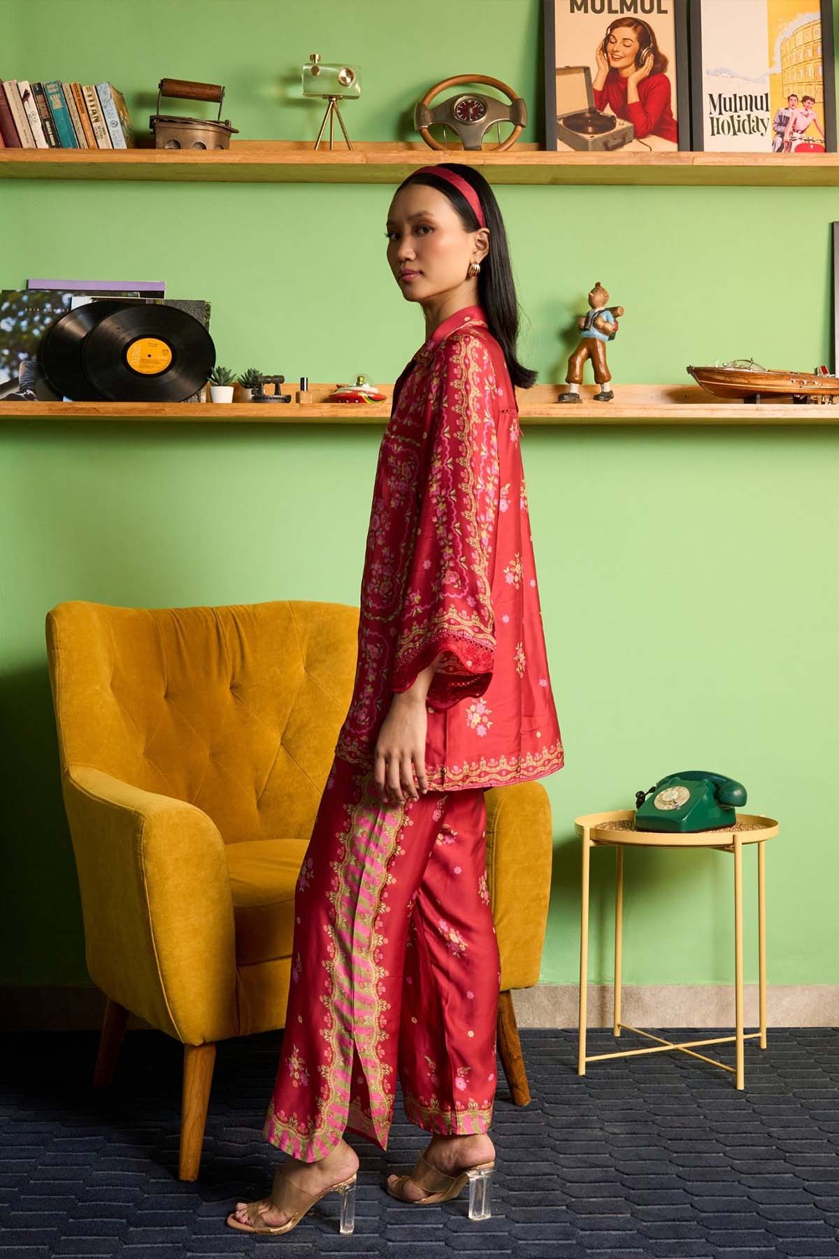This Akhzari set features a deep red print on smooth cupro satin, offering richness without heaviness. Designed for movement and comfort, the silhouette works well for long wedding days and evening celebrations. The set can be worn together or styled separately, making it a versatile festive staple.