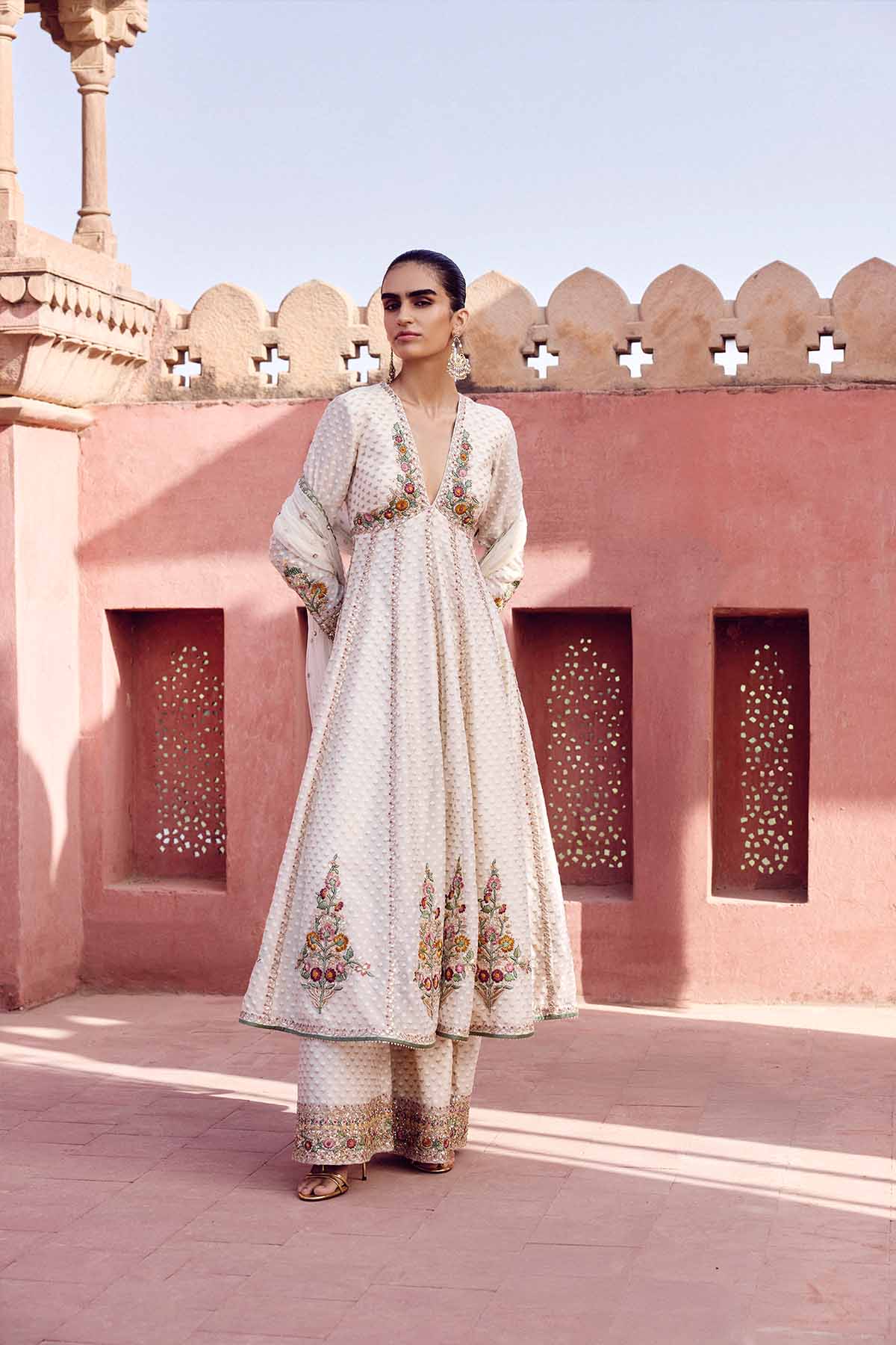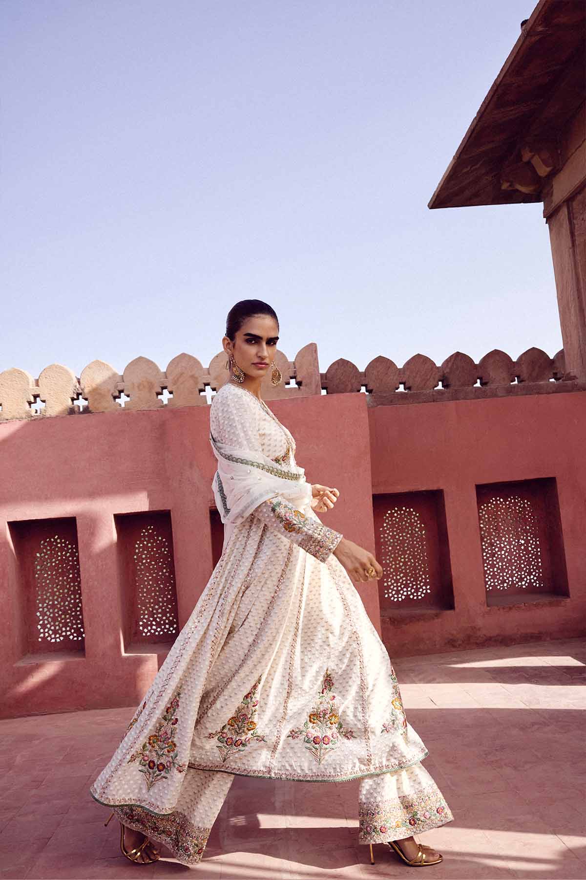 A timeless suit set featuring blooms of nature, our akshi anarkali set is perfect for celebrations. Featuring our signature gota patti craft with resham, zardozi, threadwork & sequins, this ensemble is crafted in handwoven benarasi cotton & tulle.