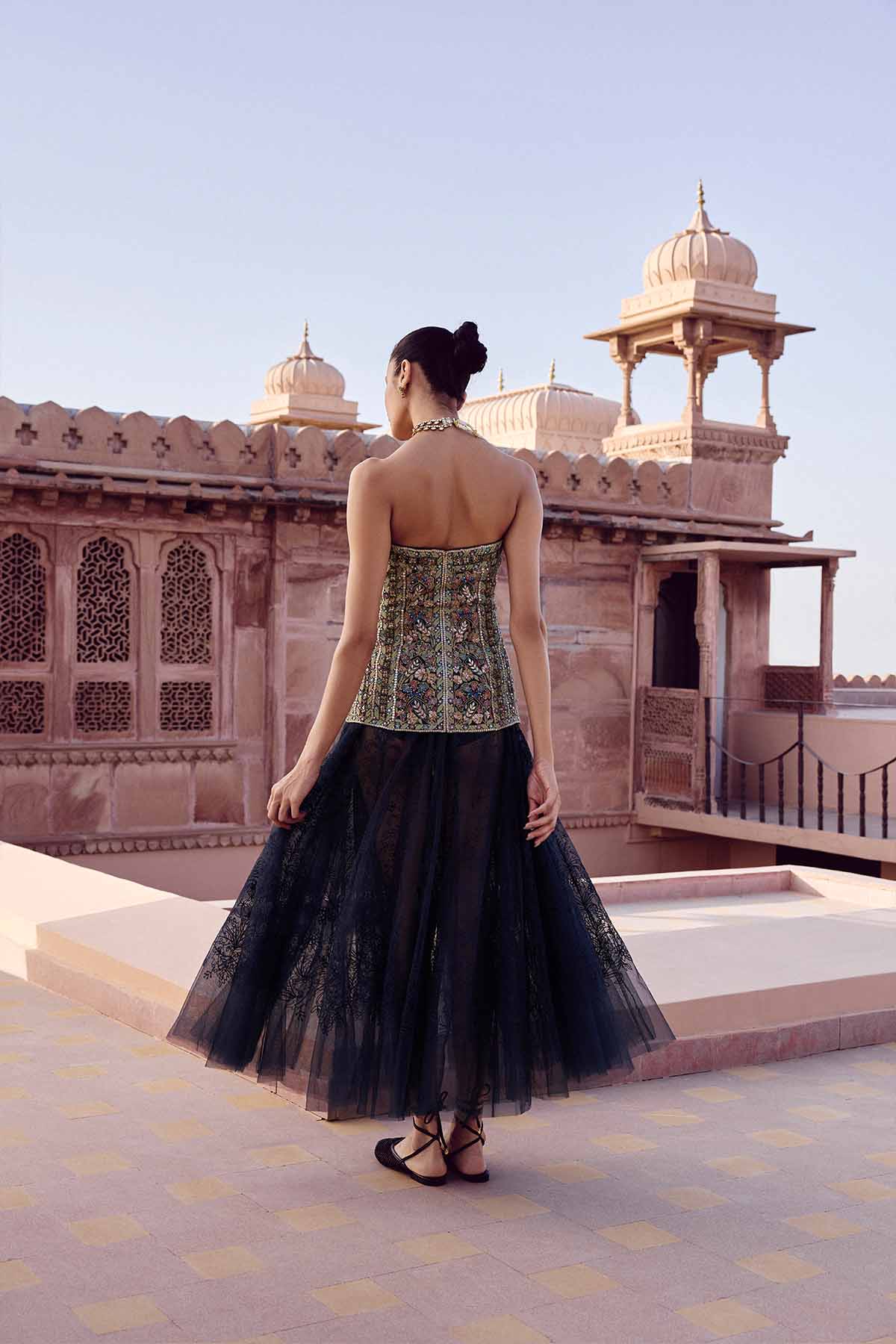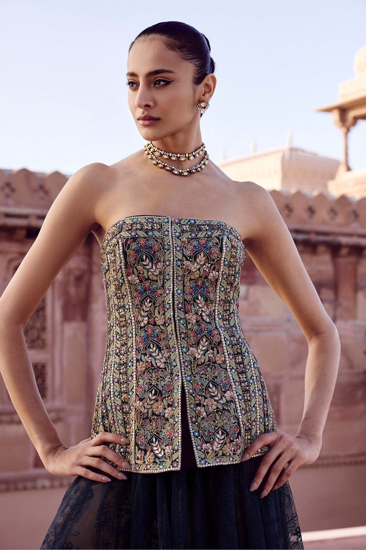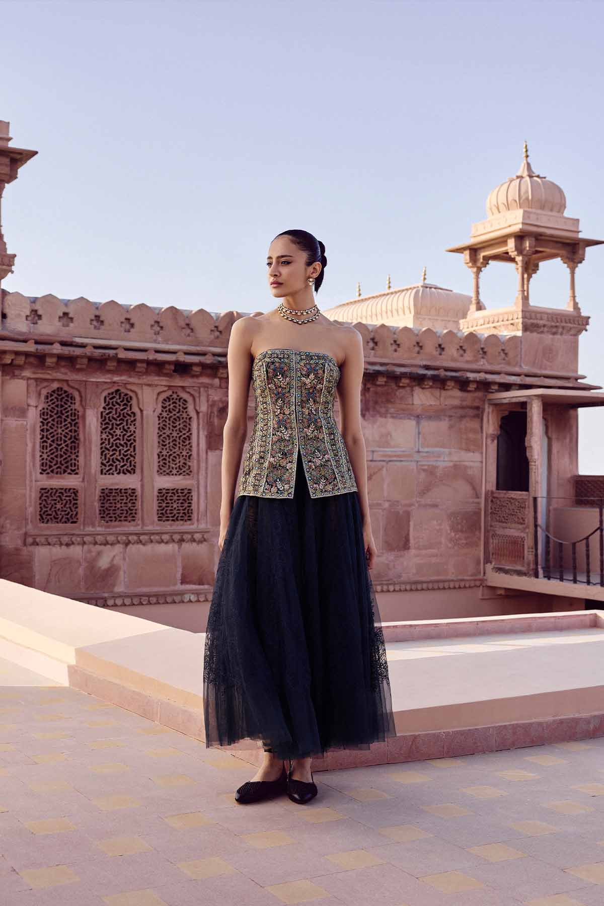 Inspired by heirloom pieces and crafted with the contemporary aesthetic of the modern woman, our alesha skirt set is perfect for soirees. Created in luxurious silk & tulle, it features nature-inspired motifs in zardozi, threadwork & sequins