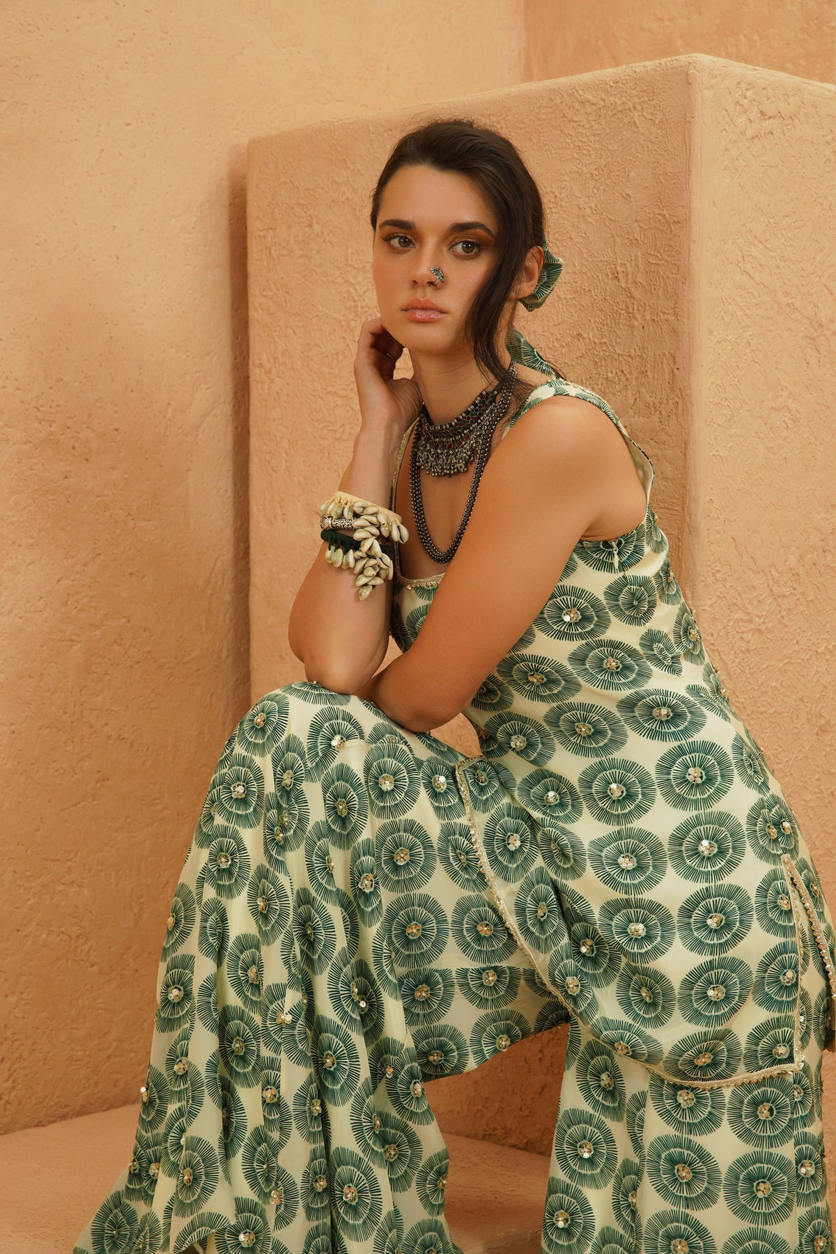 A sleeveless printed kurta adorned with delicate embellishments enhancing the print and the neckline, paired with matching sharara pants. The ensemble features a striking protea motif print, blending traditional craftsmanship with modern elegance.