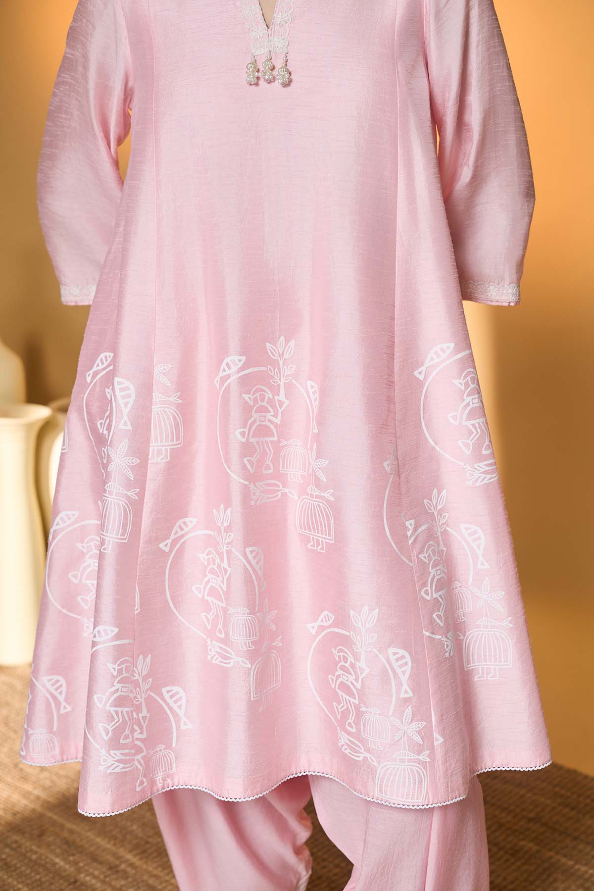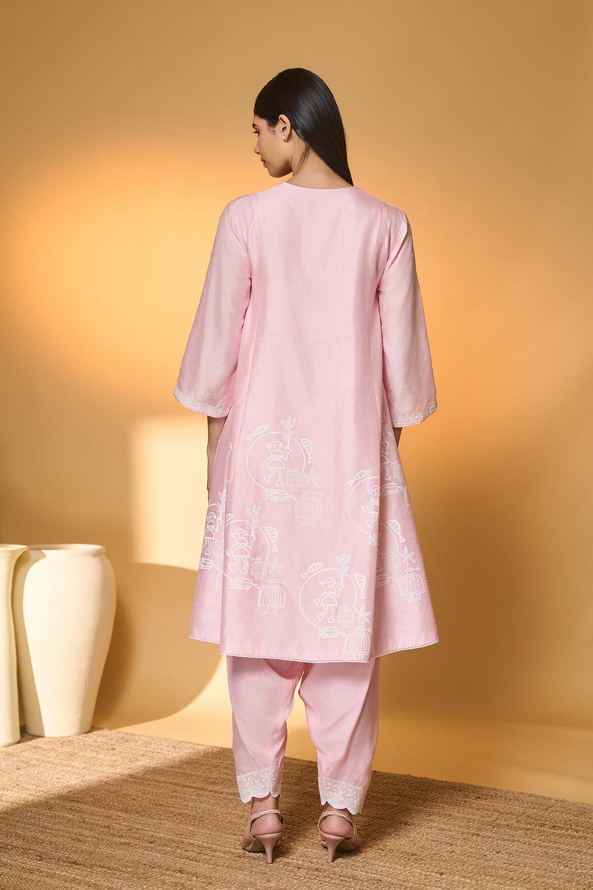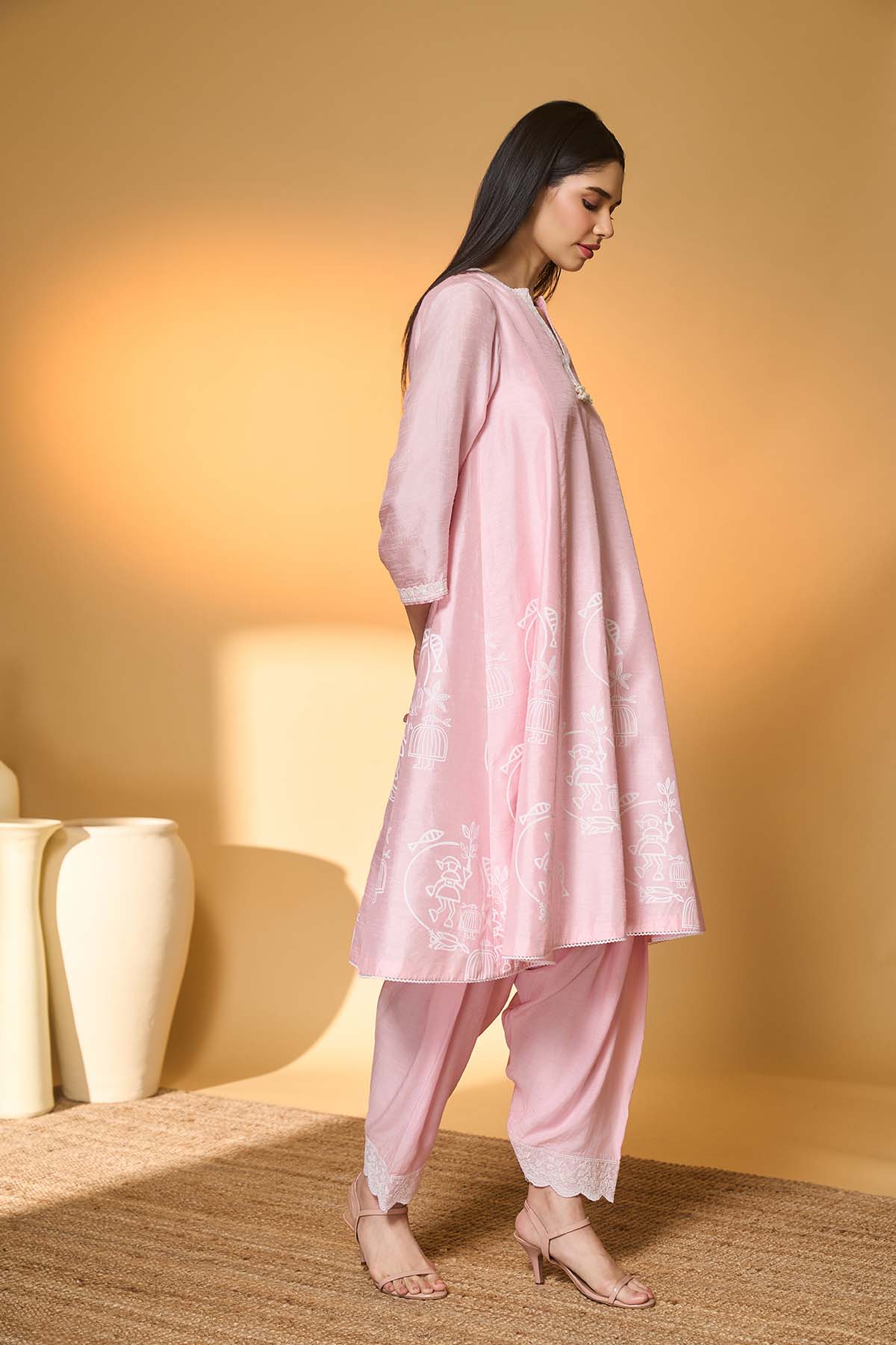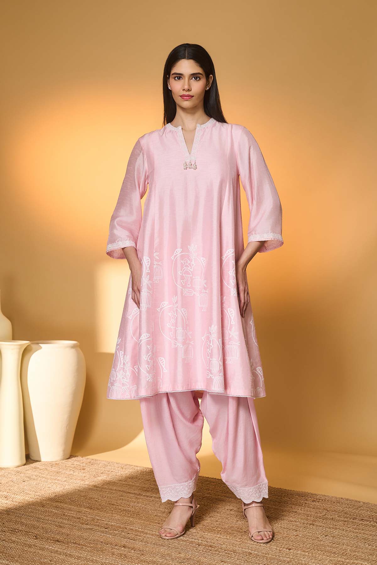 Kurta- a line kurta | adorned with crochet lace on neckline and hem | placement print "Blushing bloom" towards the hem. Pant- salwar pant | adorned with corchet lace on hem | elastic belt
