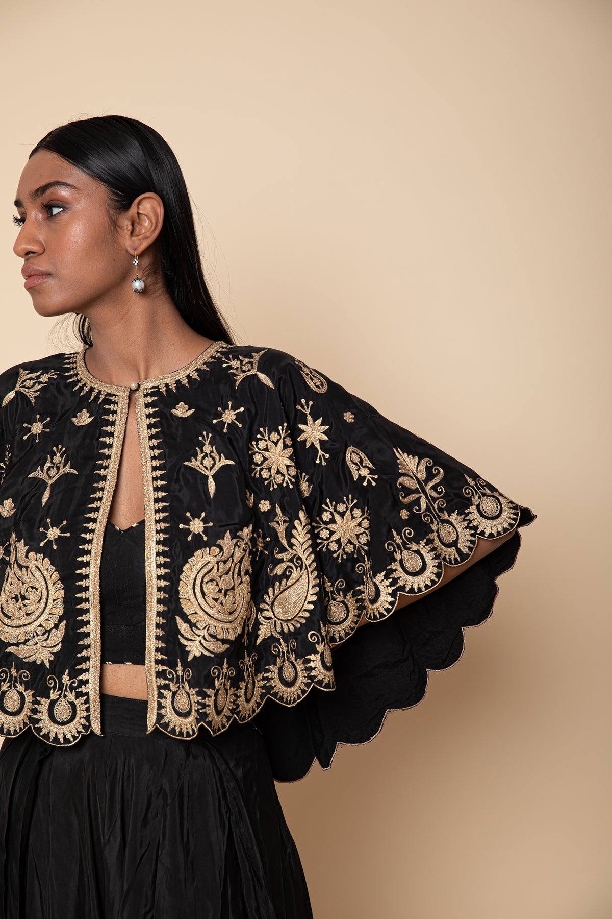 Aari and dori embroidered habutai cape paired with pleated free fall pants and a habutai bustier with adjustable straps
