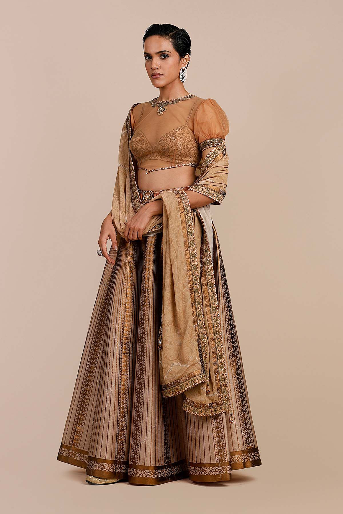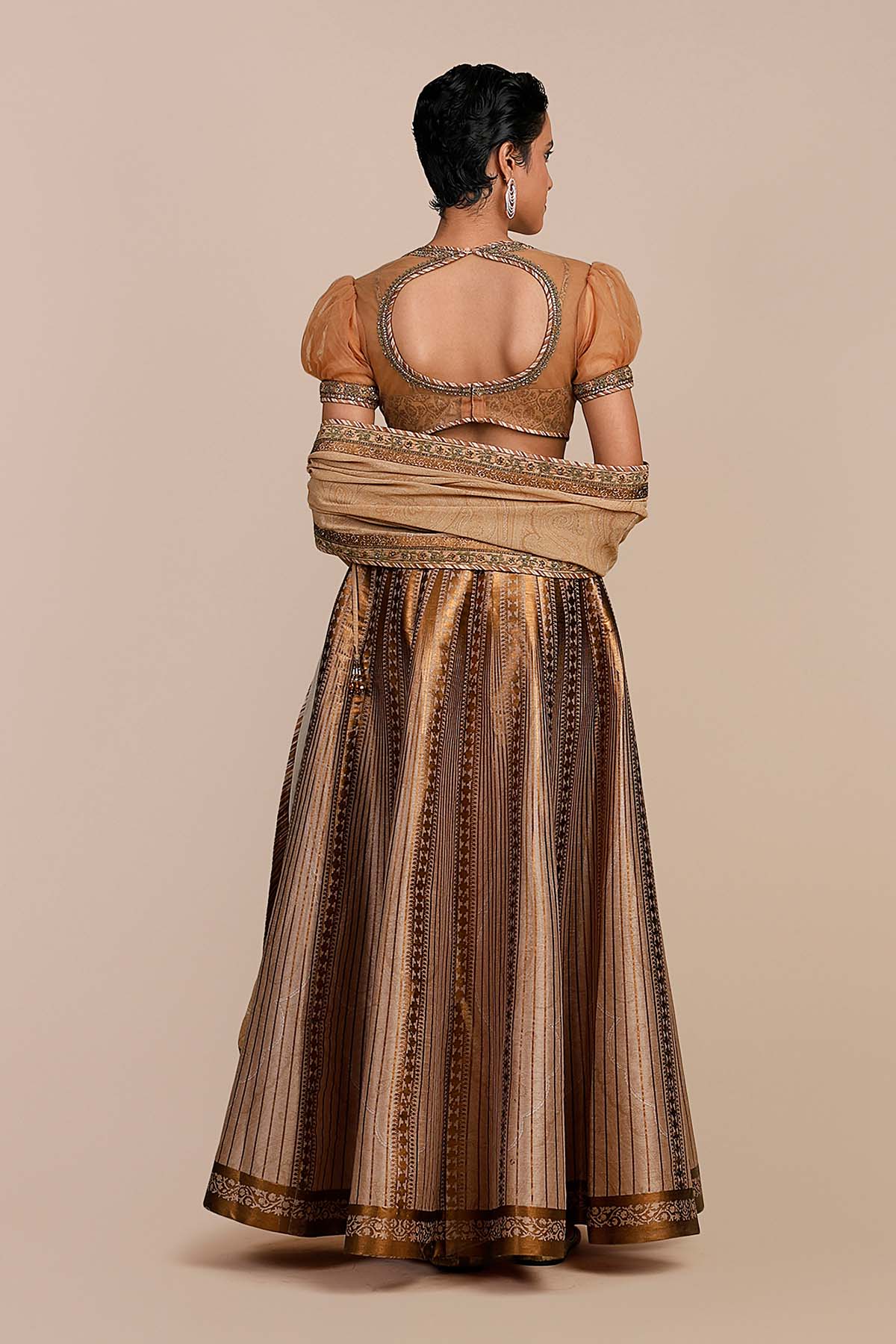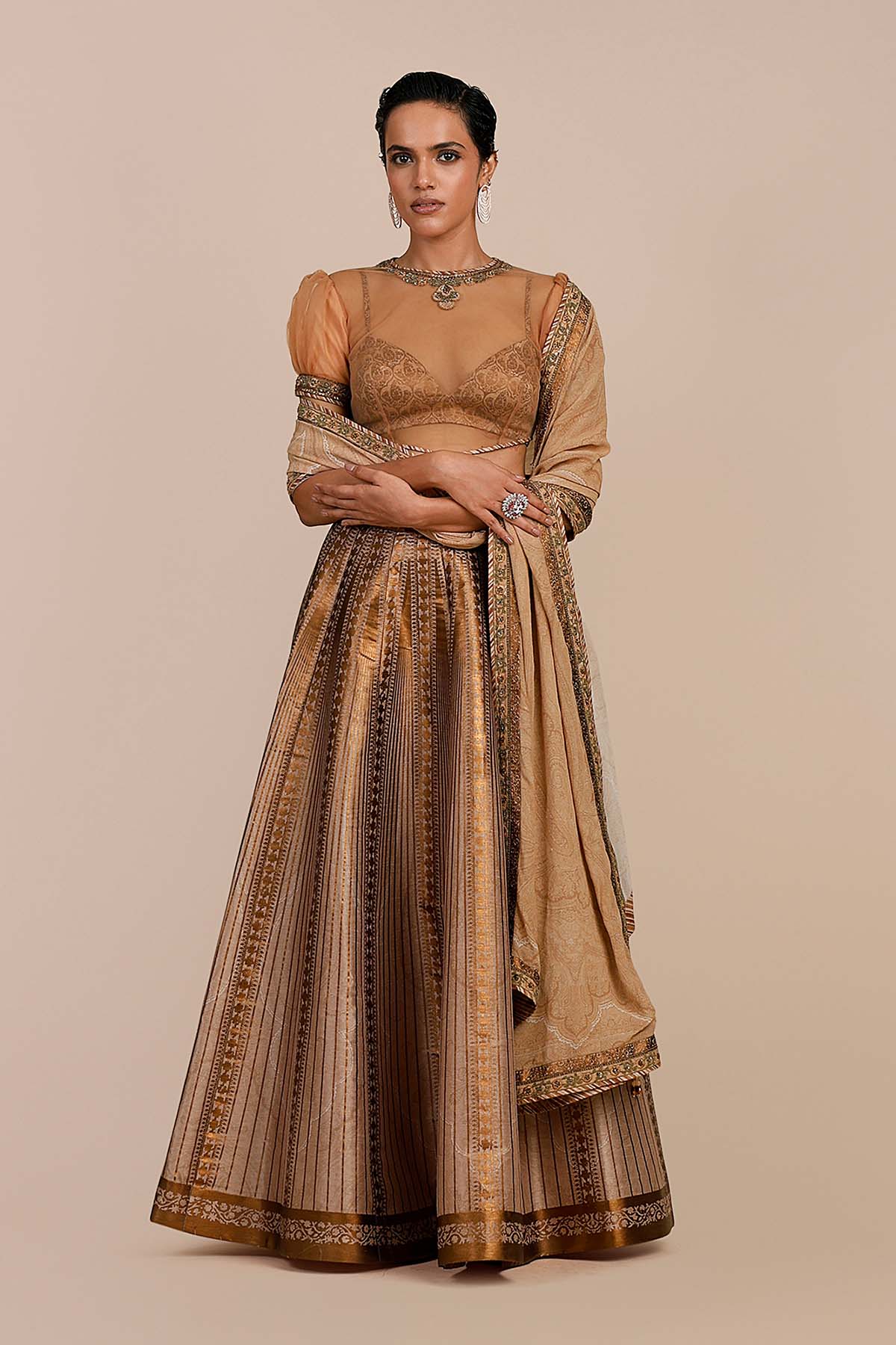 The sheer georgette stole features a jamawar print enhanced with copper foiling detailing.The border is adorned copper foil detailing and finished with an embroidered border with stripe piping and beaded tassels details.