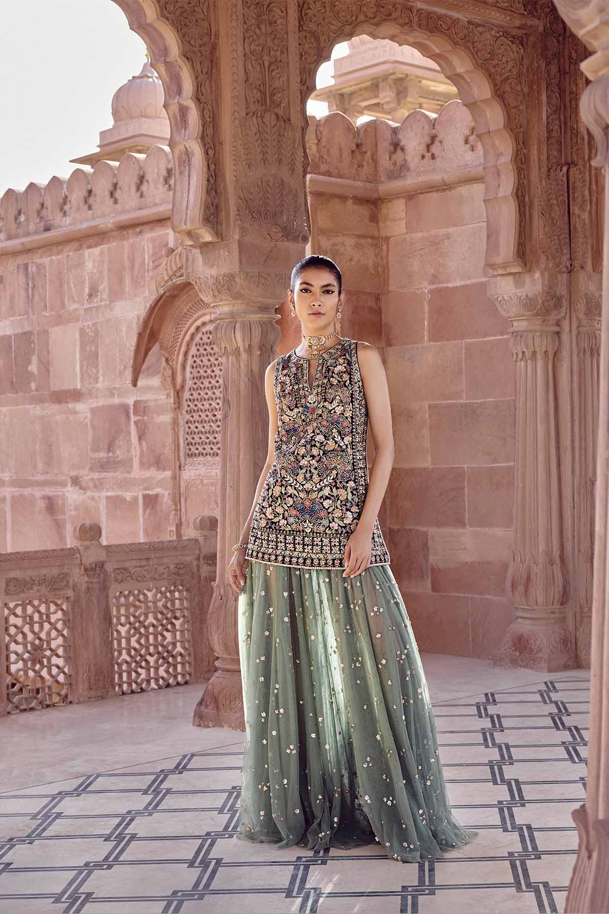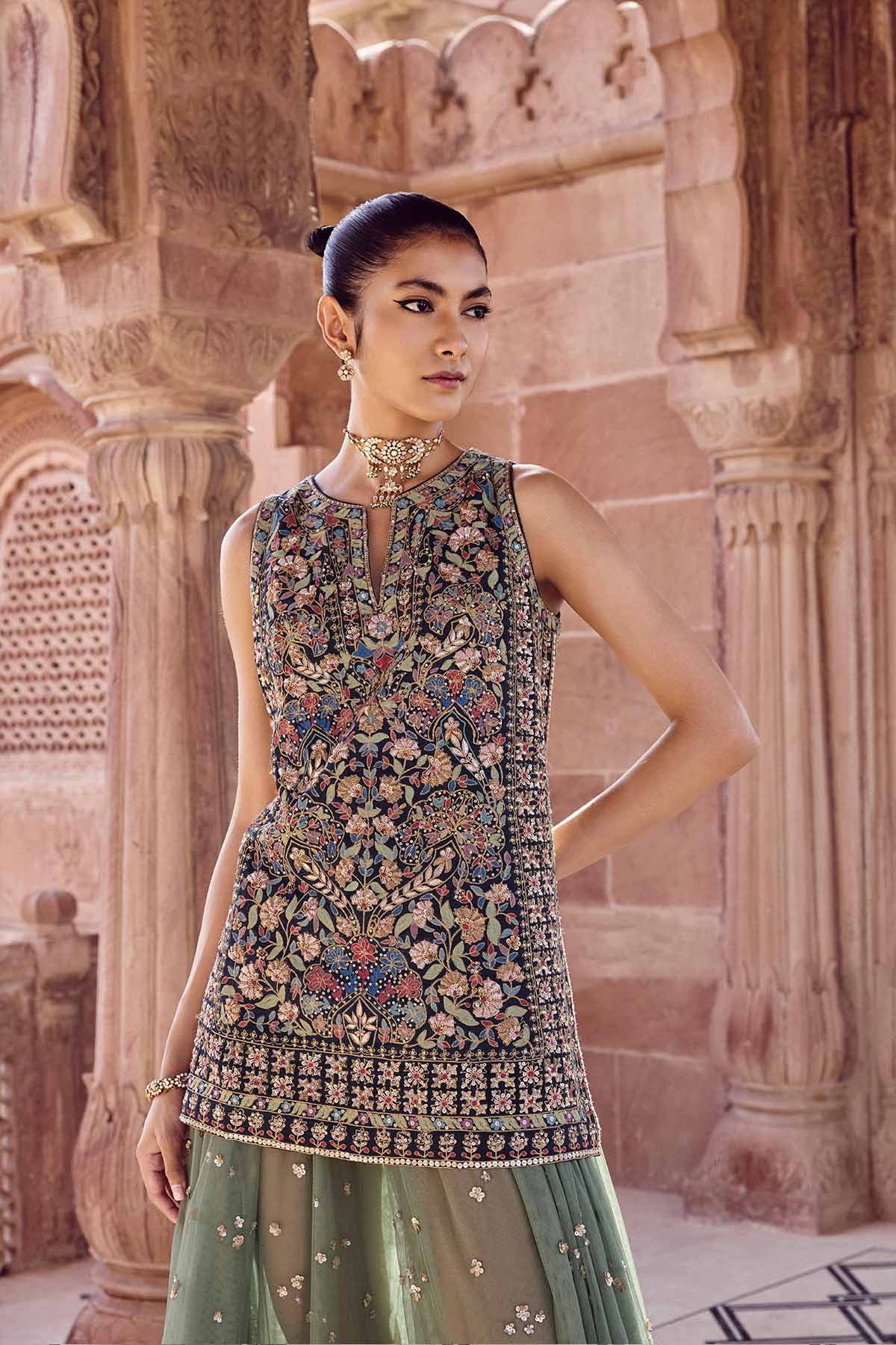Inspired by the blooming flora of the forest, our floresta skirt set features handcrafted motifs. This contemporary ensemble is elevated in zardozi, threadwork, sequins and comes with a top crafted in luxurious silk.