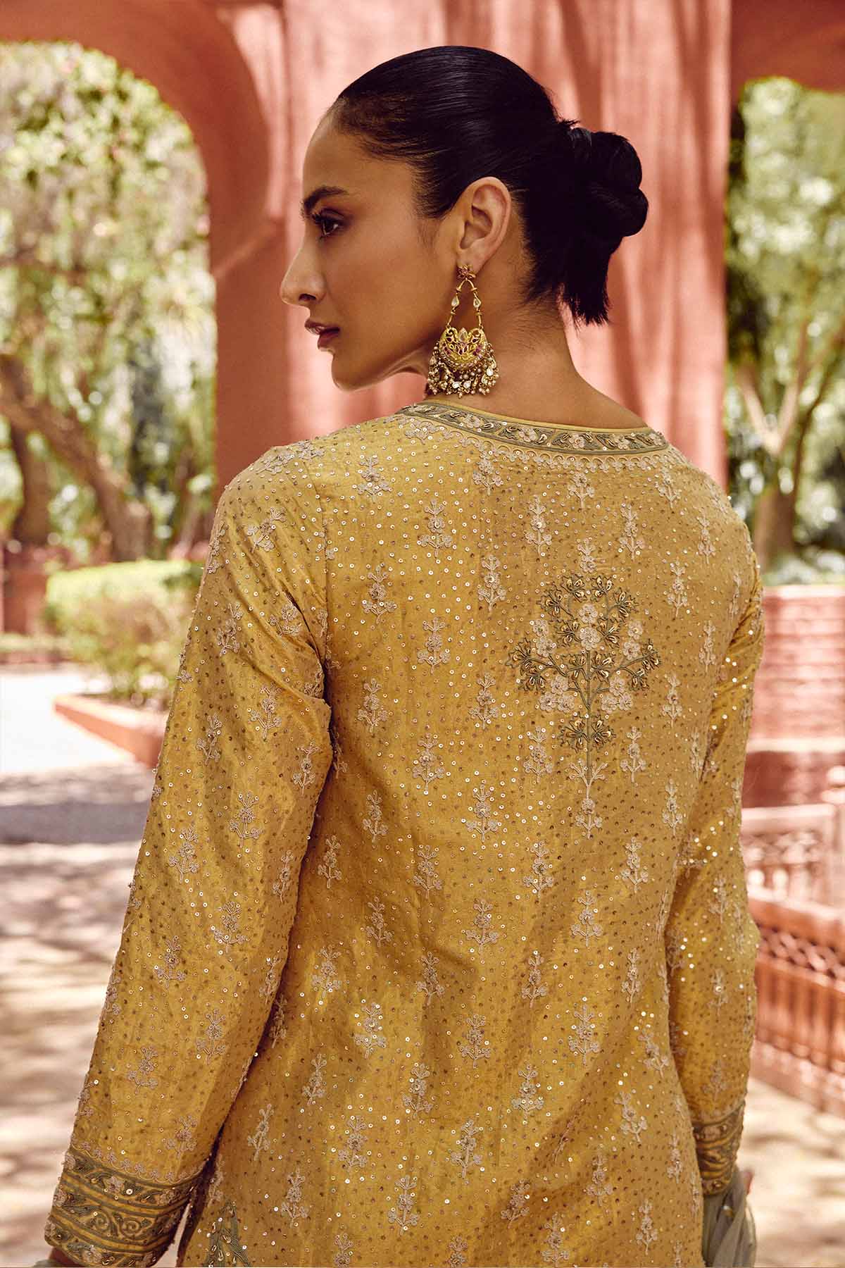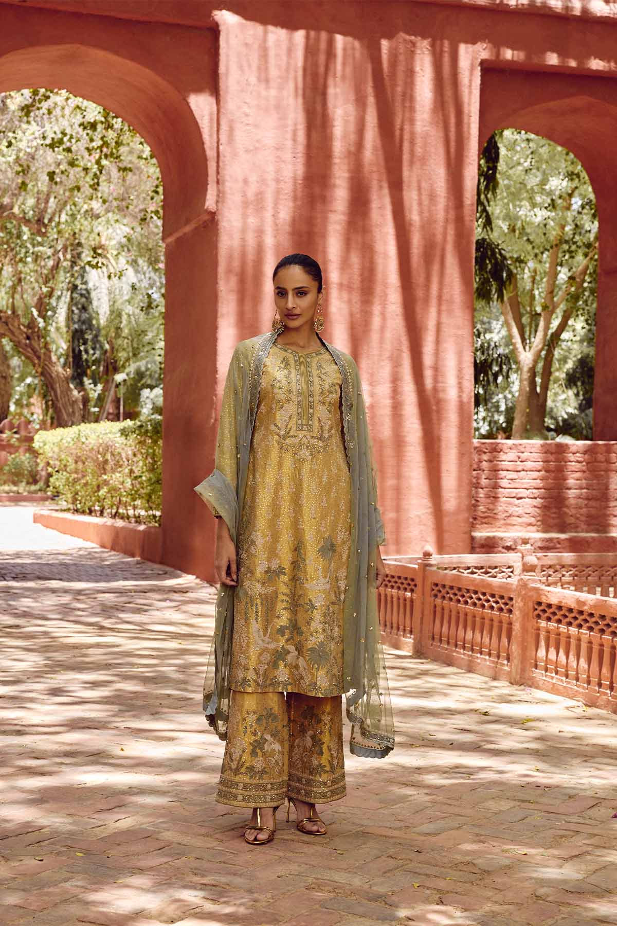 Sights from the tropics are brought to life in our ikshita suit set. Featuring resplendent flamingos in flight and blooming flowers of the forest in cord embroidery, zardozi & sequins, this suit set is crafted in silk & tulle for glamorous celebrations.