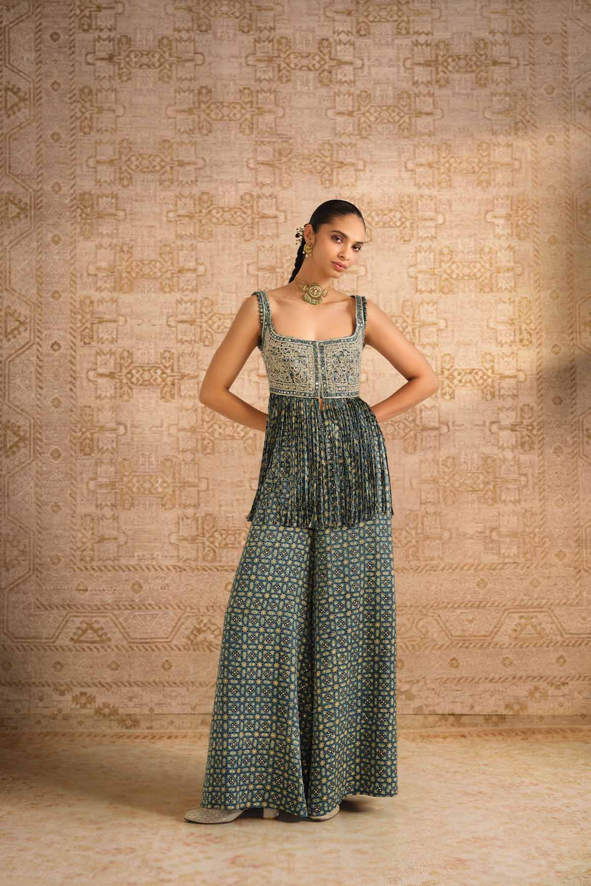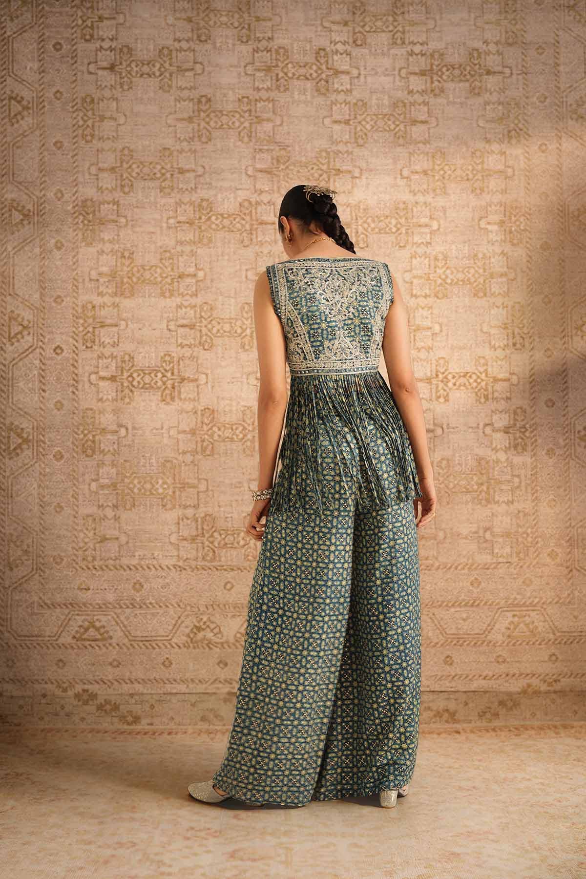 Our isana palazzo set is a modern ode to the meticulous craft of hand-block printed ajrakh, featuring a dramatic fringe detail. Crafted by the indigenous communities of gujarat, this craft involves an intensive sixteen-step process of washing, dyeing, printing, and drying. Created using intricate hand-block prints & eco-friendly dyes, it is an ancient craft passed down from generations. Made from silk, this ensemble is elevated in mirror, threadwork, beads & sequins