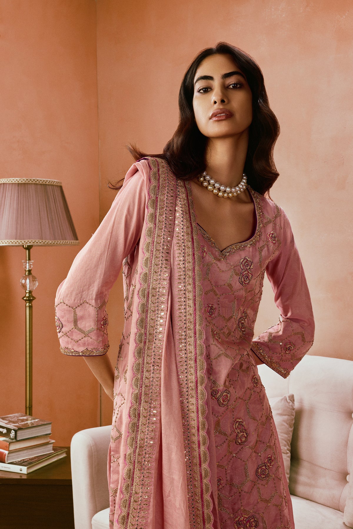 Our dusky pink sharara set beautifully embroidered with rose motifs paired with sharara and scalloped dupatta.