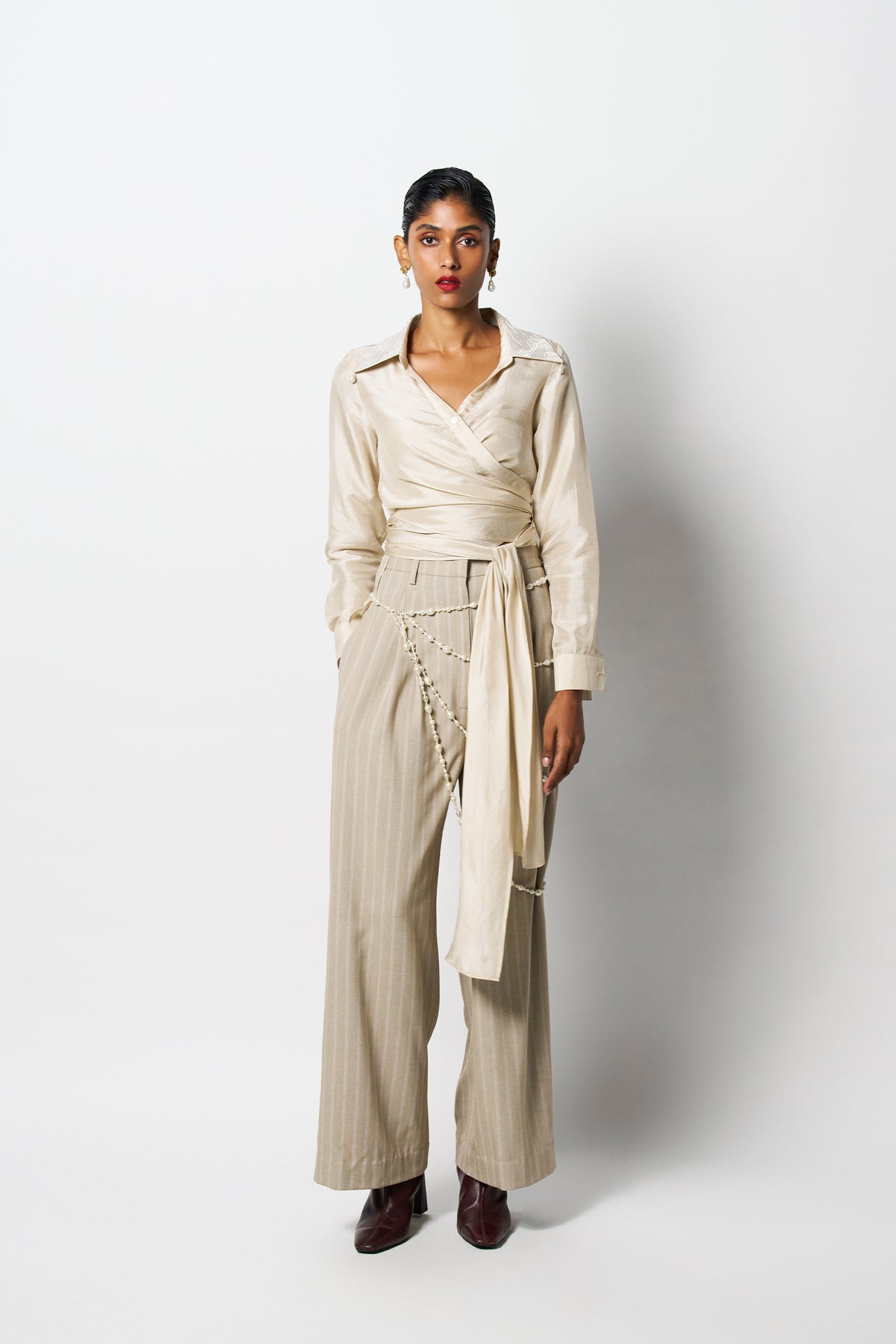 The lee kim shirt is a versatile, all-season favorite with a flattering wrap-around design that ties at the front or side. It features a tone-on-tone embroidered collar. Perfect paired with jeans, it can also be dressed up with a lehenga or skirt for a more elevated look.
