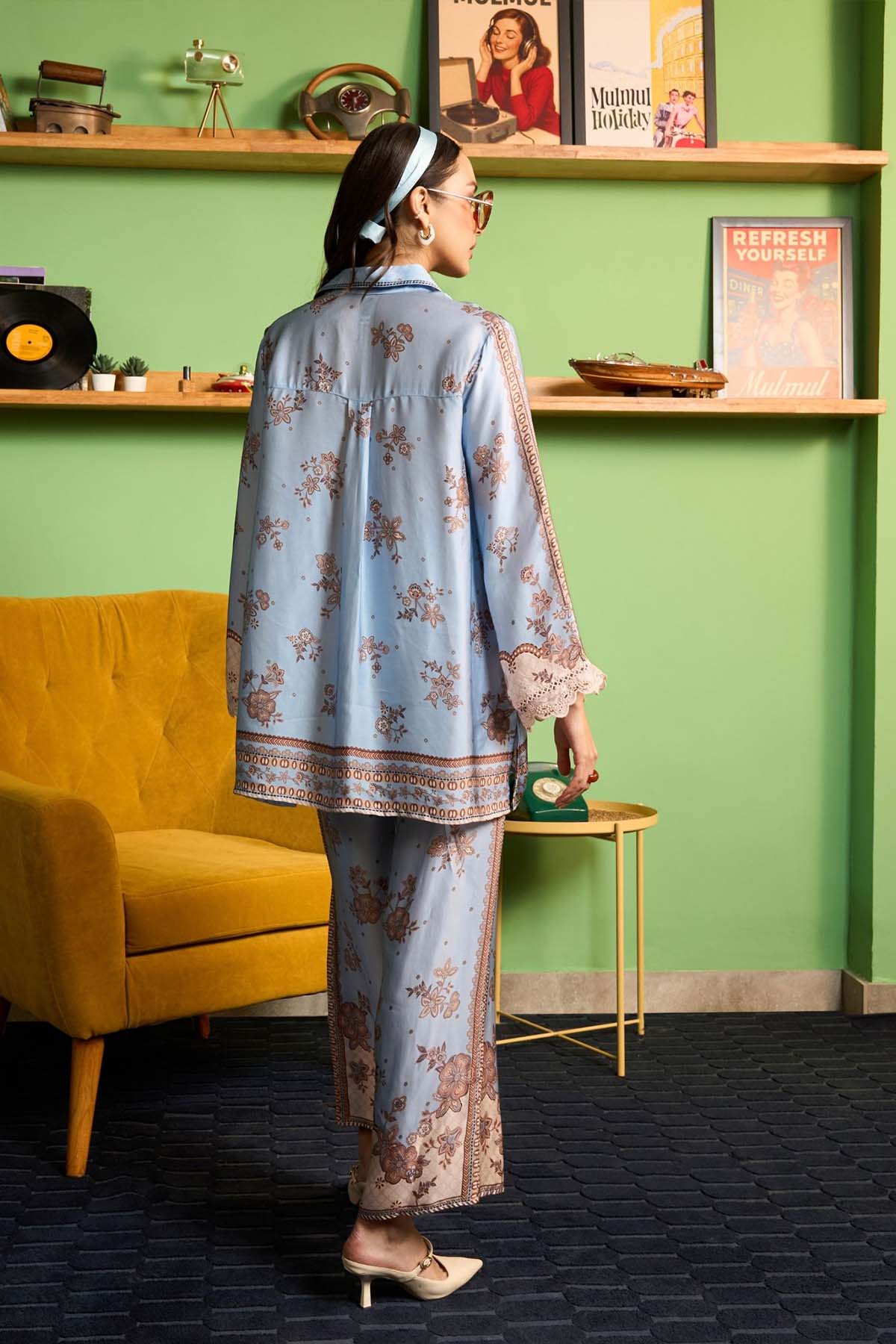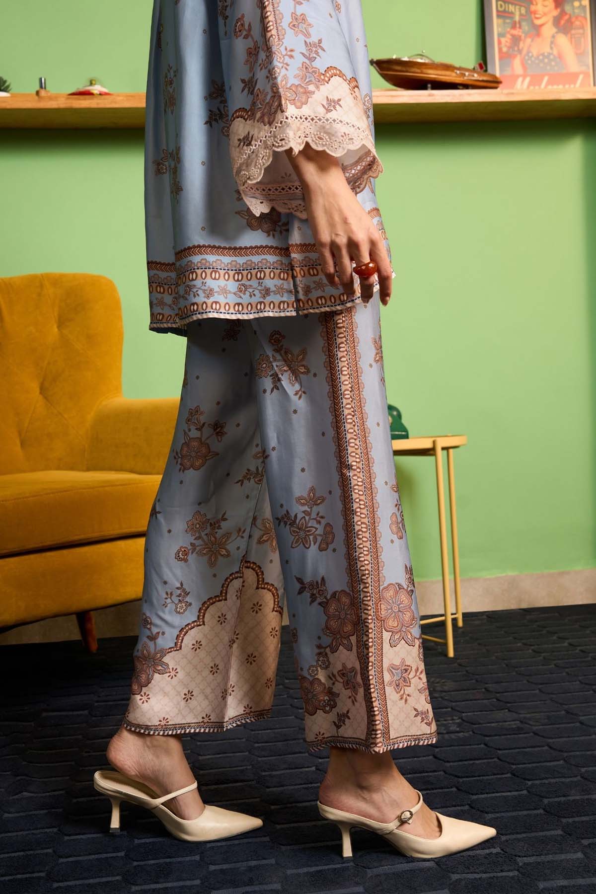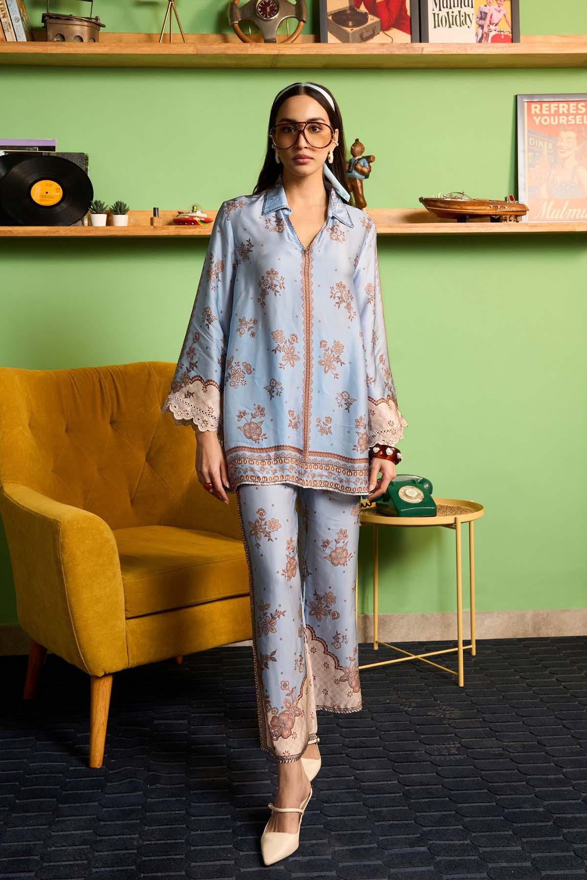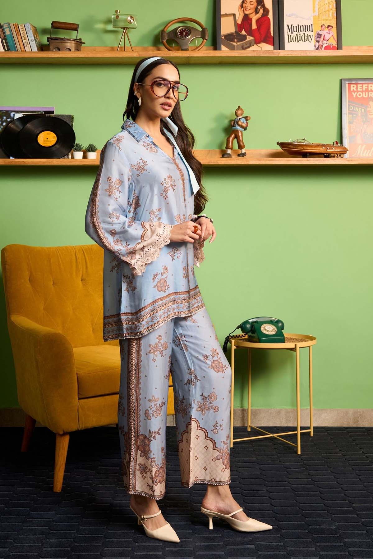 This mehrang set features a soft blue print on breathable cupro satin, offering ease without sacrificing finish. Designed for long wear, the silhouette allows free movement while looking put-together. A versatile option for festive evenings, and coordinated dressing.