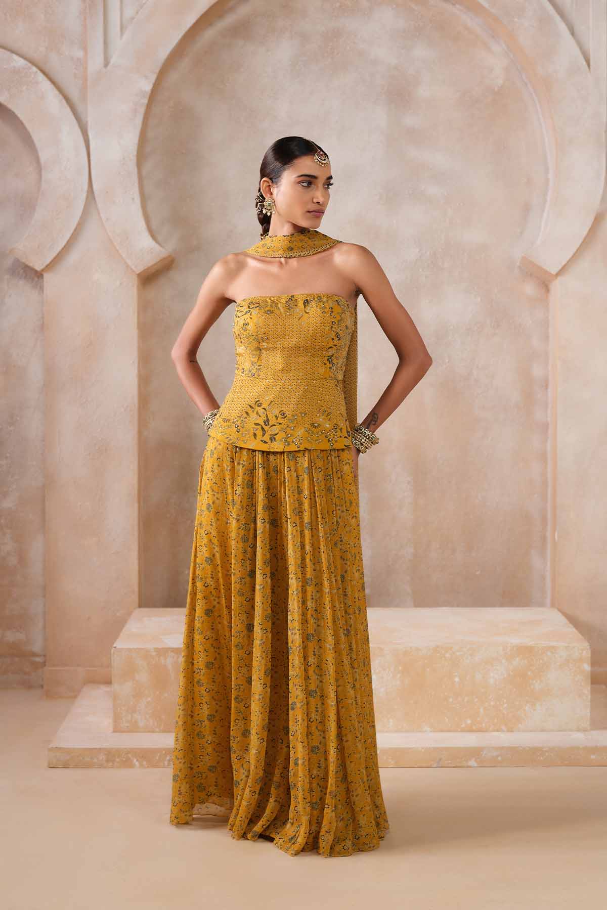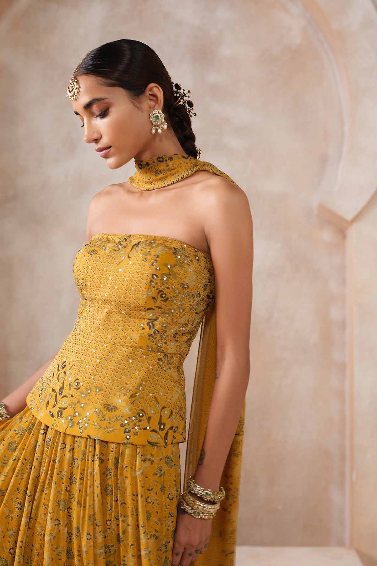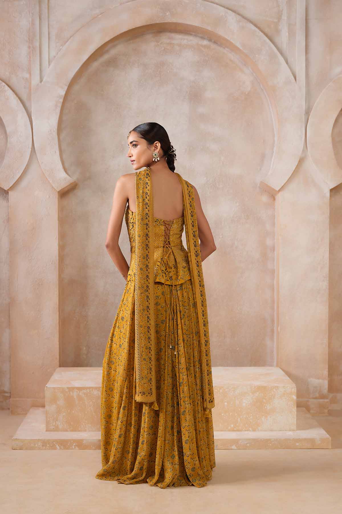 Nature-inspired and featuring a vibrant yellow hue, melidora in chiffon exudes easy elegance. Featuring motifs of blooms & ferns, this skirt set is perfect for daytime.