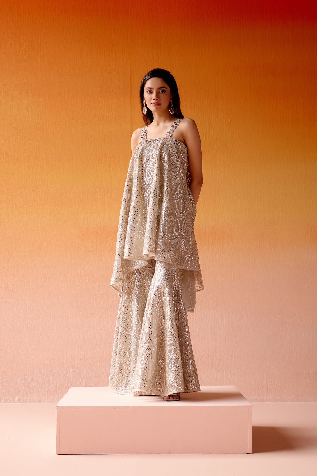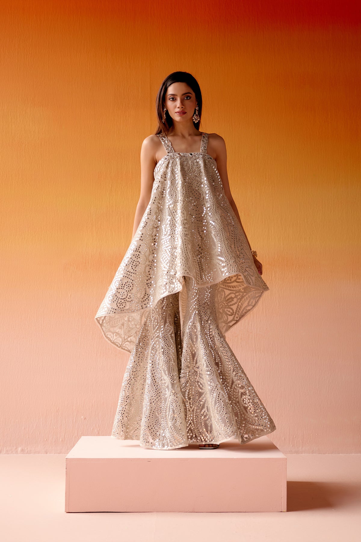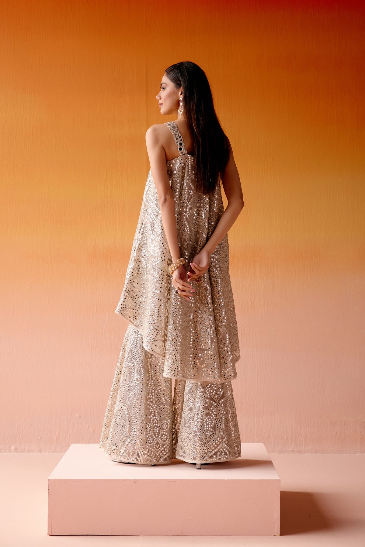 Mirrorwork one-shoulder strap cape. Adorned with intricate mirror detailing, the one-shoulder design and draped cape create a captivating silhouette. The cape comes with detachable straps that can be used style the cape in many different ways, ranging from an off-shoulder top to an one-shoulder top too.