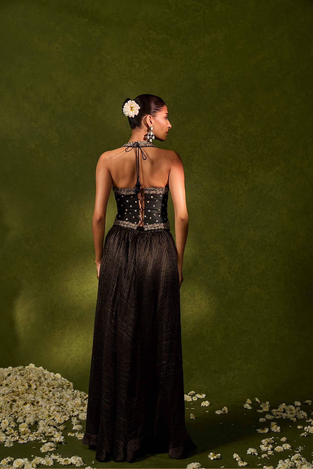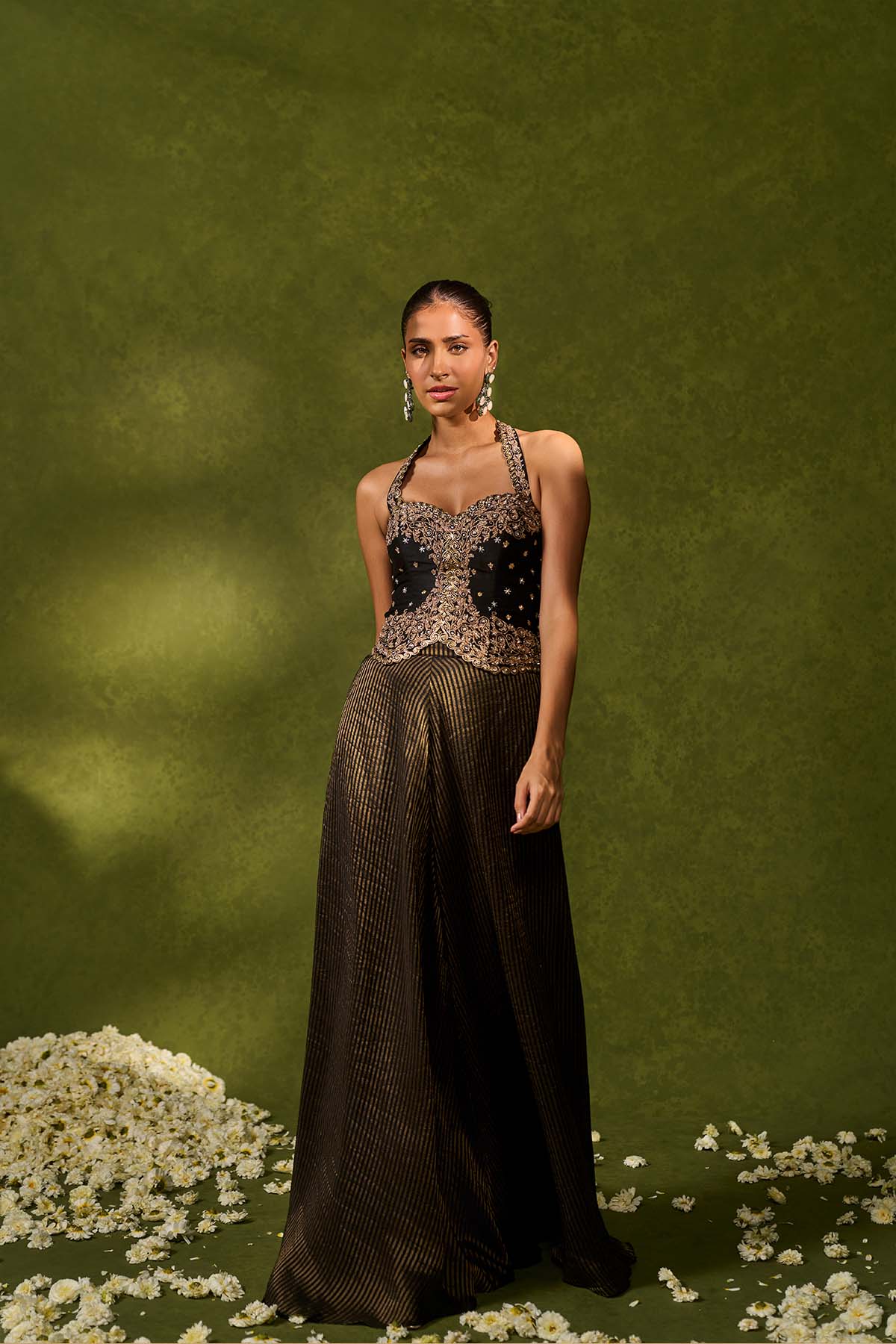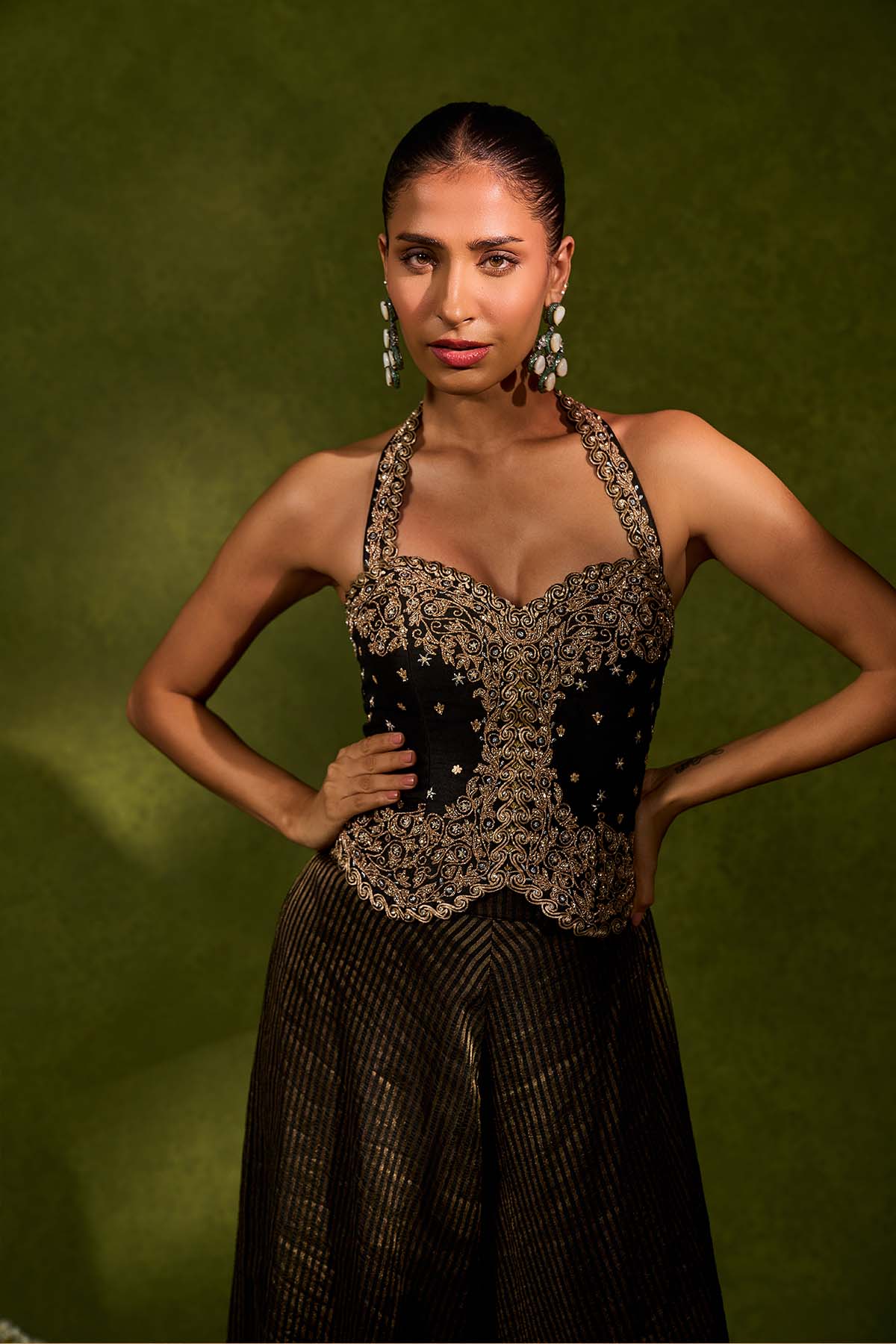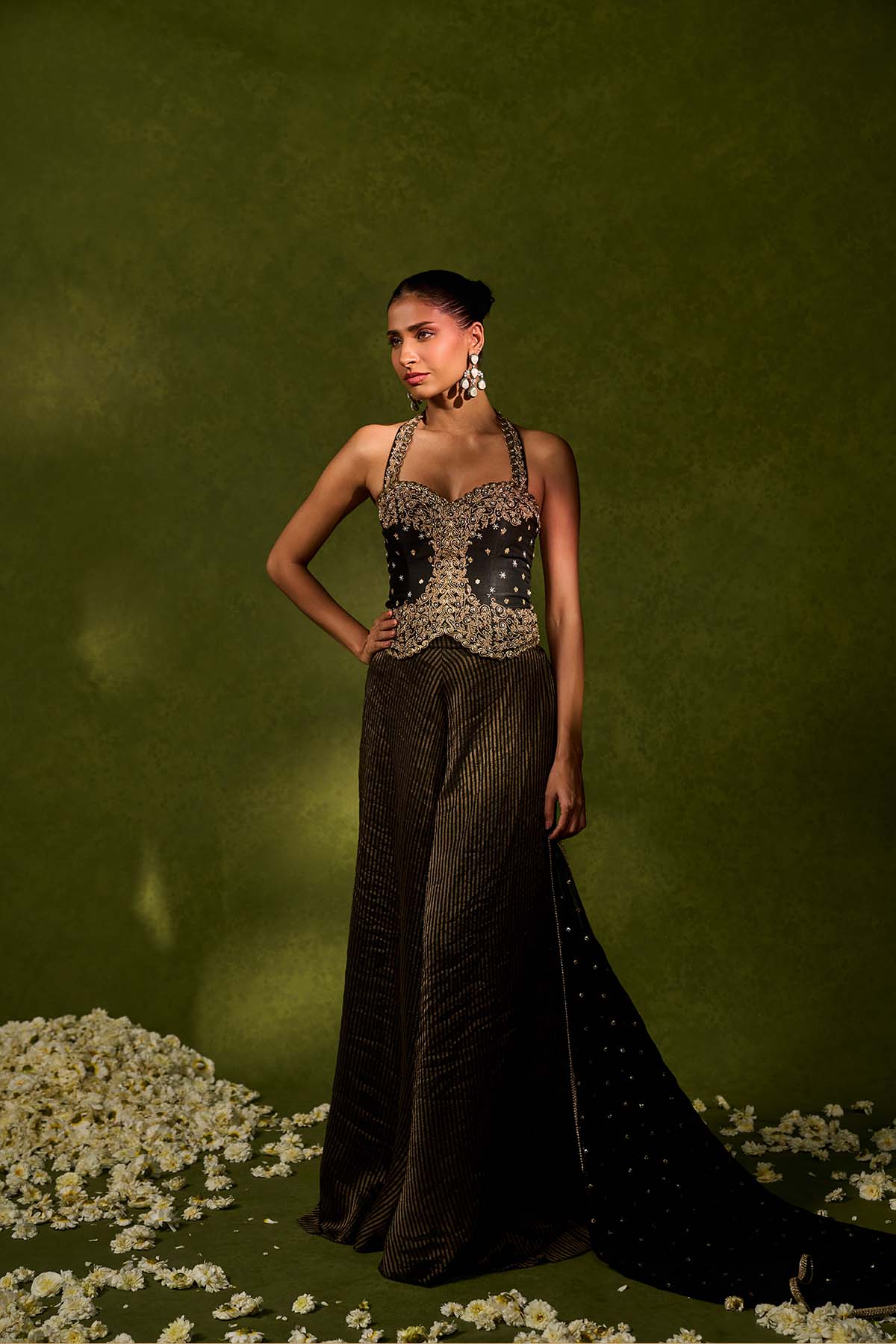 Tissue jamewar flared pants paired with a statement halter blouse, richly embellished with zari, pearls, glass beads, sequence, zardozi and stone work and an organza dupatta, softly adorned with delicate embellishments