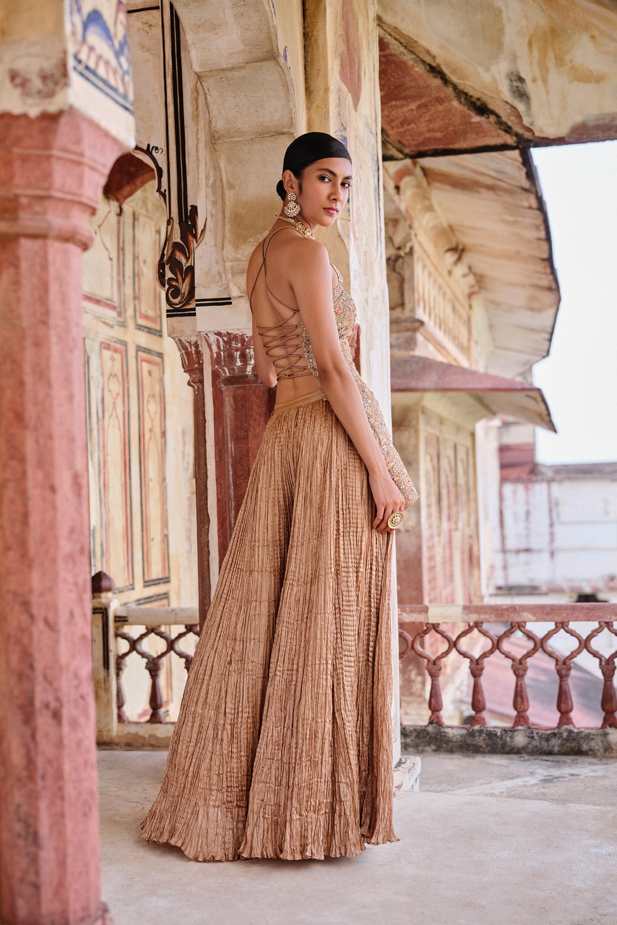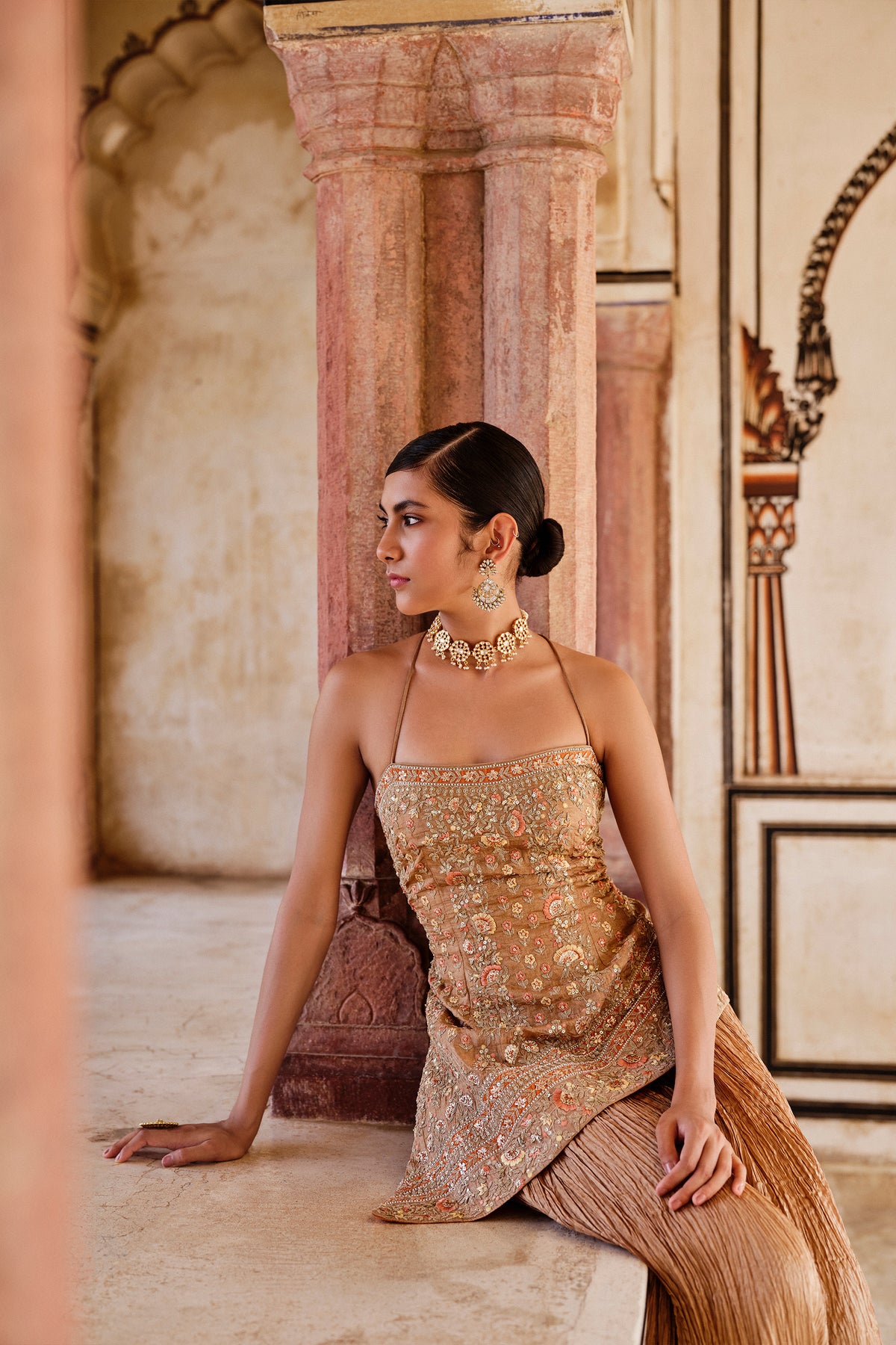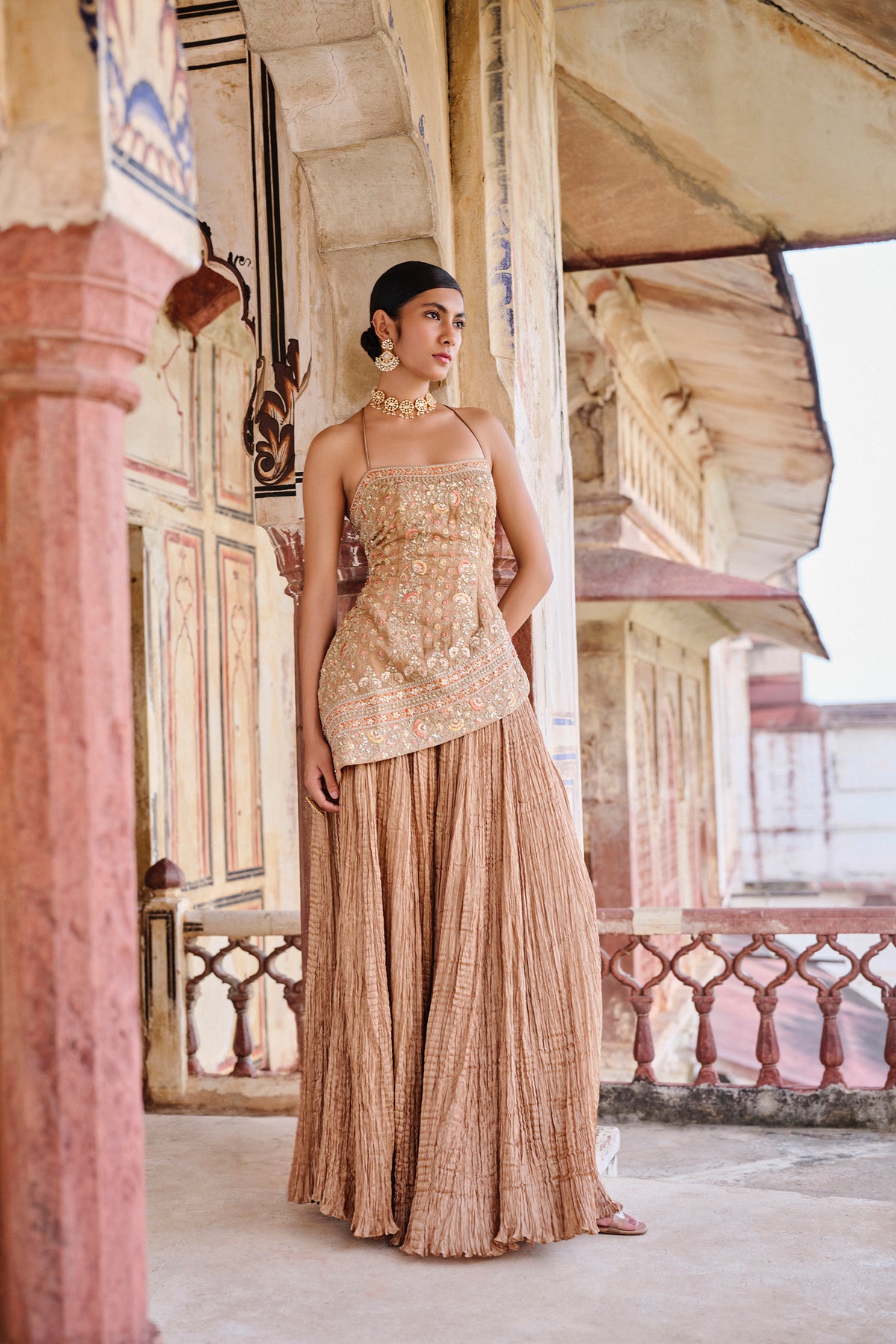 This contemporary sharara set is a true celebration of timeless silhouette blended with a touch of modernity. Spotlighting gota patti, threadwork, zari and sequins in their glory, this outfit is crafted for modern occasions.