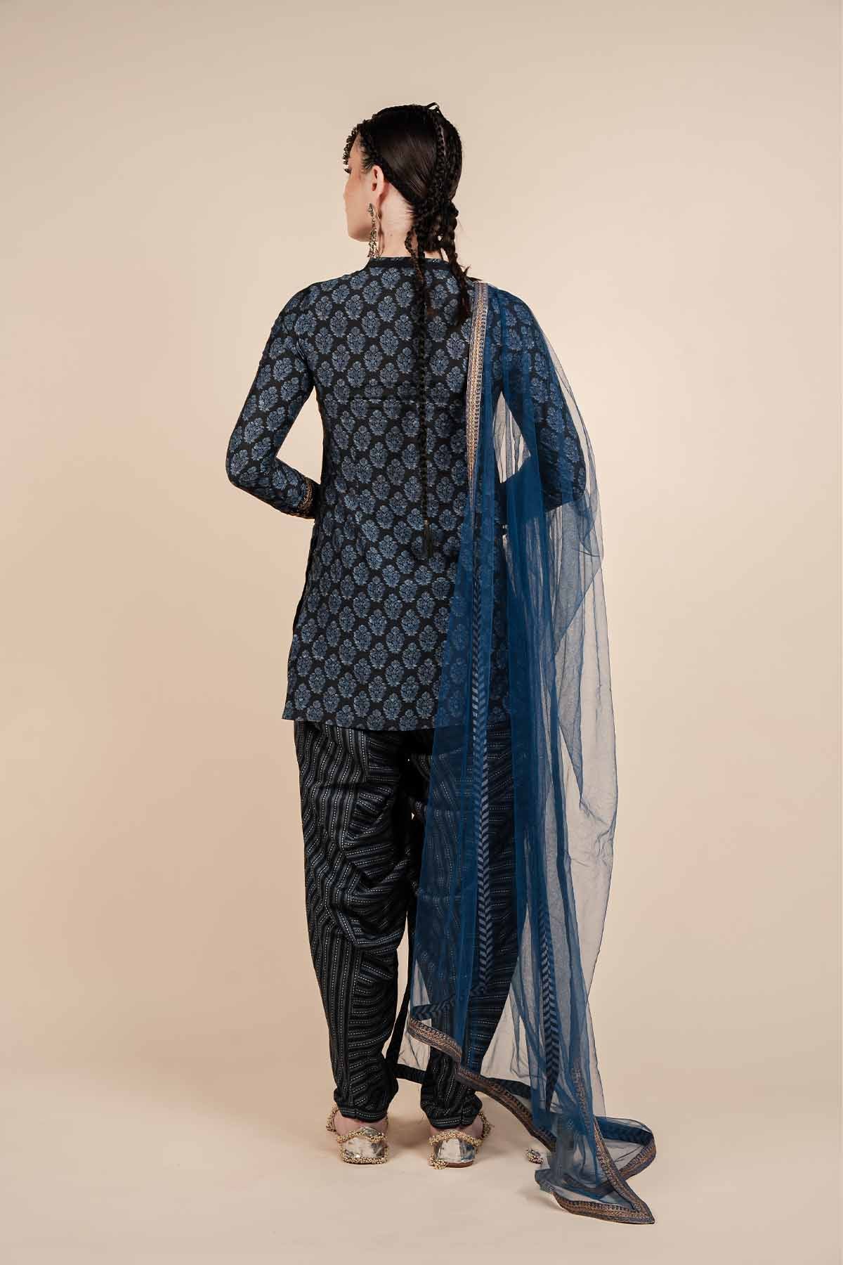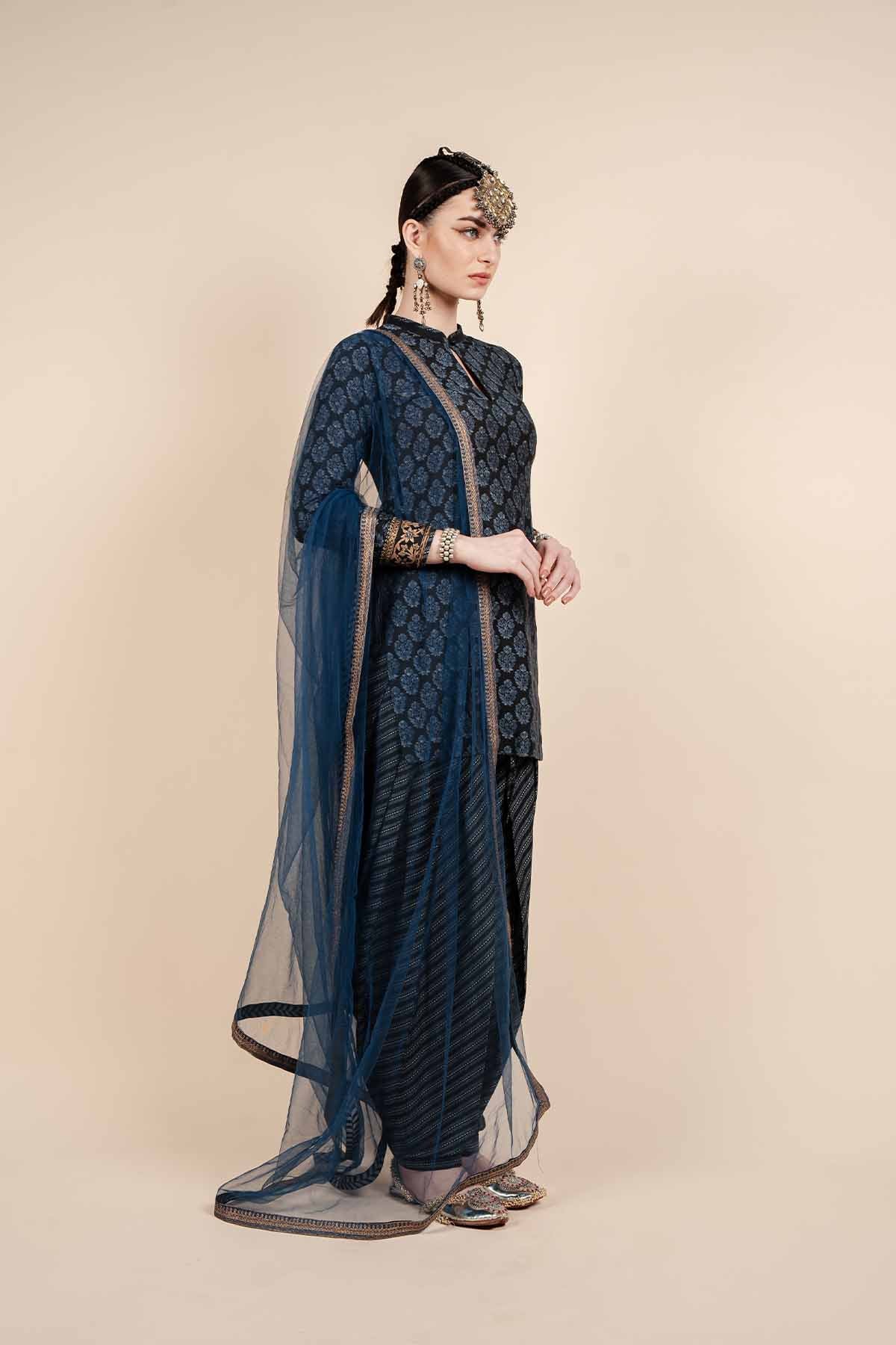 The blue net stole features an antique gold embroidered border with valaya's signature "The shifting leaves chevron" facing along the edge, adding a distinct touch of elegance and sophistication.