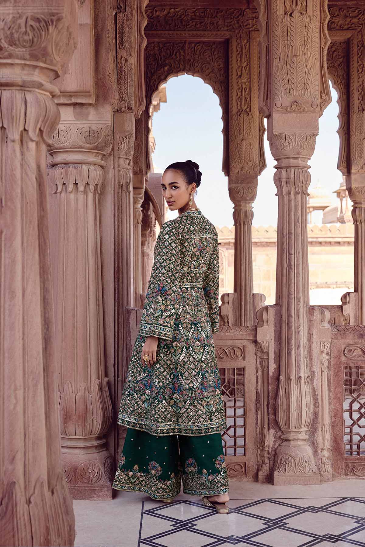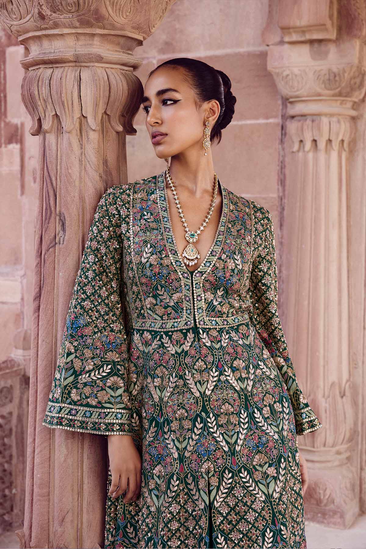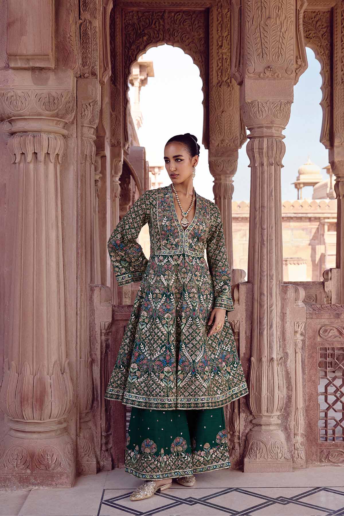 Handcrafted as an expression of forest flora, our Nemora Anarkali Set is perfect for celebrations. Designed in luxurious silk, its nature-inspired motifs are elevated in zardozi, threadwork & sequins.