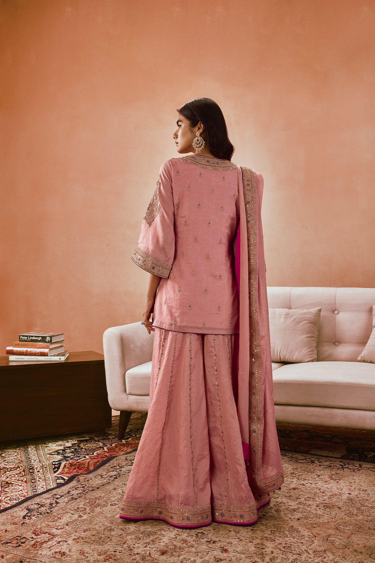 Our signature dusky pink gharara set embroidered with hand marodi and applique handwork, paired with sharara and dupatta