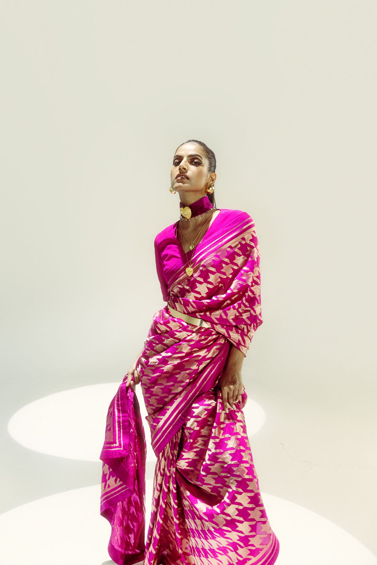 Reimagining sarees through the lens of a stylist and a textile connoisseur, our recent collection reimagines traditional banarasi designs with the cult-favourite houndstooth pattern. This rani pink signature is handwoven in pure silk and comes sprinkled with intricate gold zari in a beautiful houndstooth pattern. We recommend styling it with a striking belt or, accessorizing with some statement gold jewellery to finish the look.