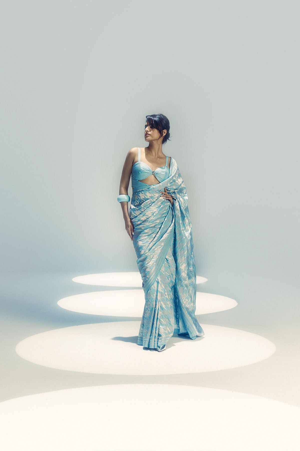 Reimagining sarees through the lens of a stylist and a textile connoisseur, our recent collection reimagines traditional banarasi designs with the cult-favourite houndstooth pattern. This rani pink signature is handwoven in pure silk and comes sprinkled with intricate gold zari in a beautiful houndstooth pattern. We recommend styling it with a striking belt or, accessorizing with some statement gold jewellery to finish the look.