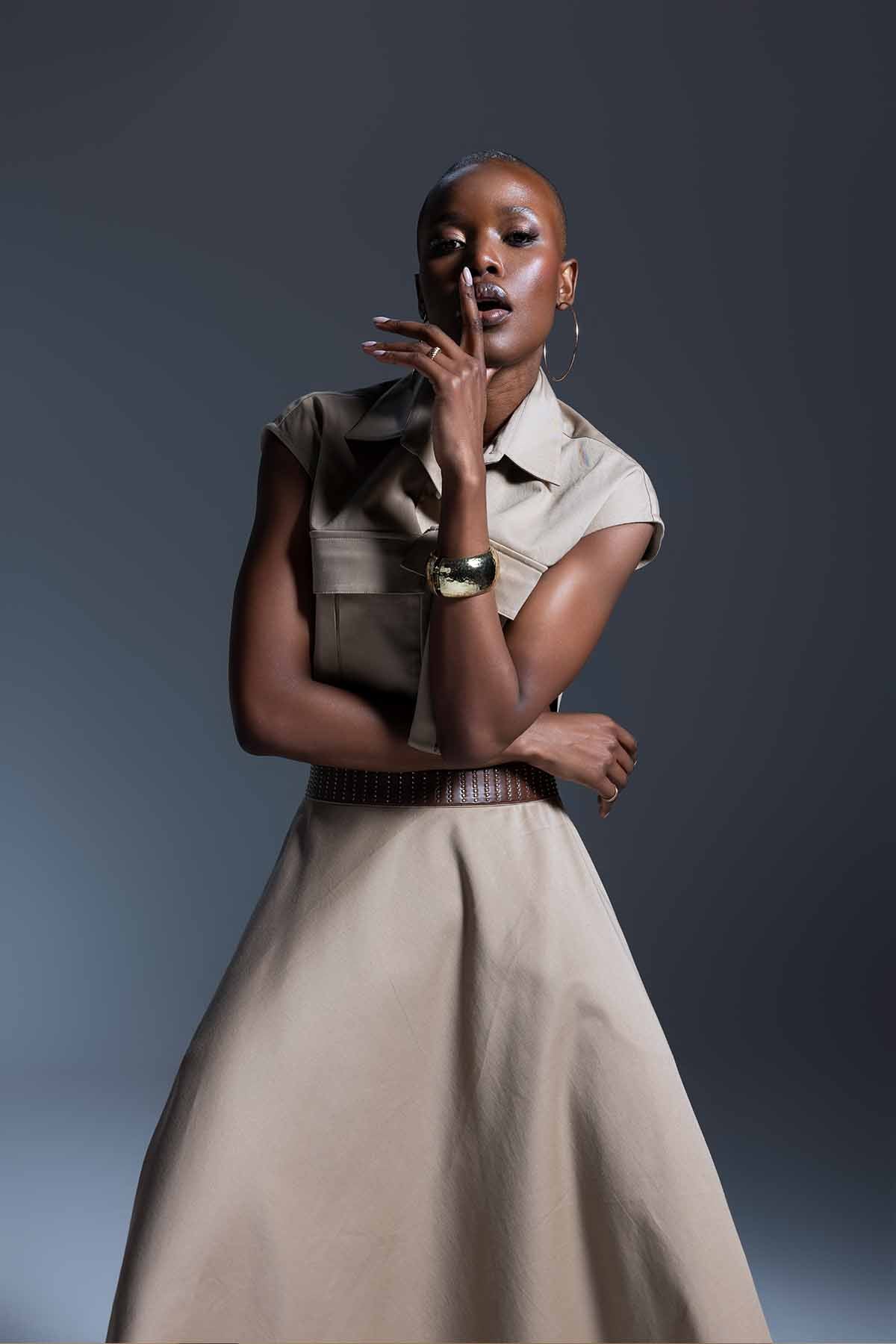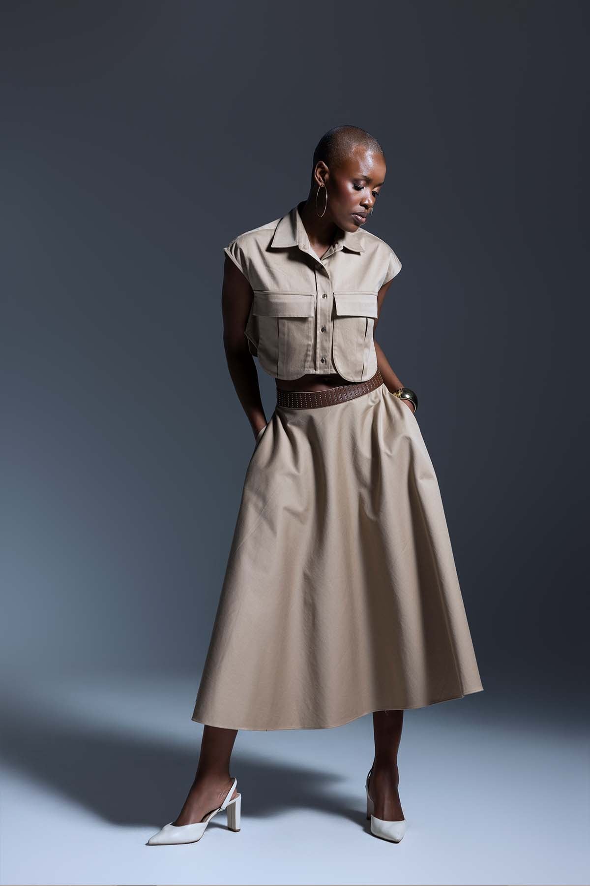 A high-waisted midi skirt with an attached leather waistband, falling into a soft flare for an effortless look.