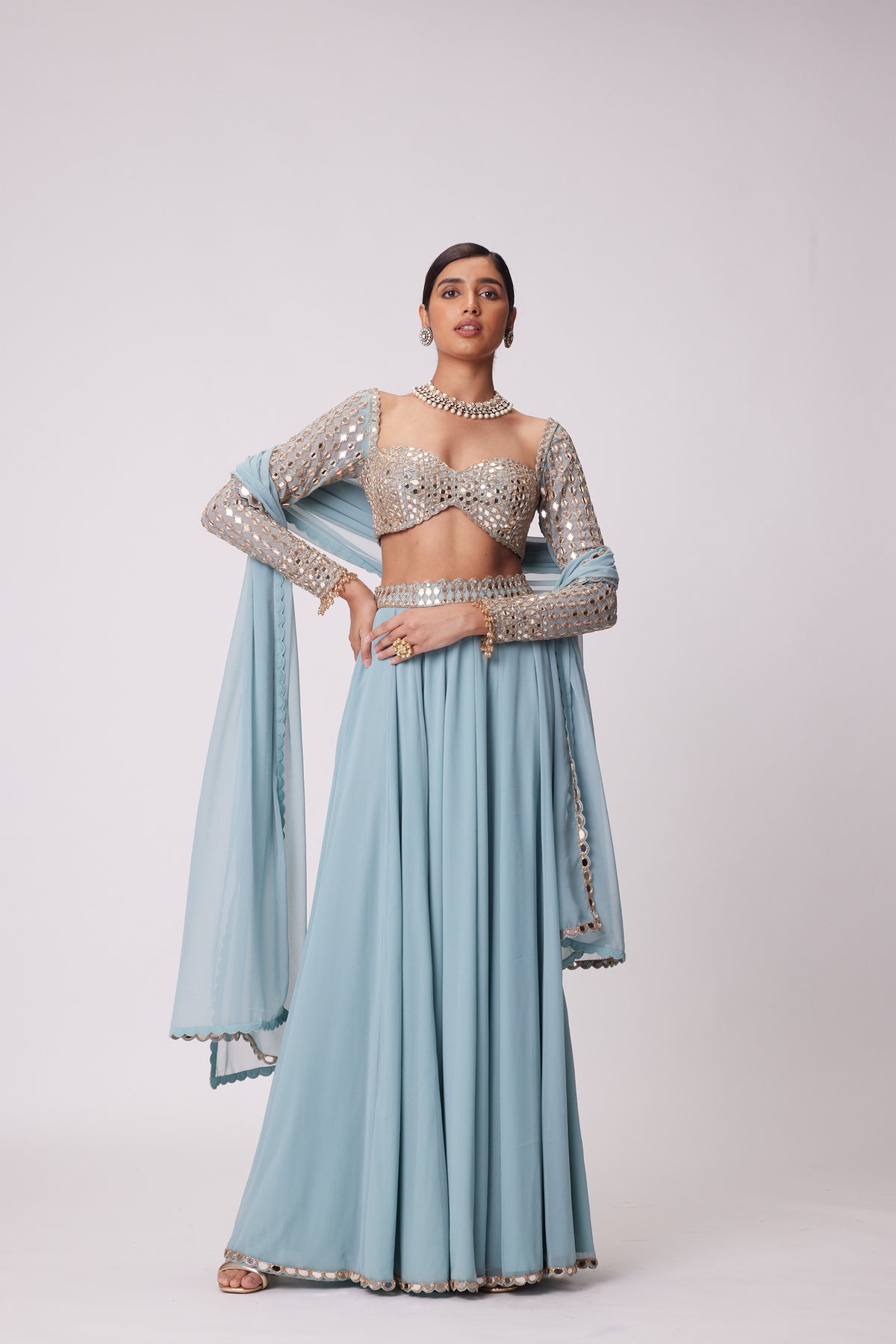 Powder blue lehenga pants and dupatta clubbed with real hand-cut mirror embroidered blouse with tassel detailing