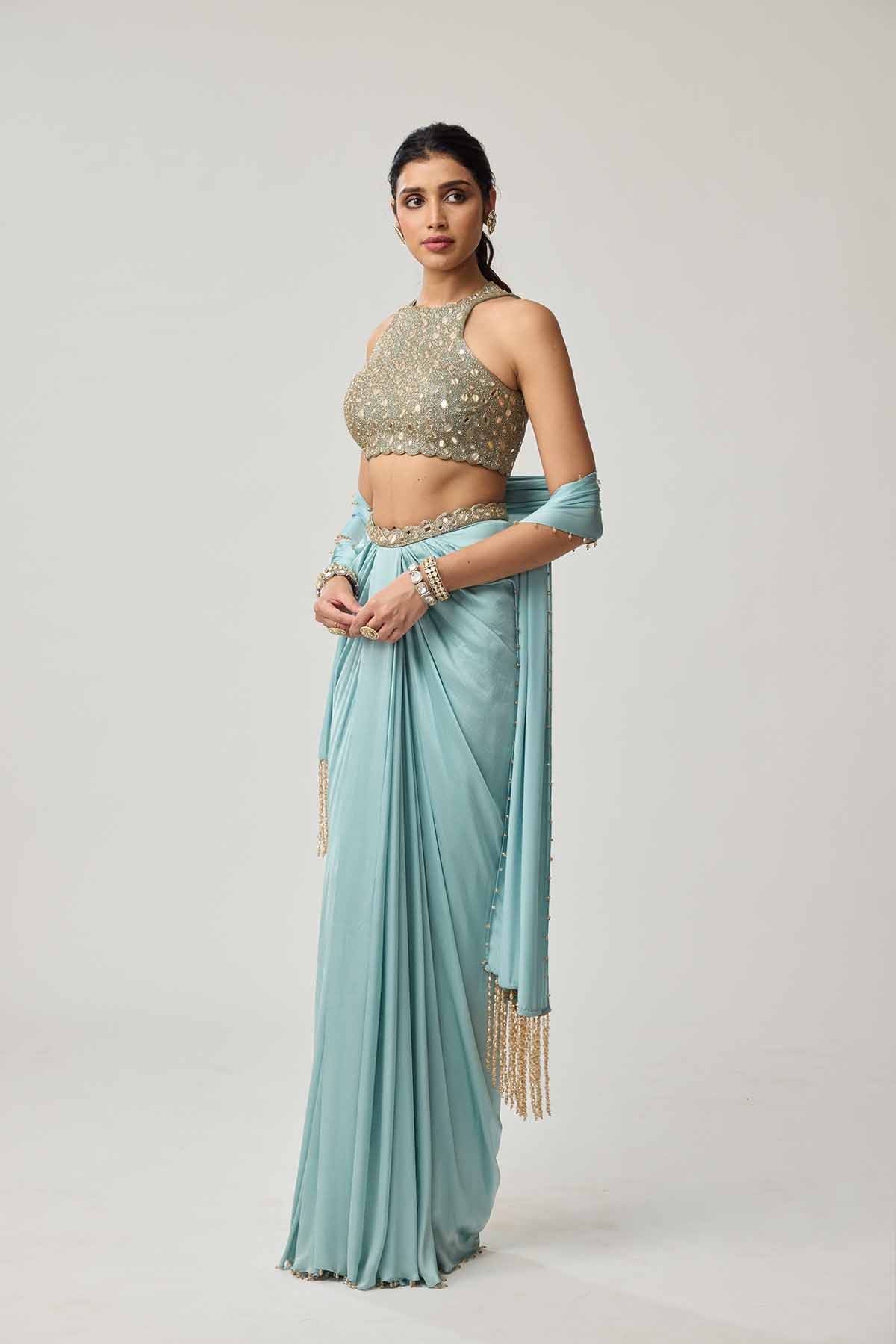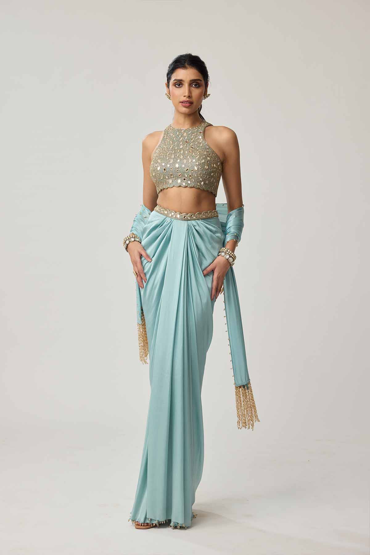 Powder blue satin draped skirt paired with a heavily mirror embroidered racer back blouse and stole.