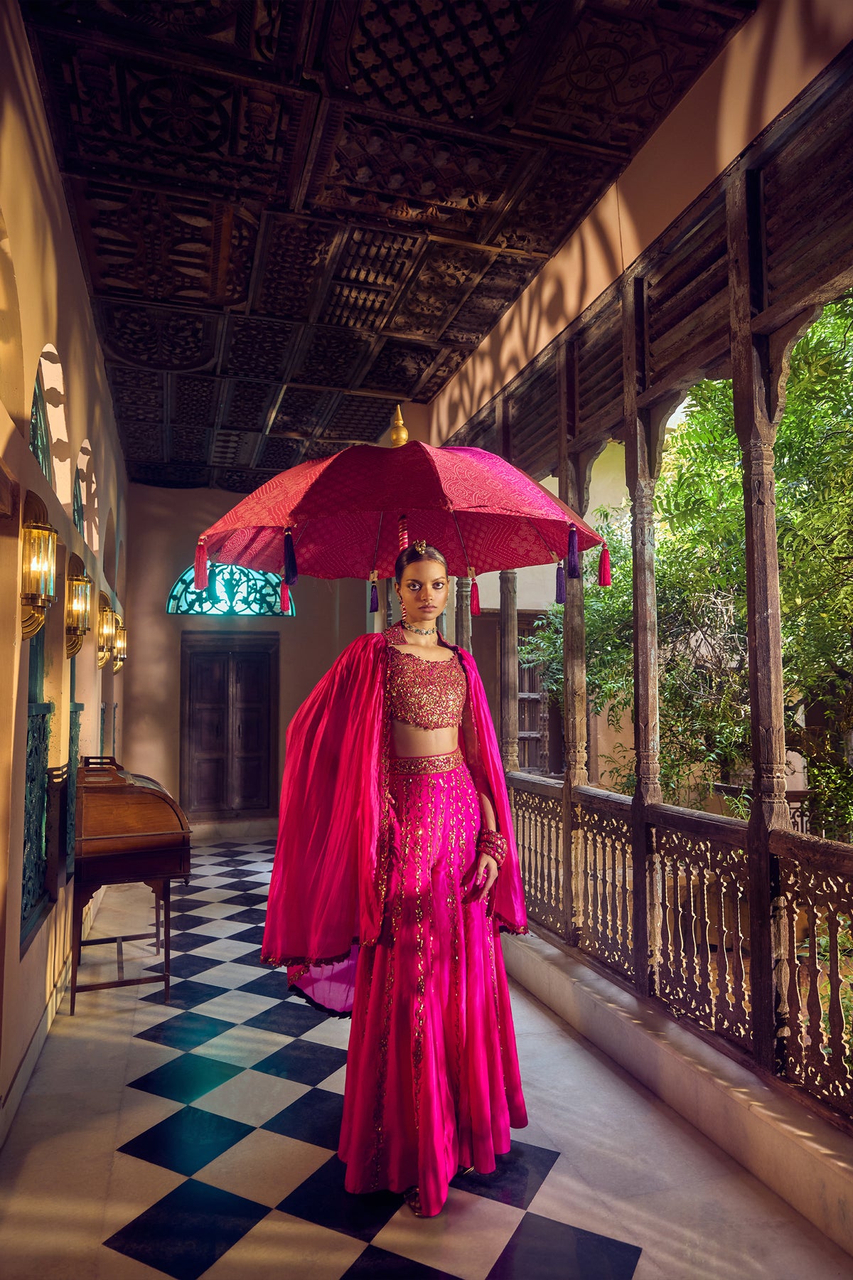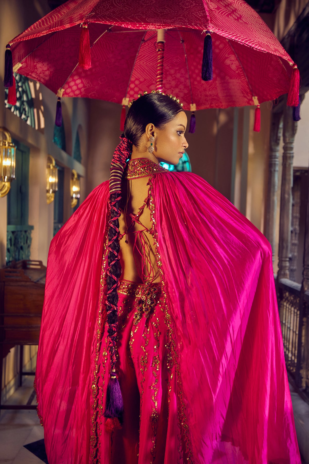 Our rani sa sharara set in the gulabi gulaal. A twist on the classic, the three-piece set comprises of a blouse, sharara and middling length cape adorned with coin and resham embroidery, it's a true couture gem best-suited for those twirl-worthy moments. Whether you wear it as a set or as separates, it's sure to be a conversation starter.