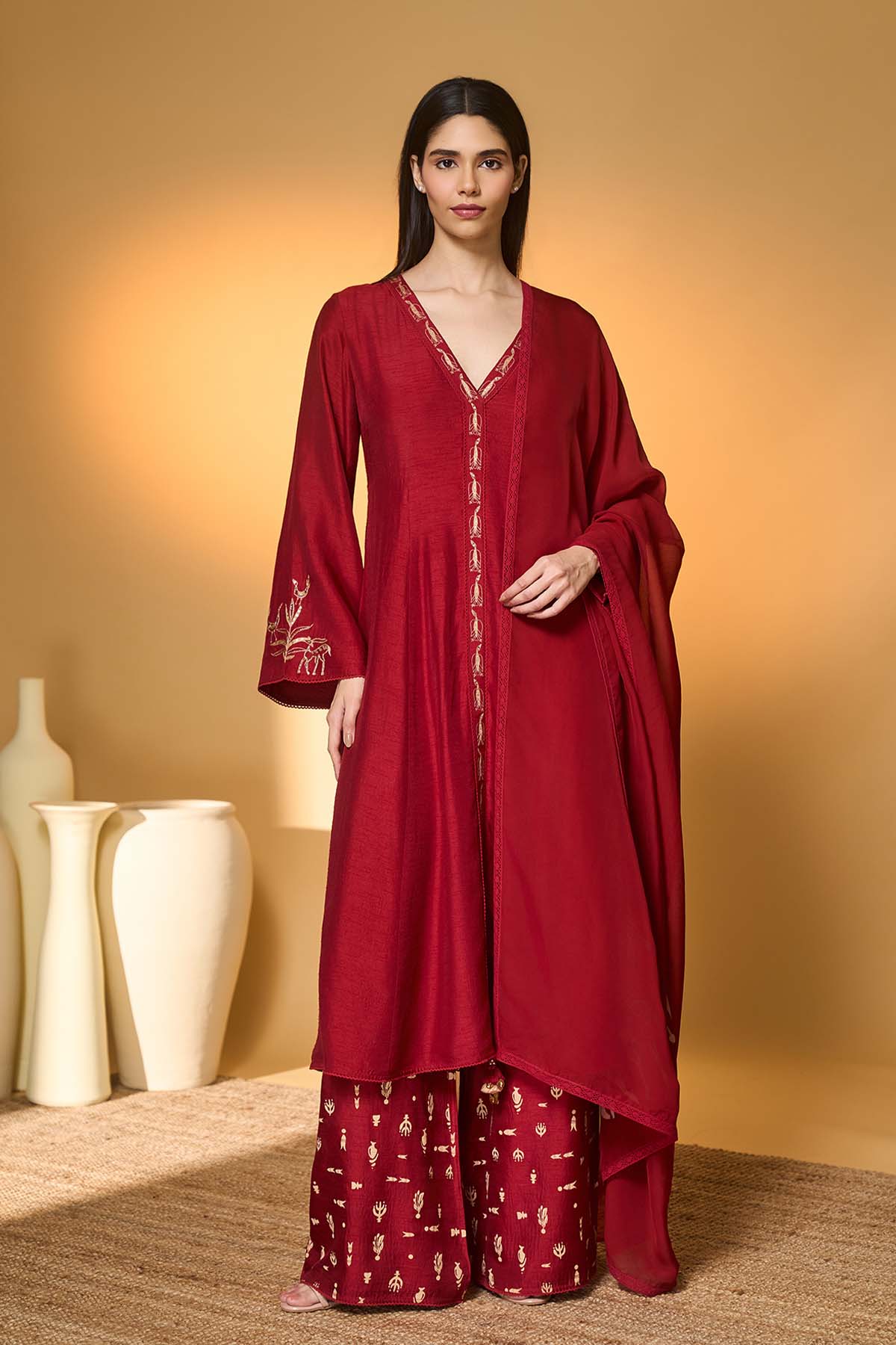 Pants- red straight pants| all over screen printed "Forest totem" | side seam closure | adoorned with crochet scallop lace dupatta- placement screen print "Forest totem"|adorned with crochet laces and tassels