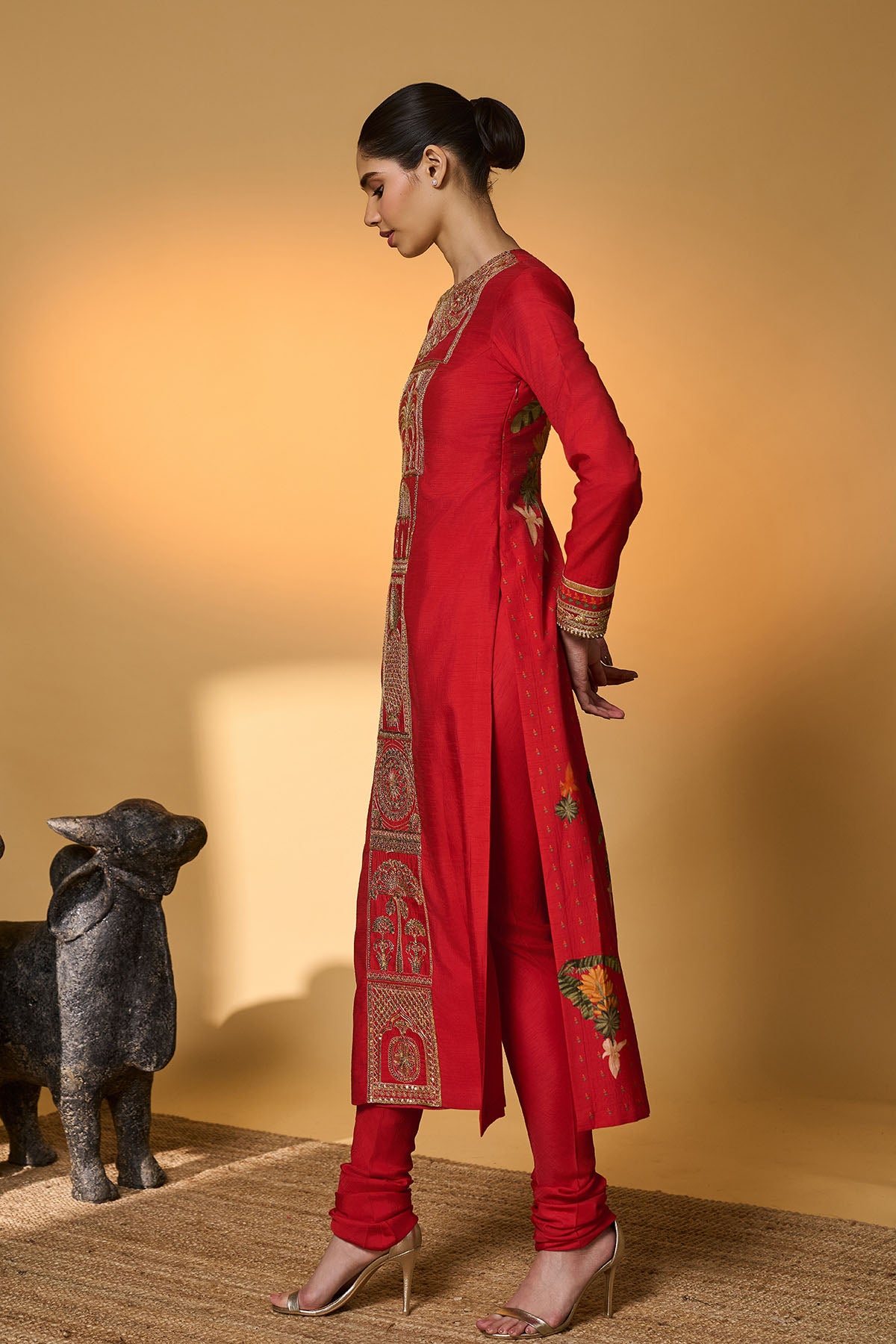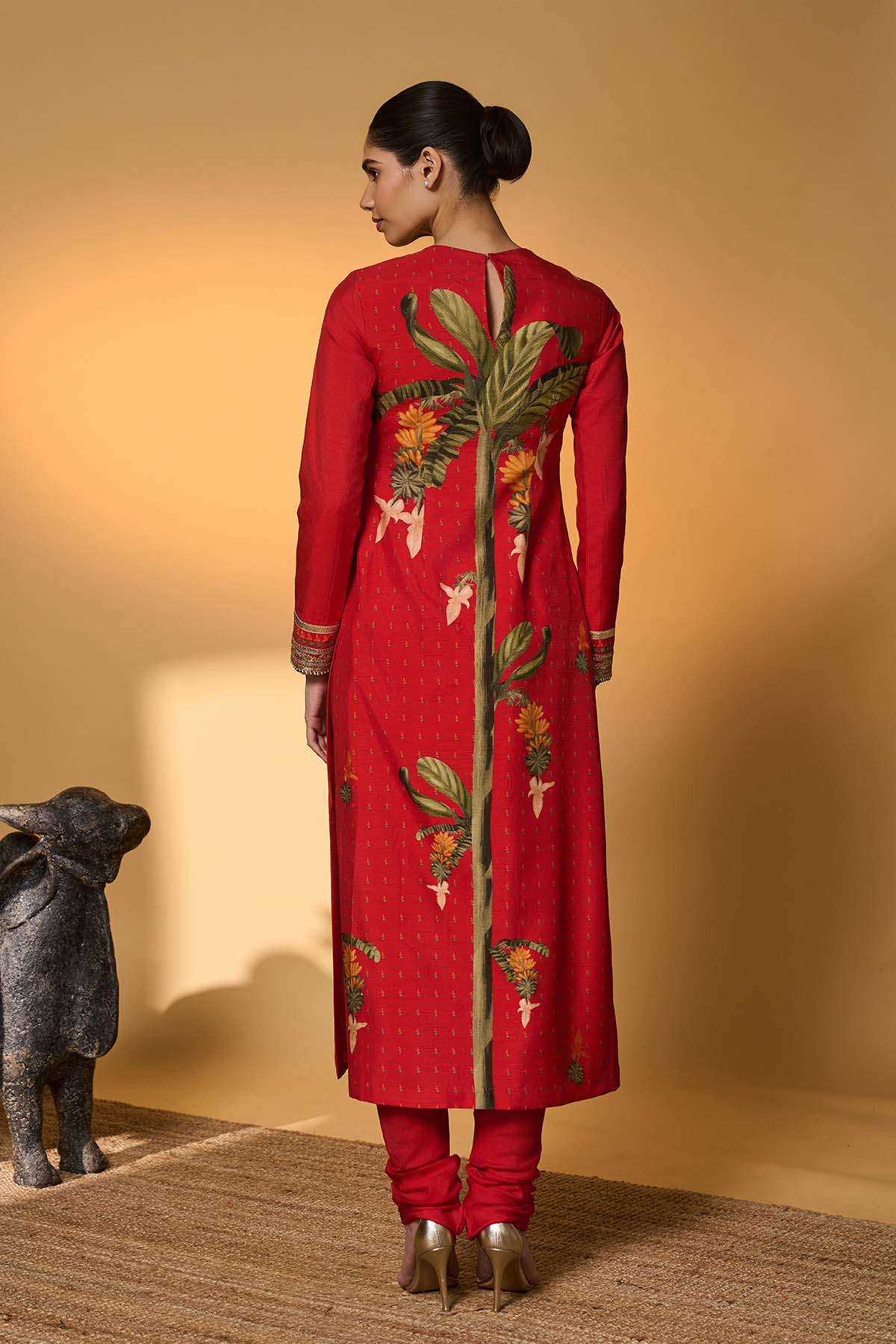 Kurta – the kurta has almost all-over embroidery with heavy detailing | the back is printed with a beautiful tropical print | adorned with sequin handmade lace and gota. Pants – the pants are churidar-style, made in raw silk.