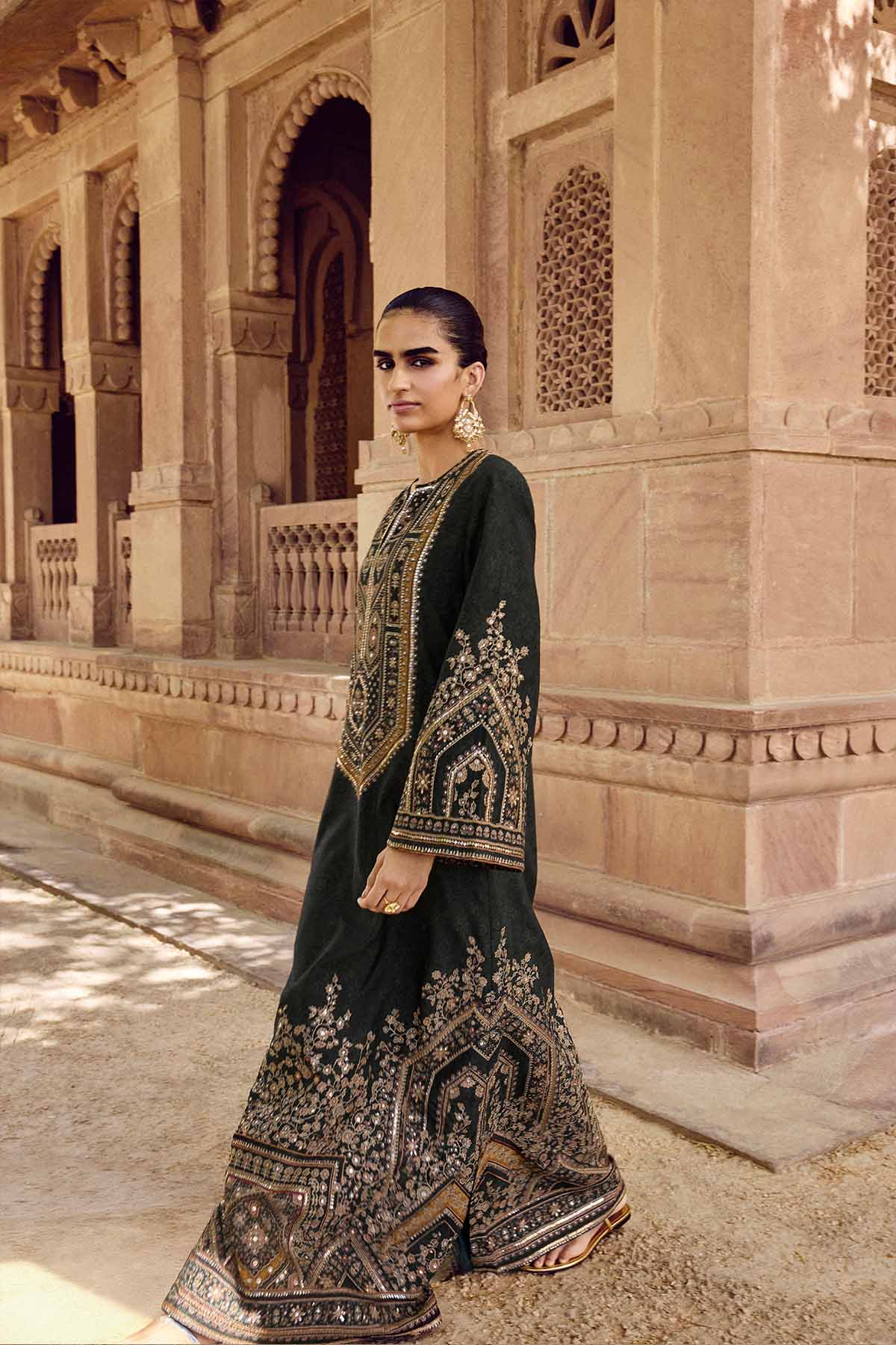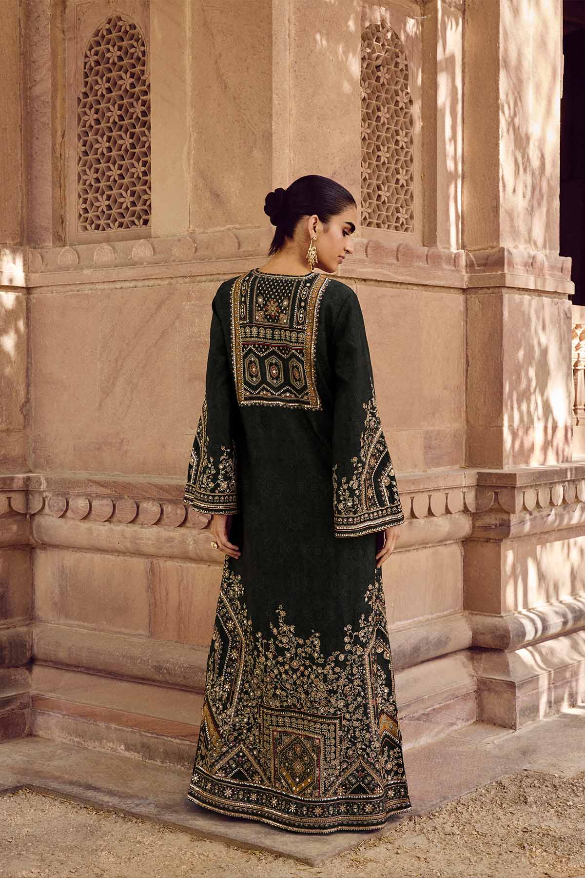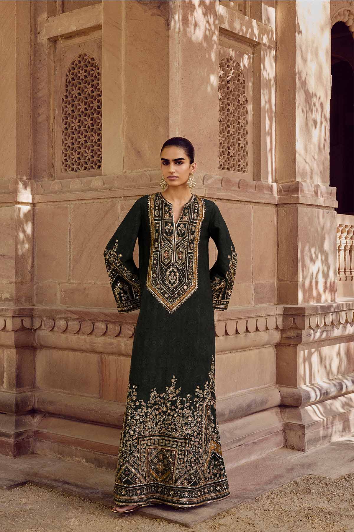 Architectural details come alive in our rishama kaftan. Interspersed with nature-inspired motifs, it is crafted in luxurious silk & elevated in sequins.