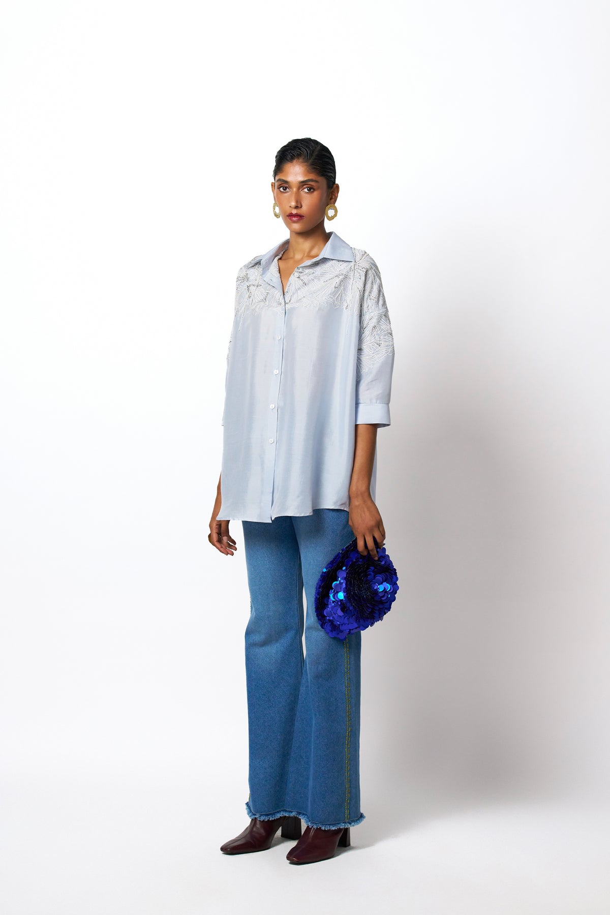 The ro shirt is a timeless piece featuring a relaxed fit and 3/4 sleeves. Adorned with white machine embroidery on the front, back, and sleeves, it’s beautifully enhanced with hand-embroidered pearls, cutdana, and rhinestones, adding a subtle hint of glam and refined detail.