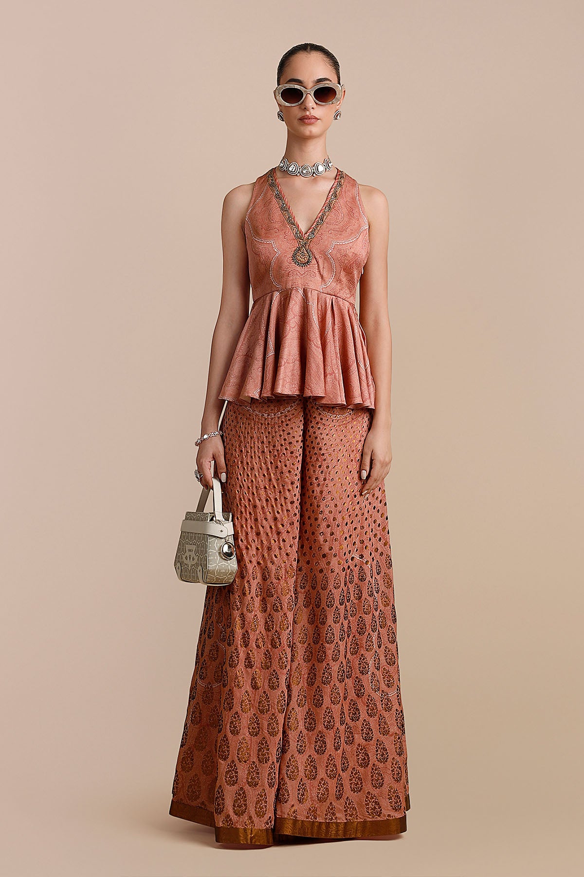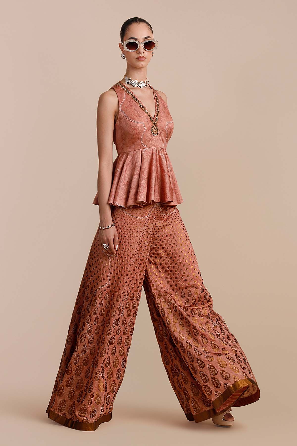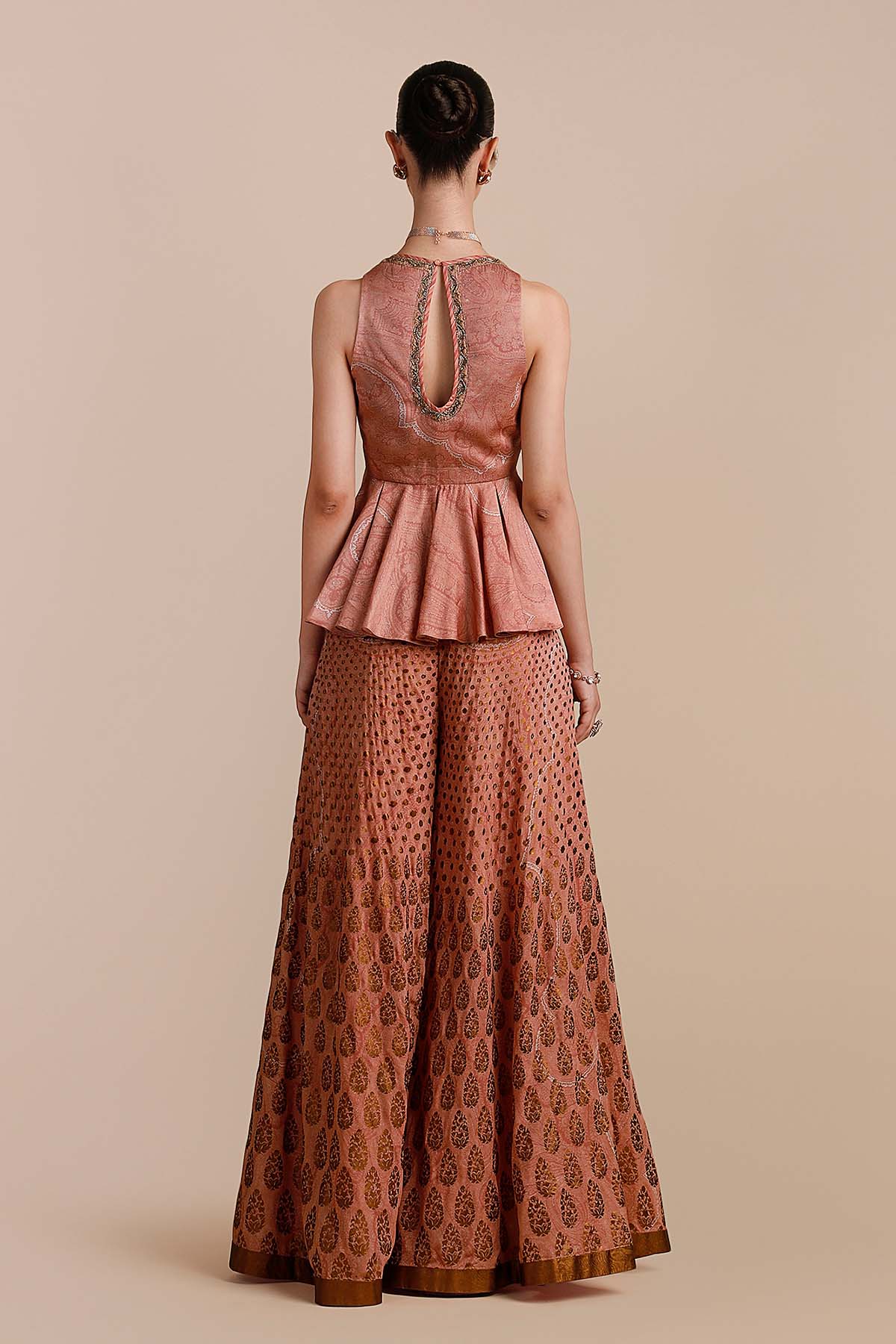 The jamawar print sharara is adorned with copper foil detailing and finished with a matching copper border. It is paired with a bias cut peplum top featuring a jewel neckline, embellished with copper gold dori, crystals, resham, kasab, dabka, beads, and sequins creating a rich interplay of texture and sheen.