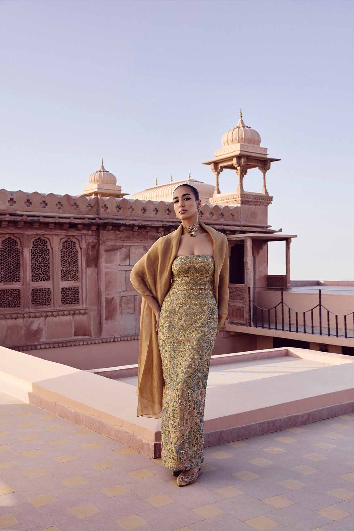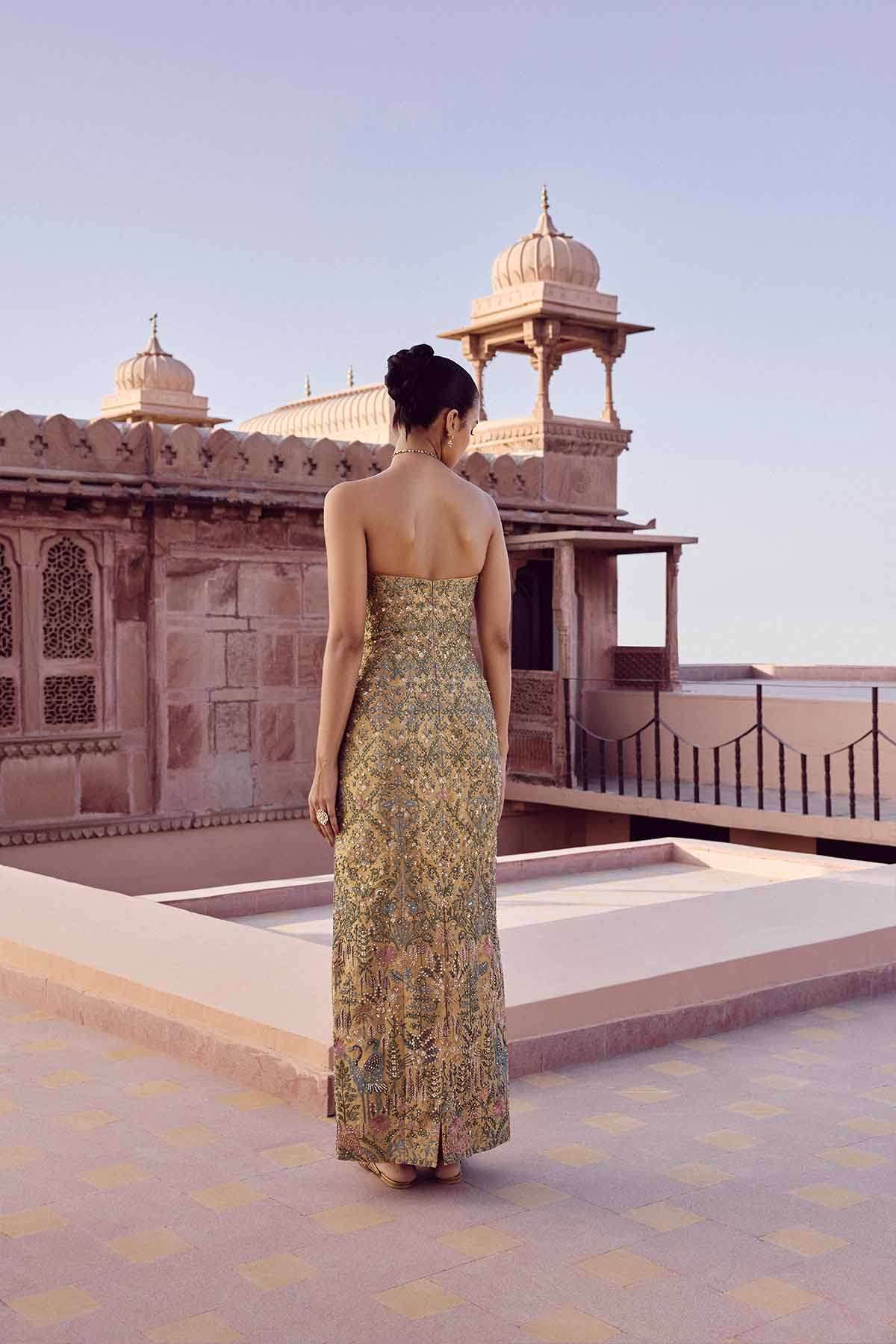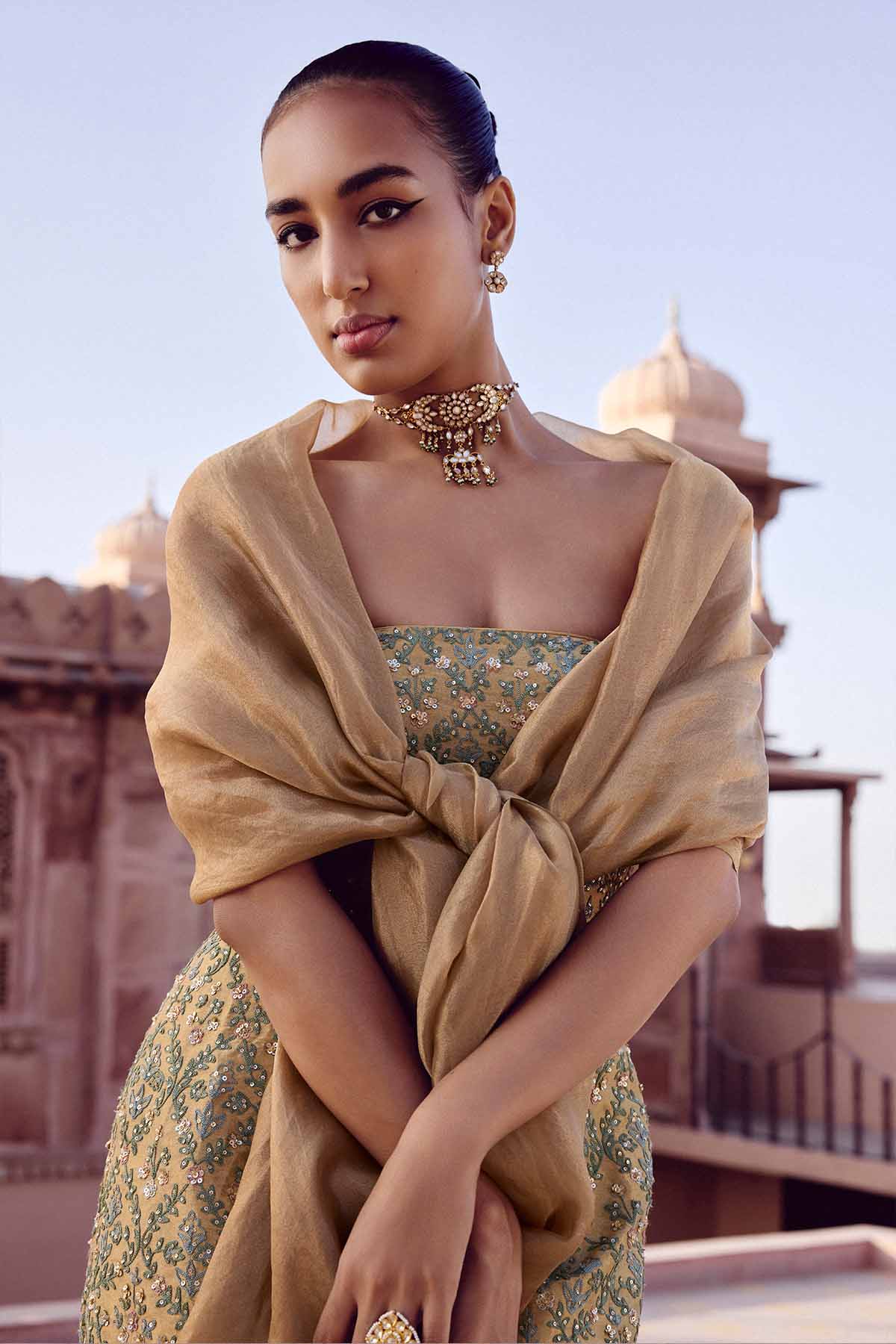 Inspired by nature's abundance, our sahuri gown in gold features motifs of resplendent flora. Crafted in silk, it is elevated in zardozi, threadwork, beads & sequins.