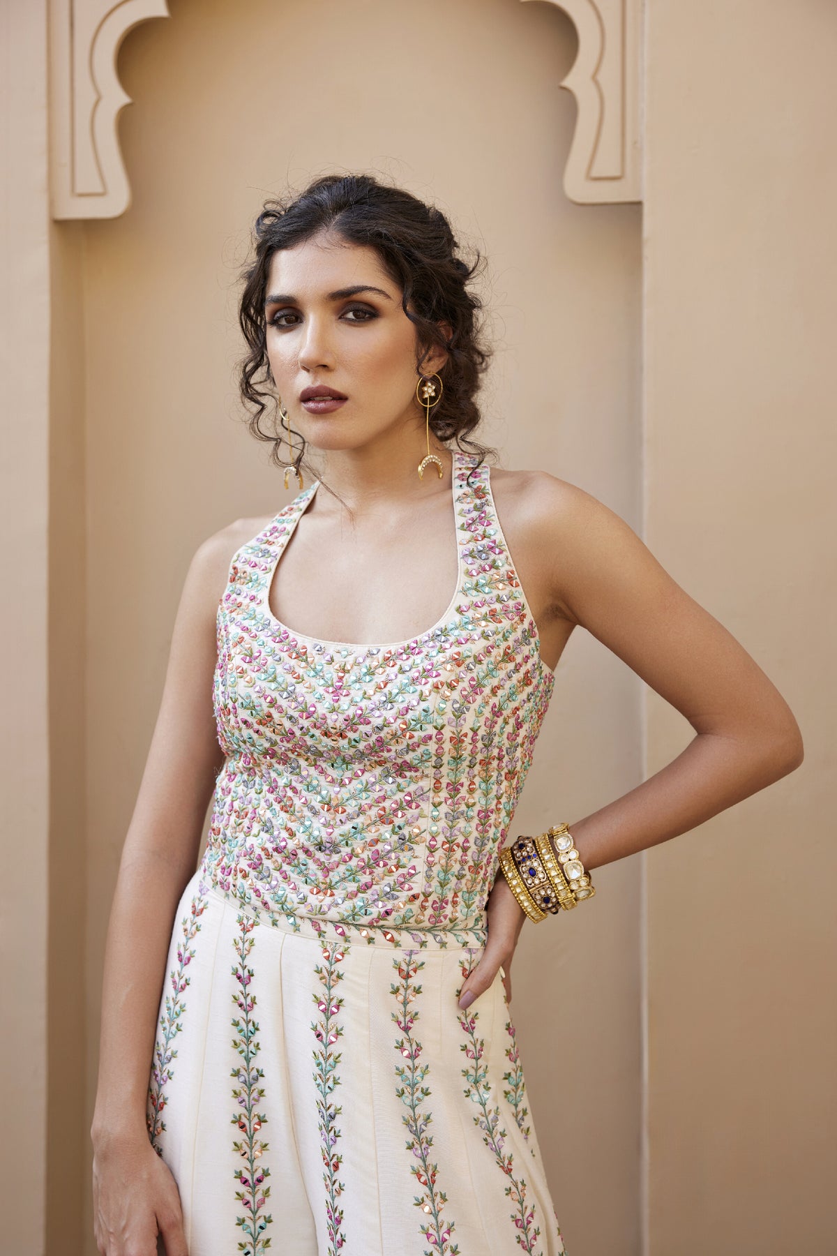 Mirror and colorful resham embroidered ivory dupion silk top and flared pant paired with contrast lavender tulle dupatta with pearl embroidery detailing