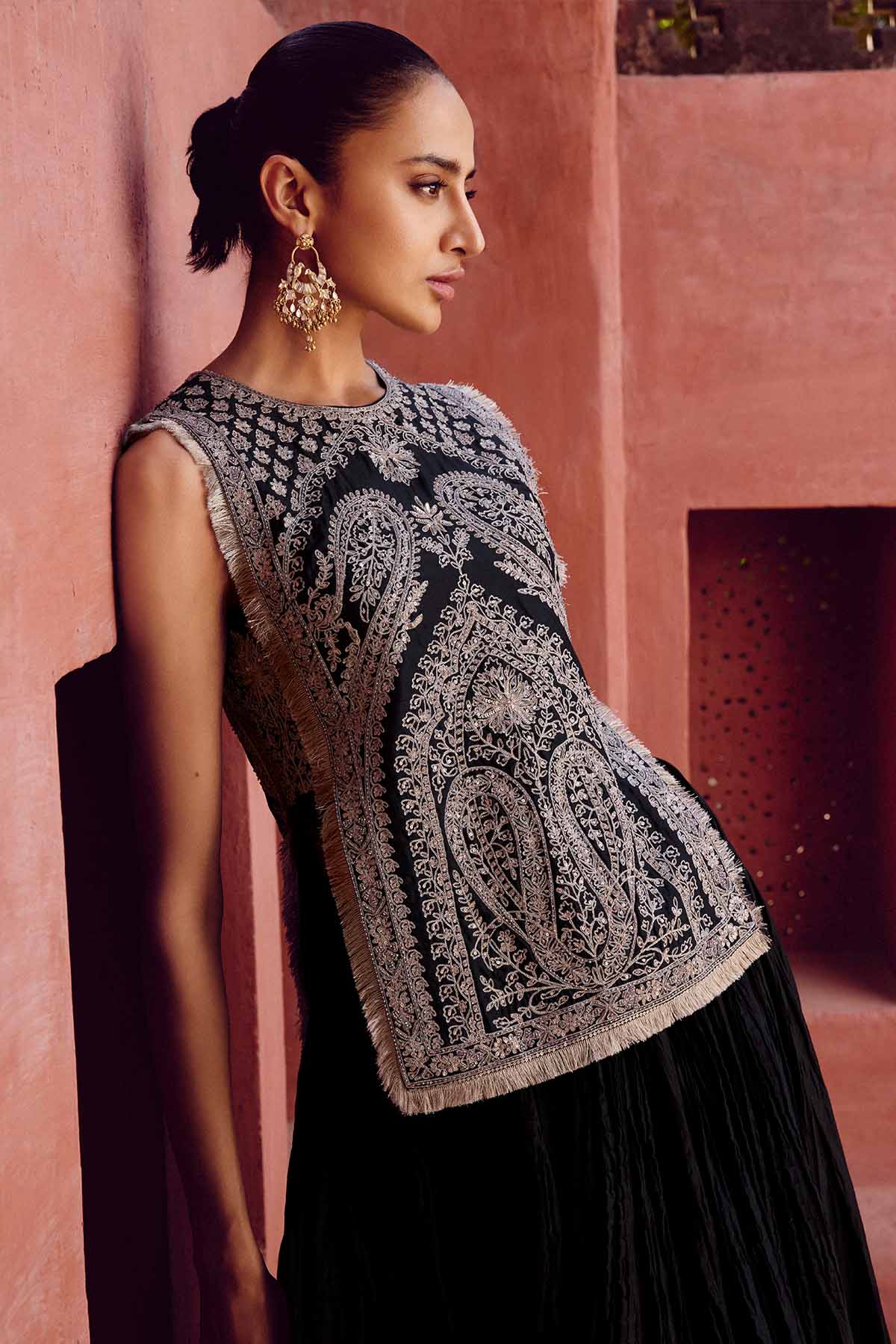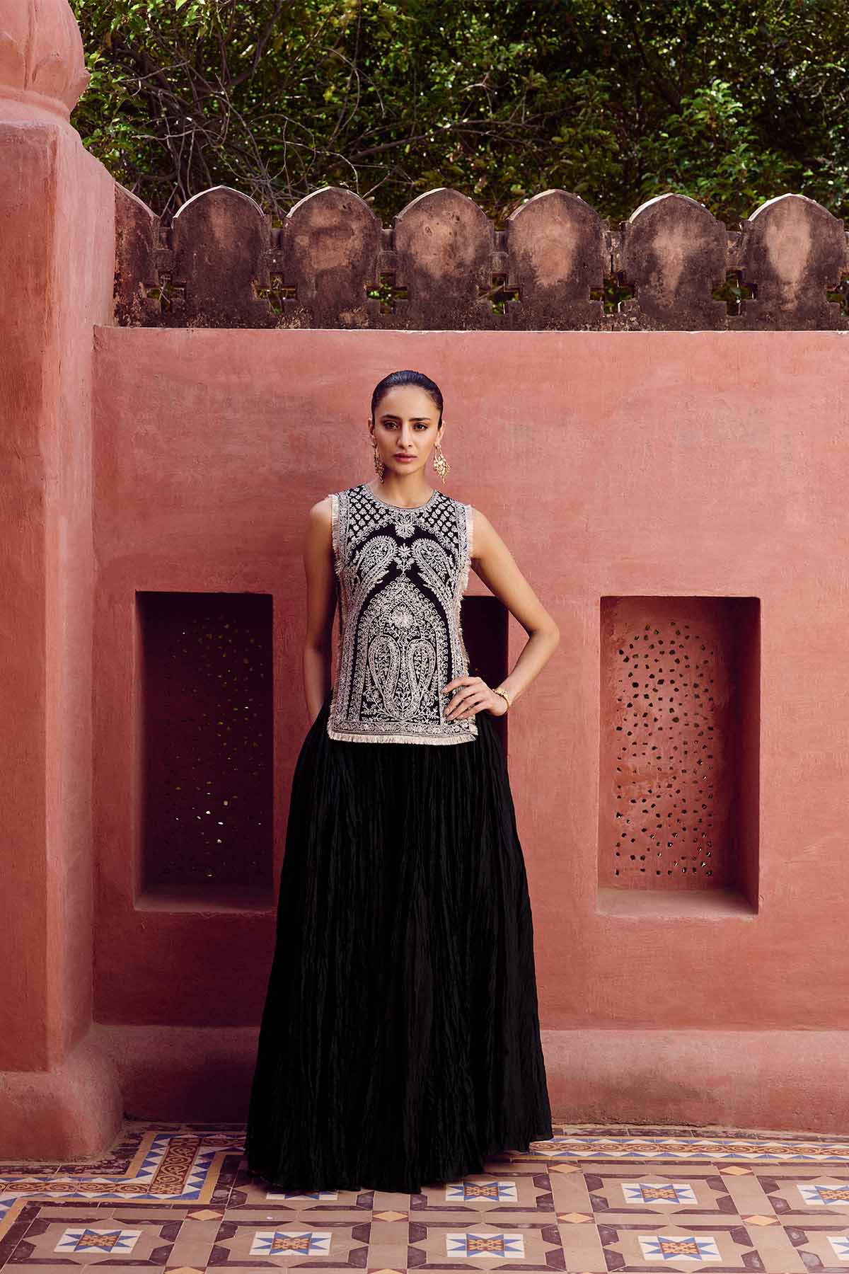 Inspired by architectural arcs and reimagined for the modern woman of today, our sehrish skirt set is crafted in luxurious silk & mul. Featuring handcrafted aari embroidery & sequins, it is perfect for celebrations.
