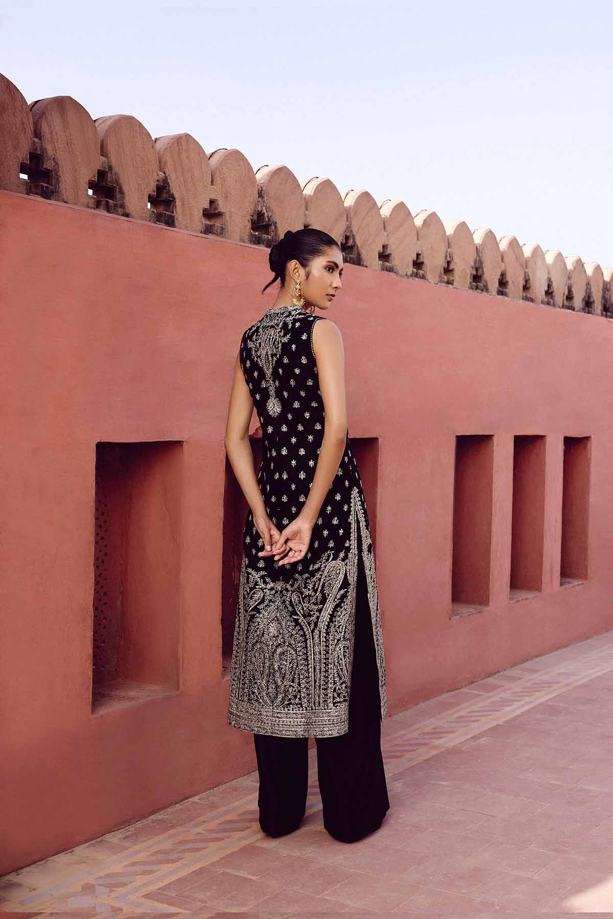 Inspired by architectural arcs and reimagined for the modern woman of today, our sehrish jacket set is crafted in luxurious silk. Featuring handcrafted aari embroidery & sequins, it is perfect for celebrations.