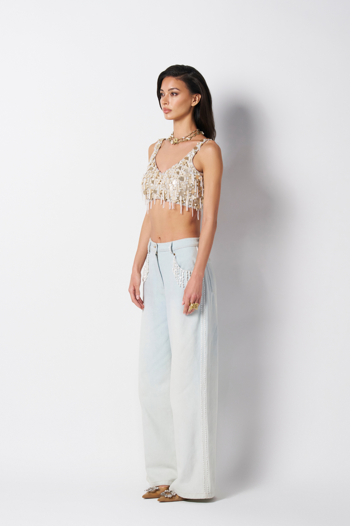 The shan blouse is cut with a deep sexy neckline and thin straps. It is hand embroidered with sequins, beads and tassels. It closes on the side with a zip. Pair it with our draped saris or a skirt for a chic look.