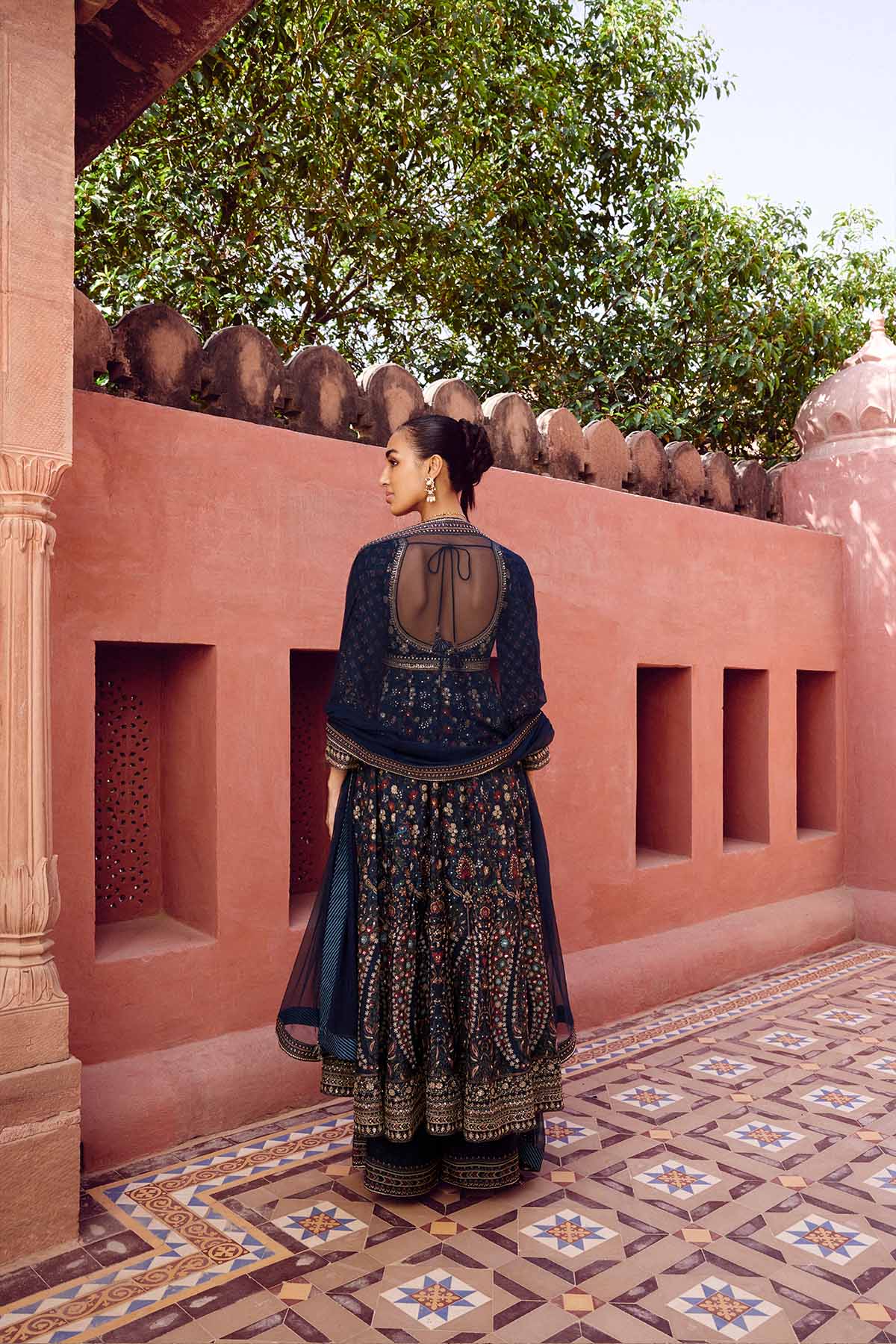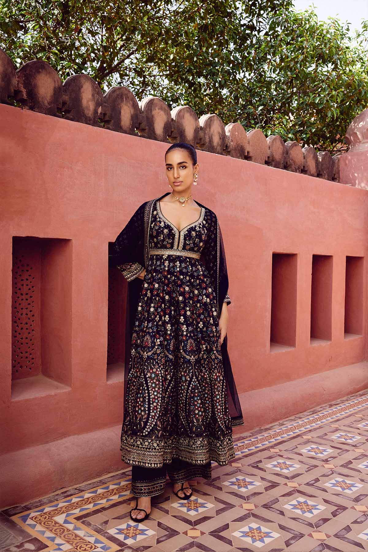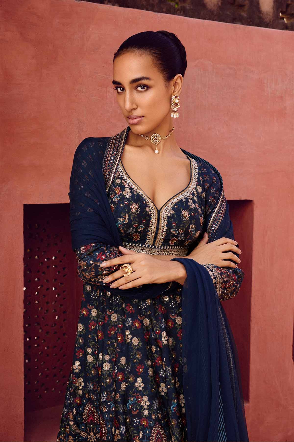 Nature-inspired motifs of birds & blooms come alive in our sharinee suit set. Crafted in luxurious silk, it features zari, beads & sequins that mirror the gleam of eventide soirees & celebrations.