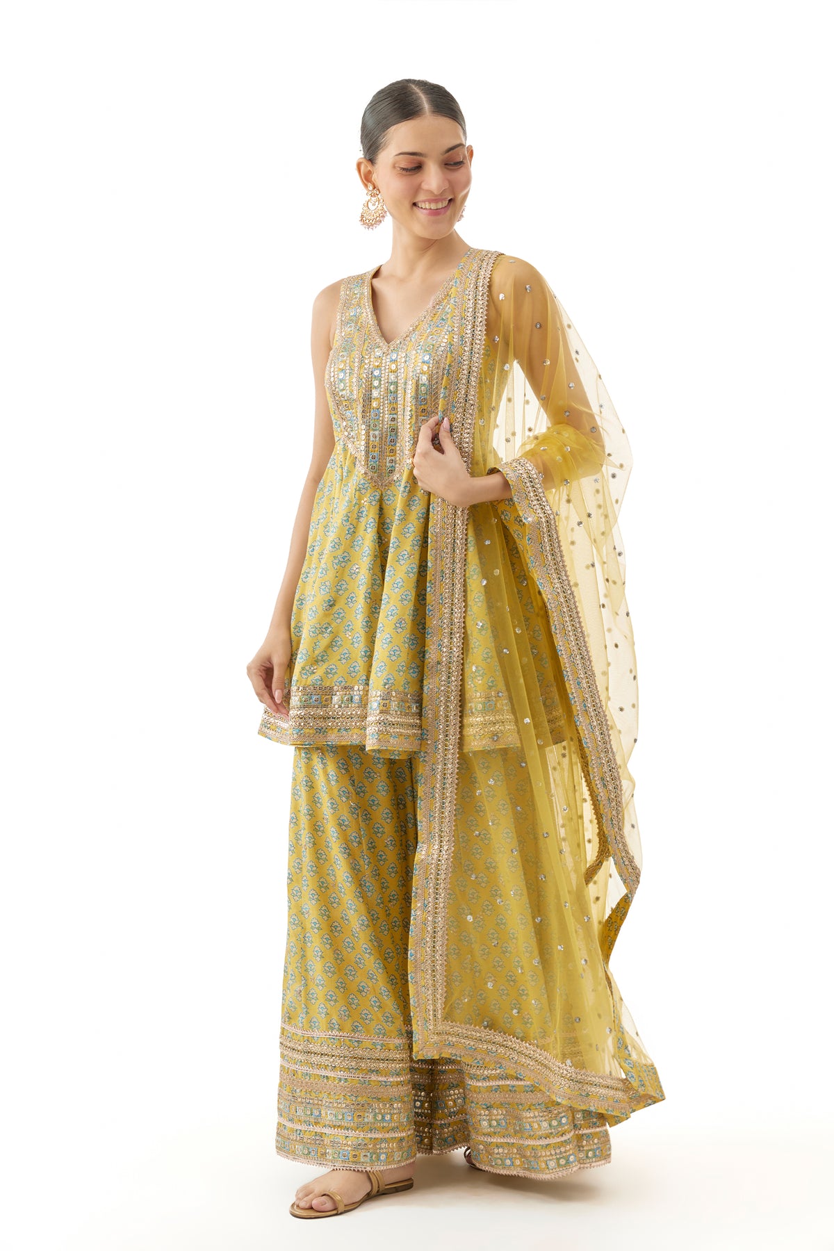 The sleeveless peplum kurta features a deep V-neckline, adorned with intricate embroidery, adding shimmer and sophistication. The flare of the top is mirrored in the wide-legged palazzo pants, which boast matching prints and richly embroidered borders and completed with a dupatta..