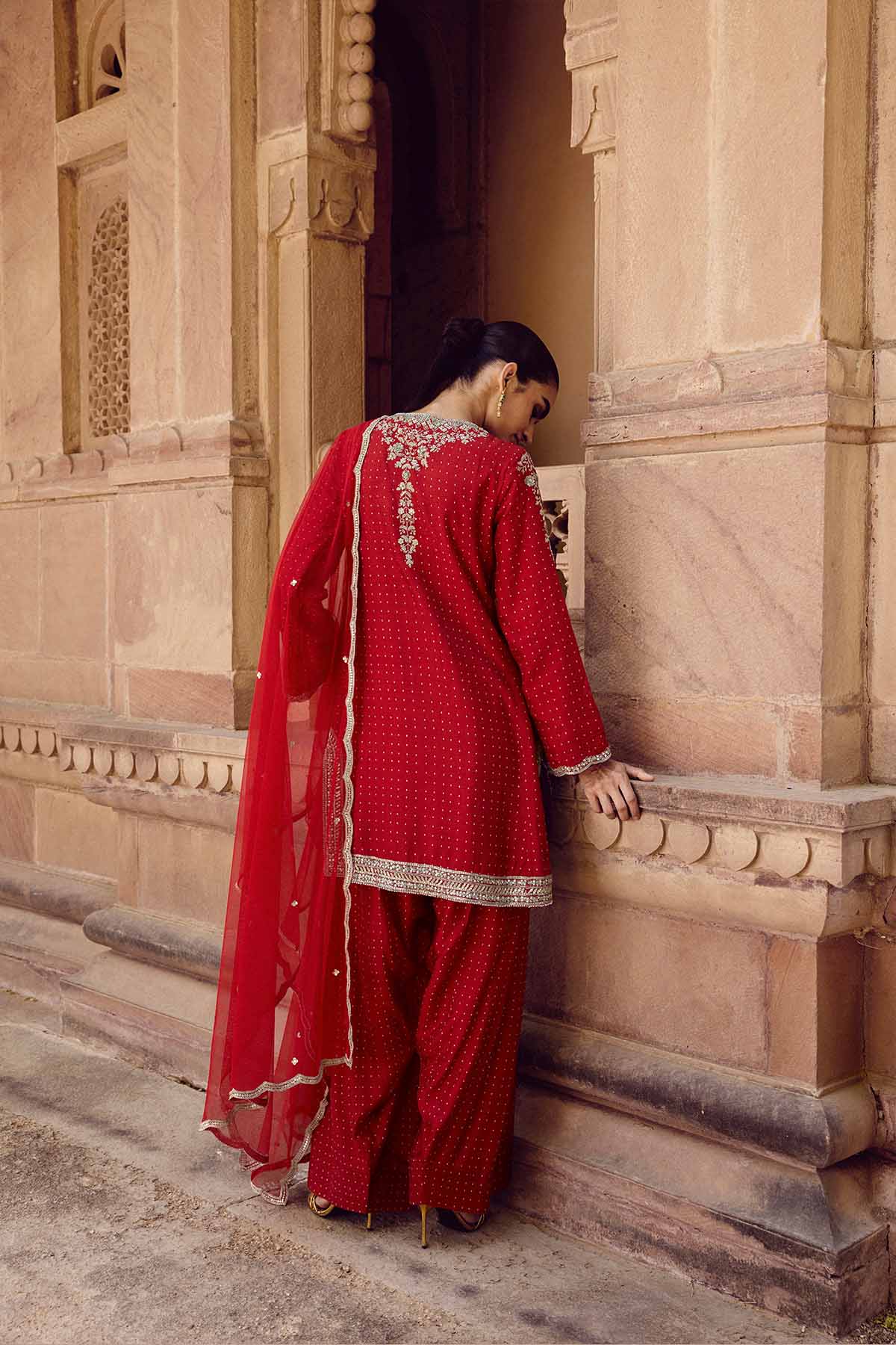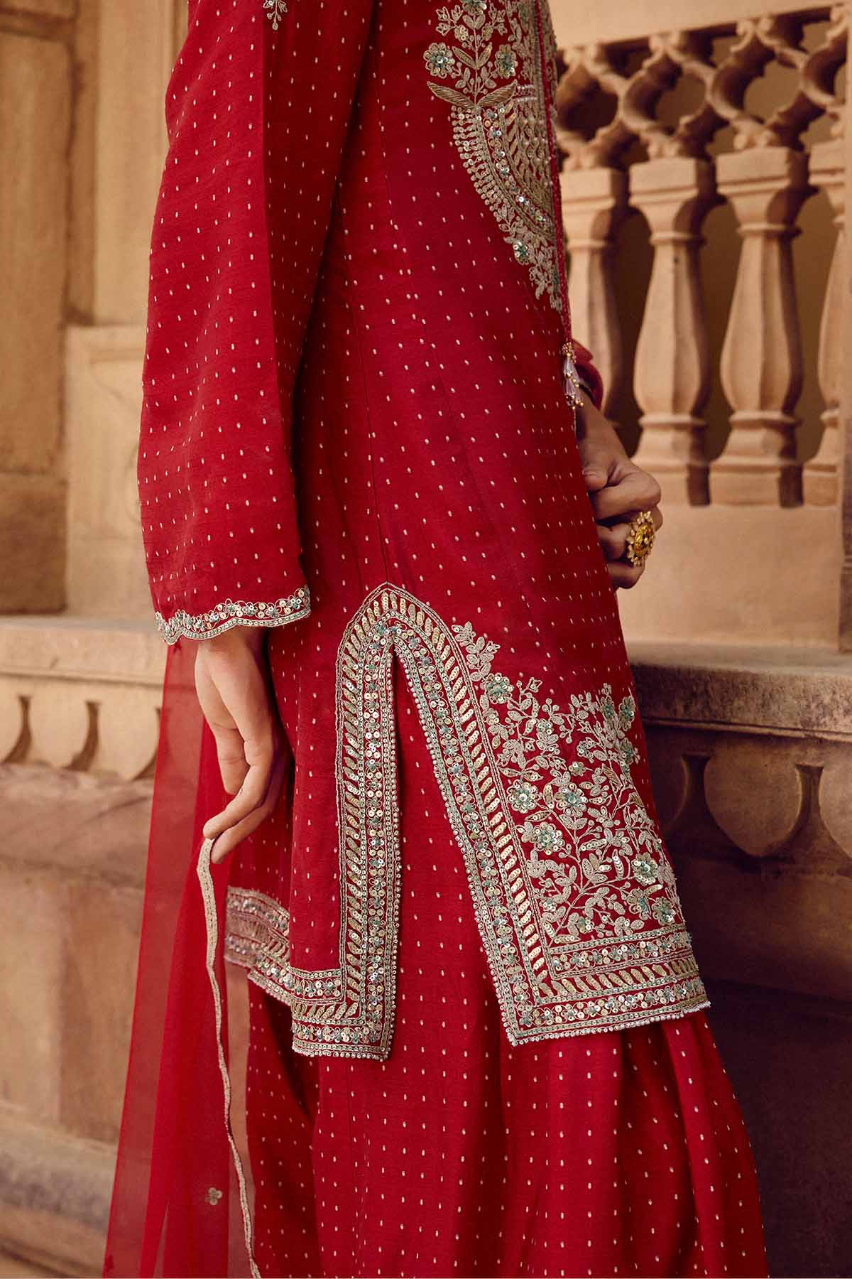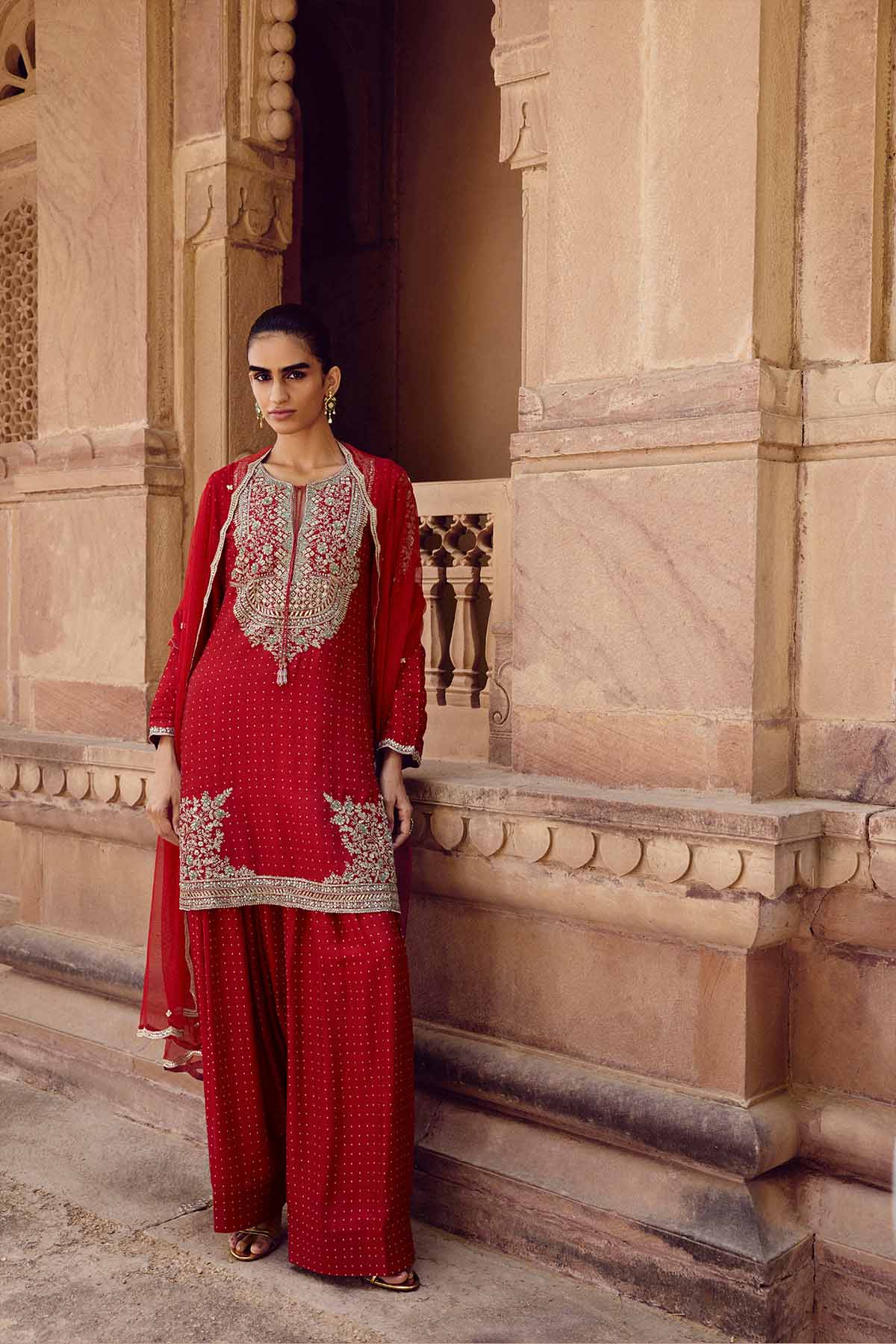 Crafted in a striking red hue, our Sindhura Short Kurta Set features palatial motifs of blooms & ferns. Designed in luxurious silk, it features cord embroidery, French knots, beads & sequins.