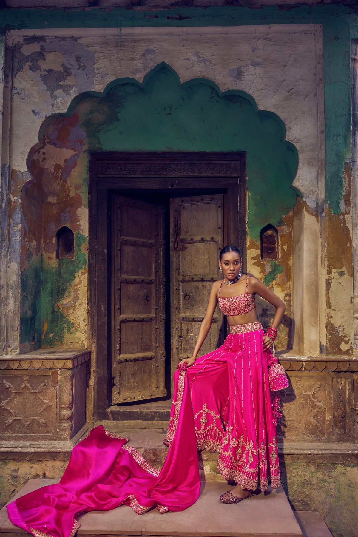 Evoke the timeless charm of an era gone by, with our gulabi gulaal kumari sharara set. The ghumer jaal dupatta, inspired by mughal architecture, and adorned with gota, marodi and dabka is the star of the show. Paired with a classic fitted silk banarasi v-neck kurta and elegant gharara pants, it's an ode to age-old techniques and a touch of royal nostalgia.