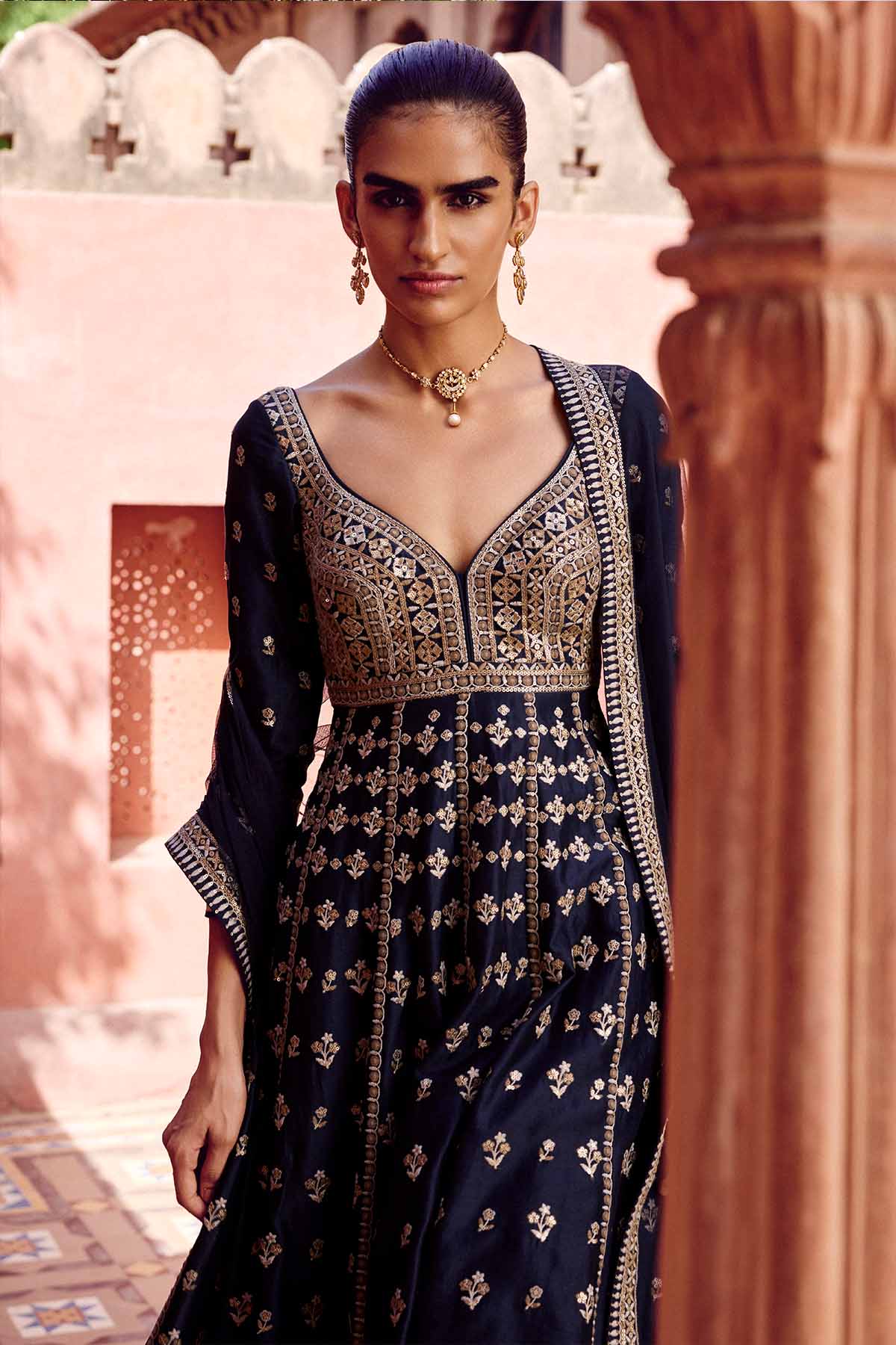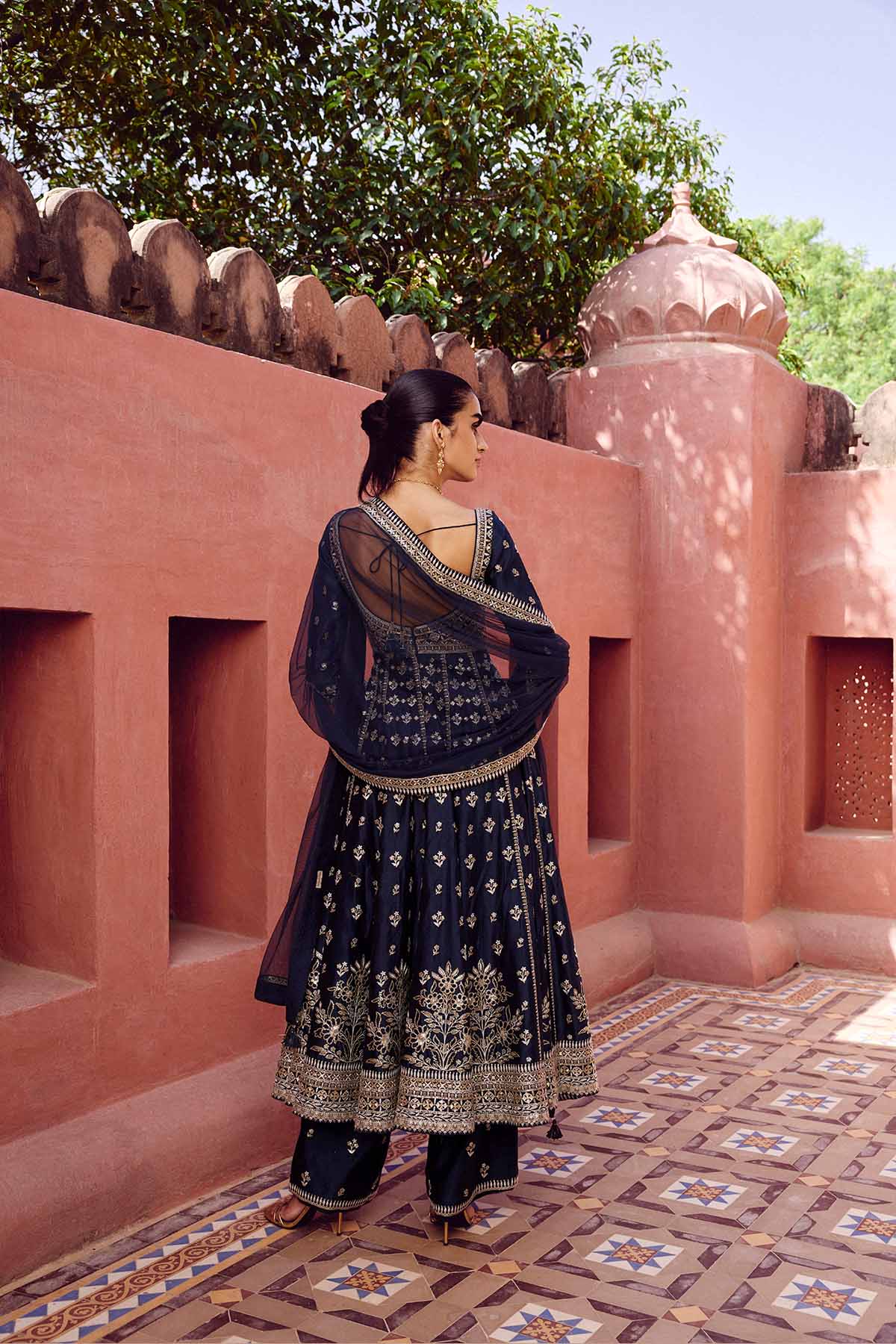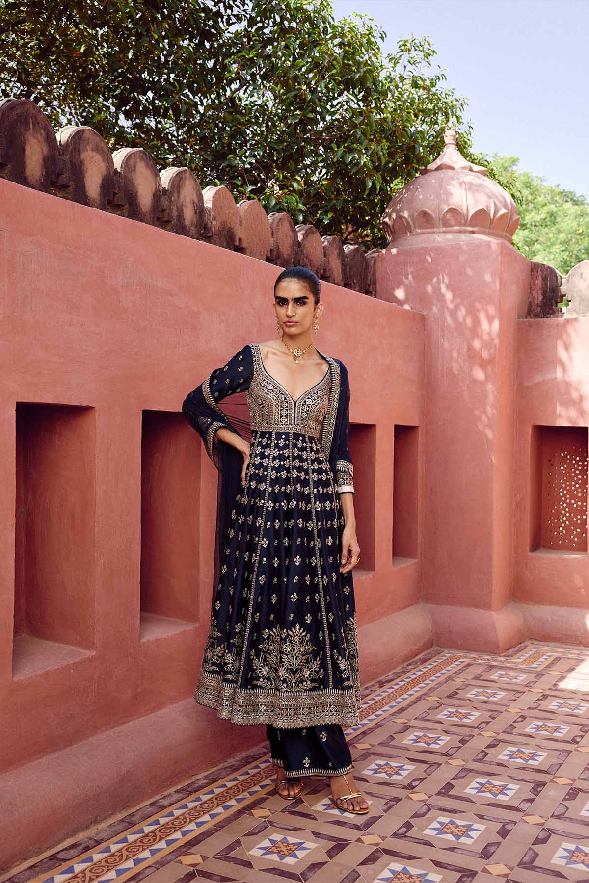 Bringing to life blooming florals of nature on a timeless anarkali silhouette, triyama is crafted for the modern woman. Designed in luxurious silk, this ensemble features zari, threadwork & sequins..