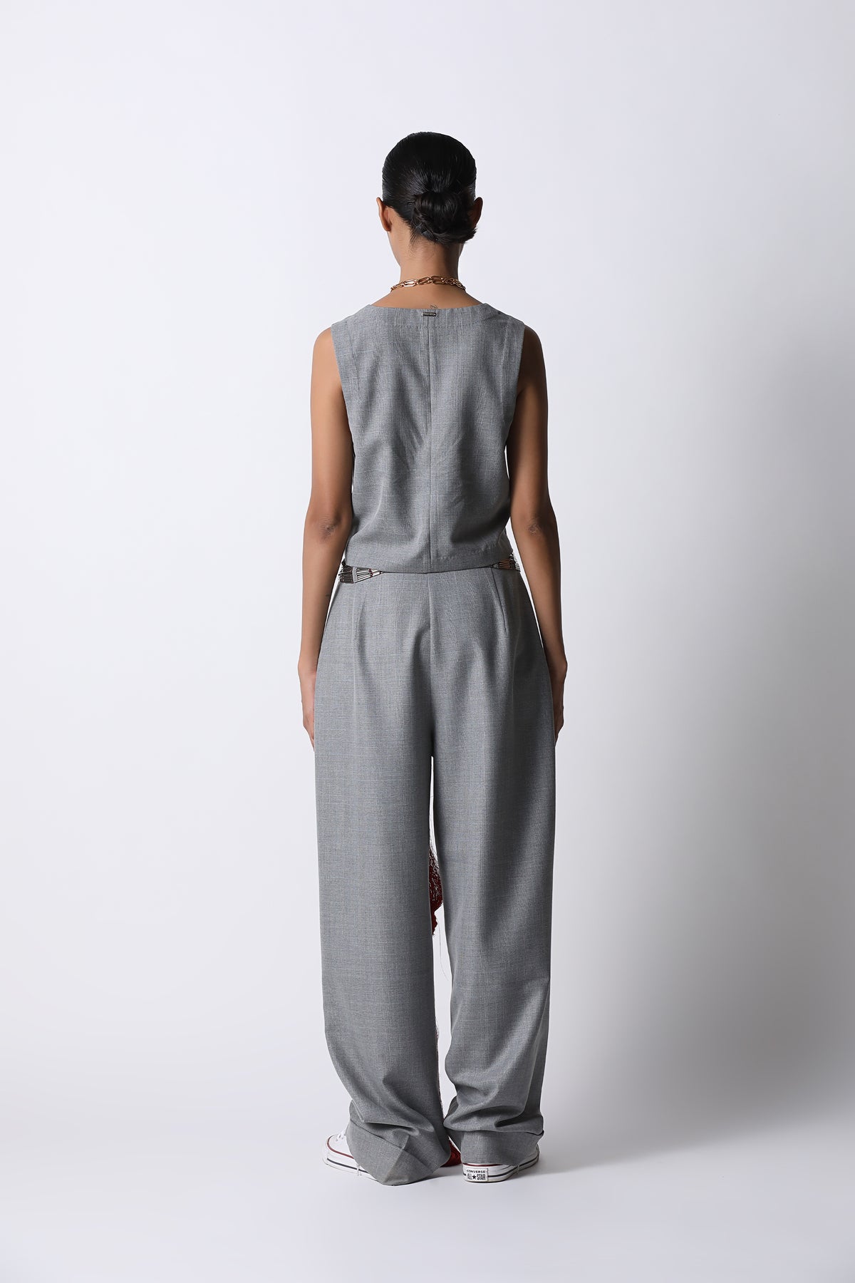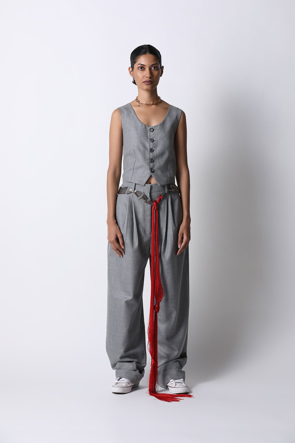 Playing with our love for suiting this season, the tux pant is a baggy fit with front pleats, side pockets and a front zip. Pair this with a ganji or complete the look by pairing it with our oversized blazers. Seen here with the alex waistcoat, the alex blazer and the staple belt with fringe