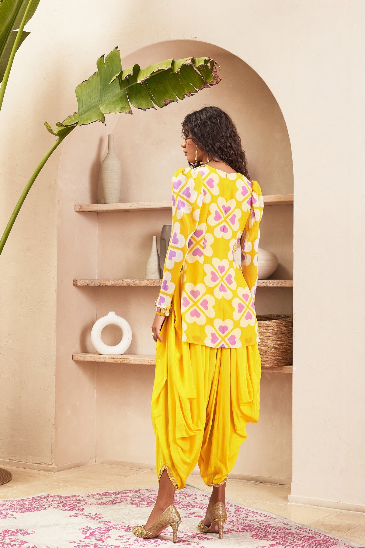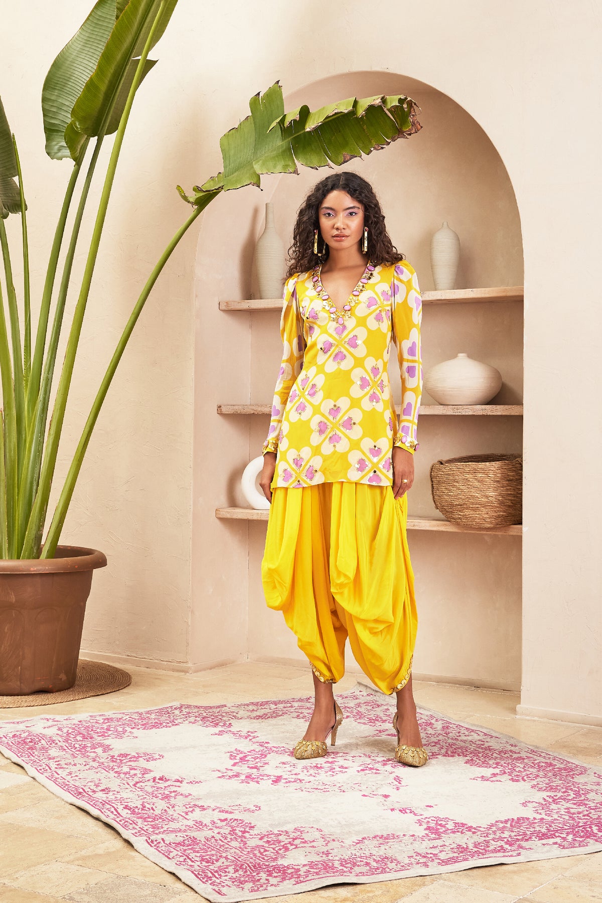 Make a bold entrance in our high slit kurta with dramatic sleeves, a perfect fusion of contemporary flair and traditional charm. The chunky embroidery around the neckline adds a touch of opulence, while the highlight embroidery on the front panel enhances the tunic's overall allure. The classic dhoti takes a stylish twist with intricate embroidery around its hem, creating a seamless blend of modern aesthetics and timeless elegance. Elevate your fashion statement with this ensemble, designed for those who embrace sophistication with a hint of drama.