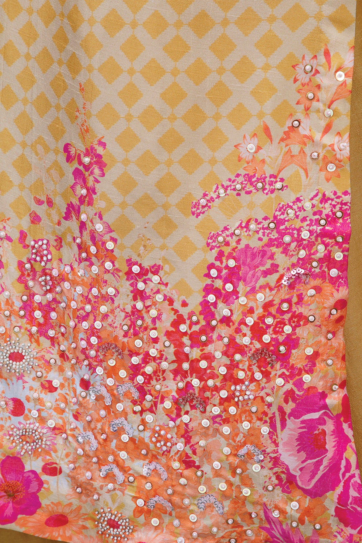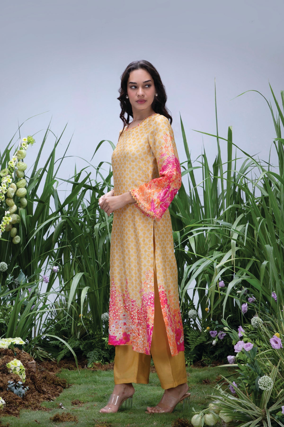 The kurta set has our signature print on natural bemberg silk with delicate sequence hand embroidery with bell sleeves and loops neck line , it is paired with silk trousers