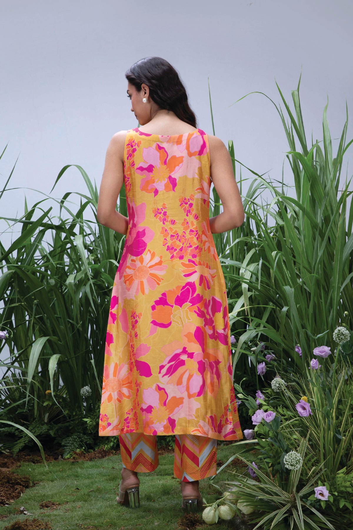 The lupine kurta set has our signature print on natural bemberg silk with delicate sequence hand embroidery , it is paired with silk trousers